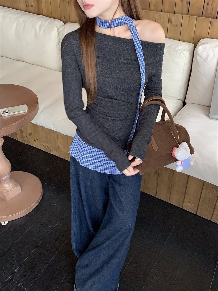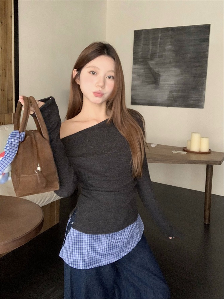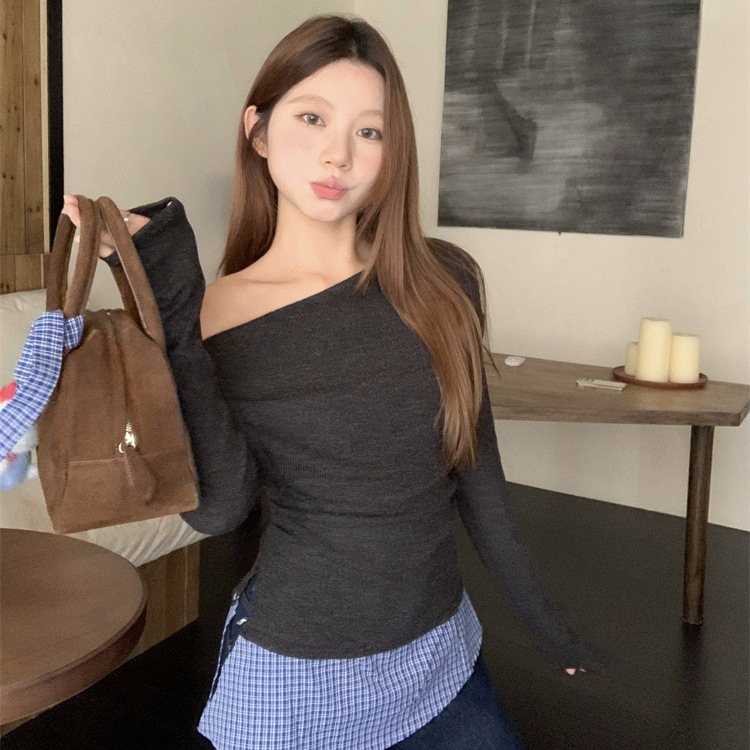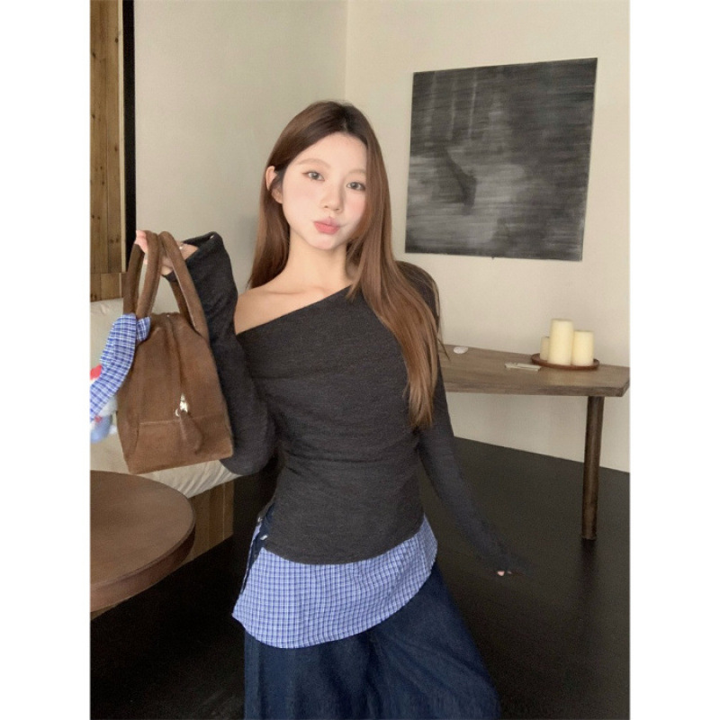 MILLAIDI 프랑스 비스듬한 어깨 스티칭 긴팔 티셔츠 2024 가을 새로운 슬림 베이스 셔츠 탑스토어 가기