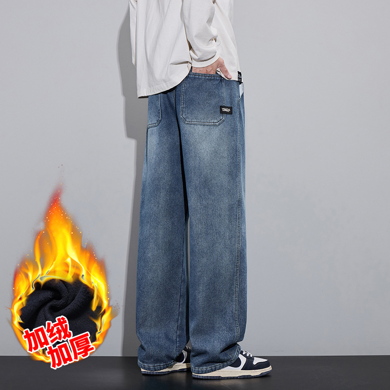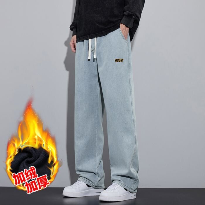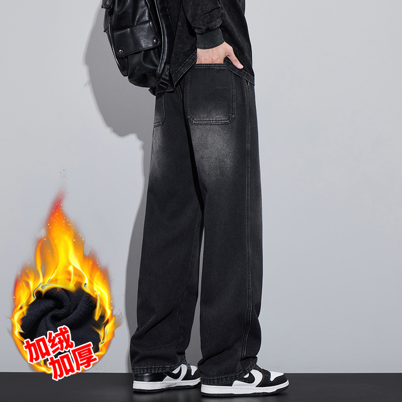 加绒一体绒牛仔裤秋冬男款2024新款阔腿直筒黑色百搭男生休闲长裤
