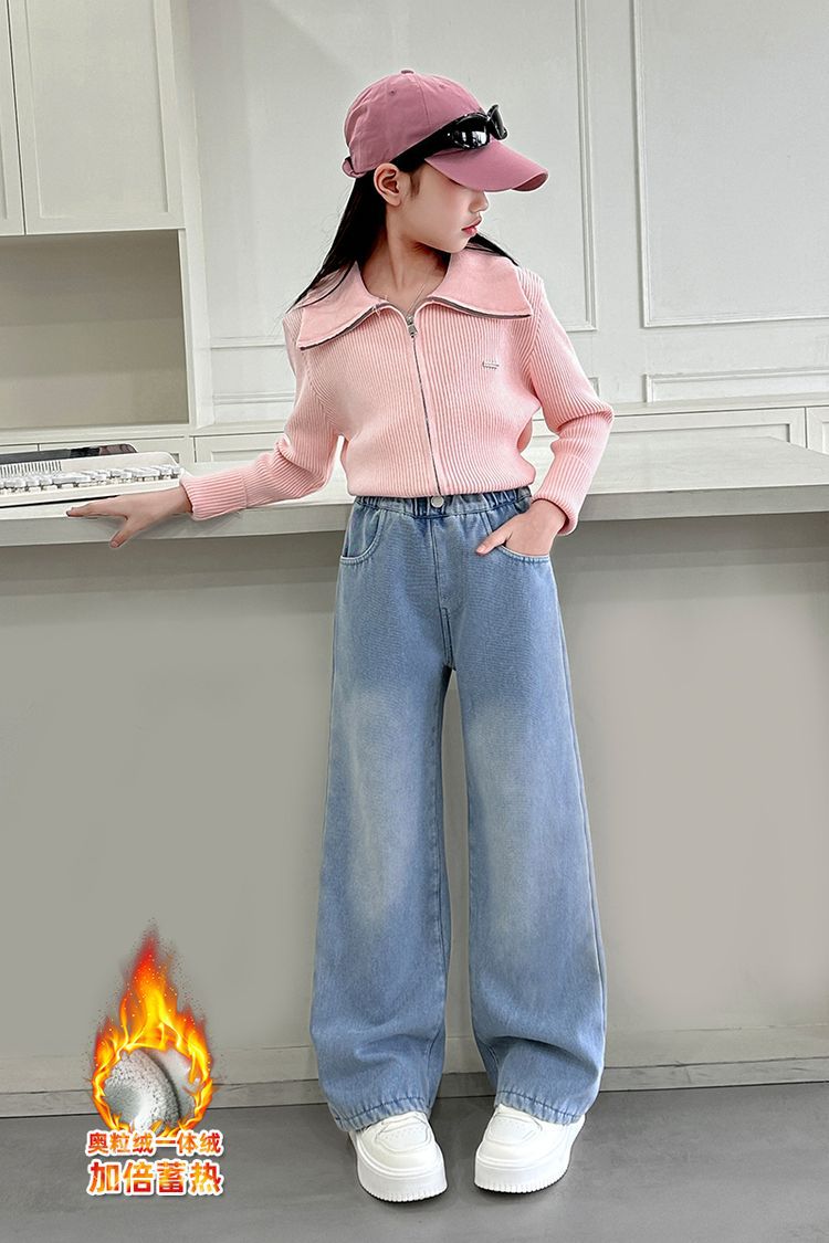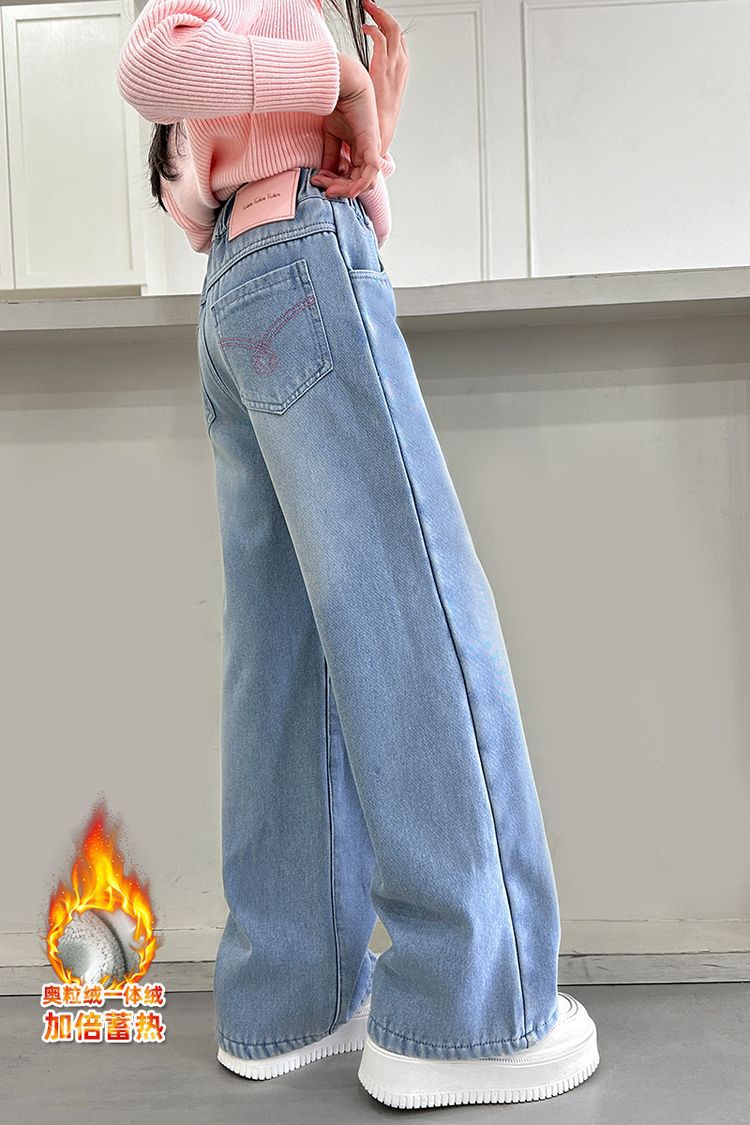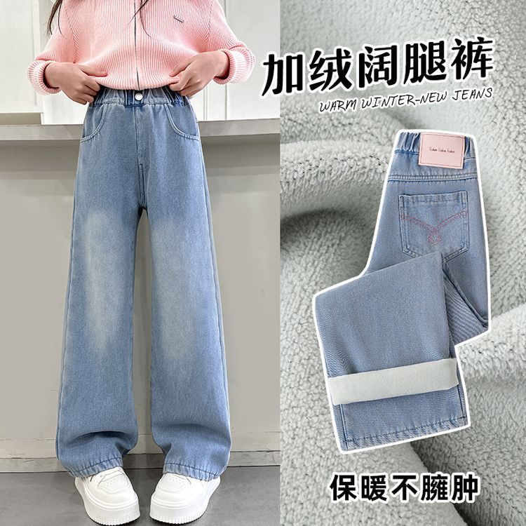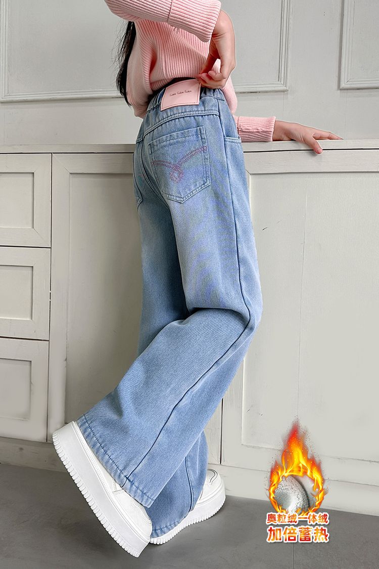 소녀 기모 바지 2024 가을/겨울 새로운 중대형 어린이 넓은 다리 두꺼운 캐주얼 올 매치 따뜻한 청바지