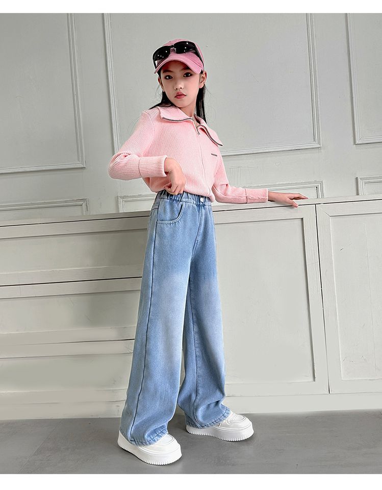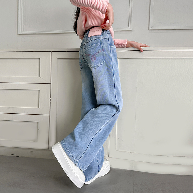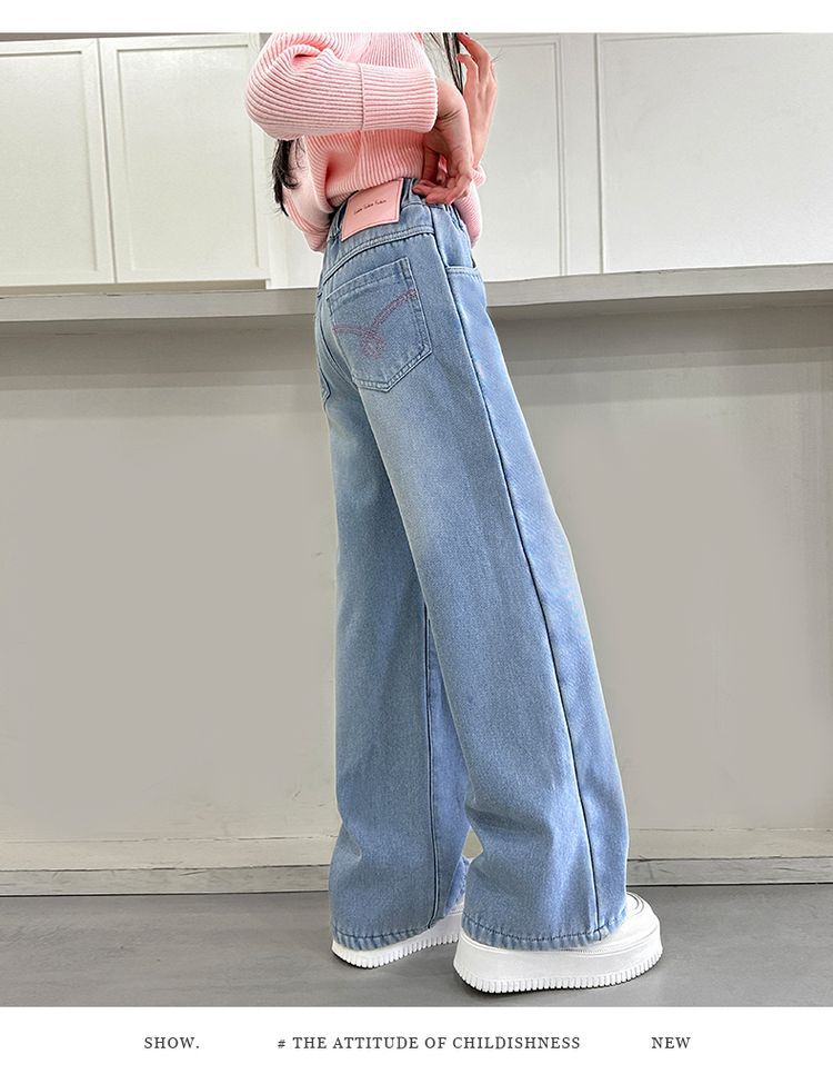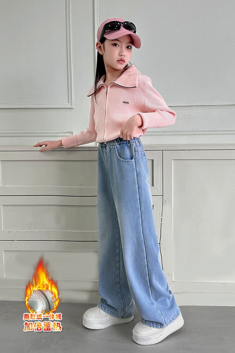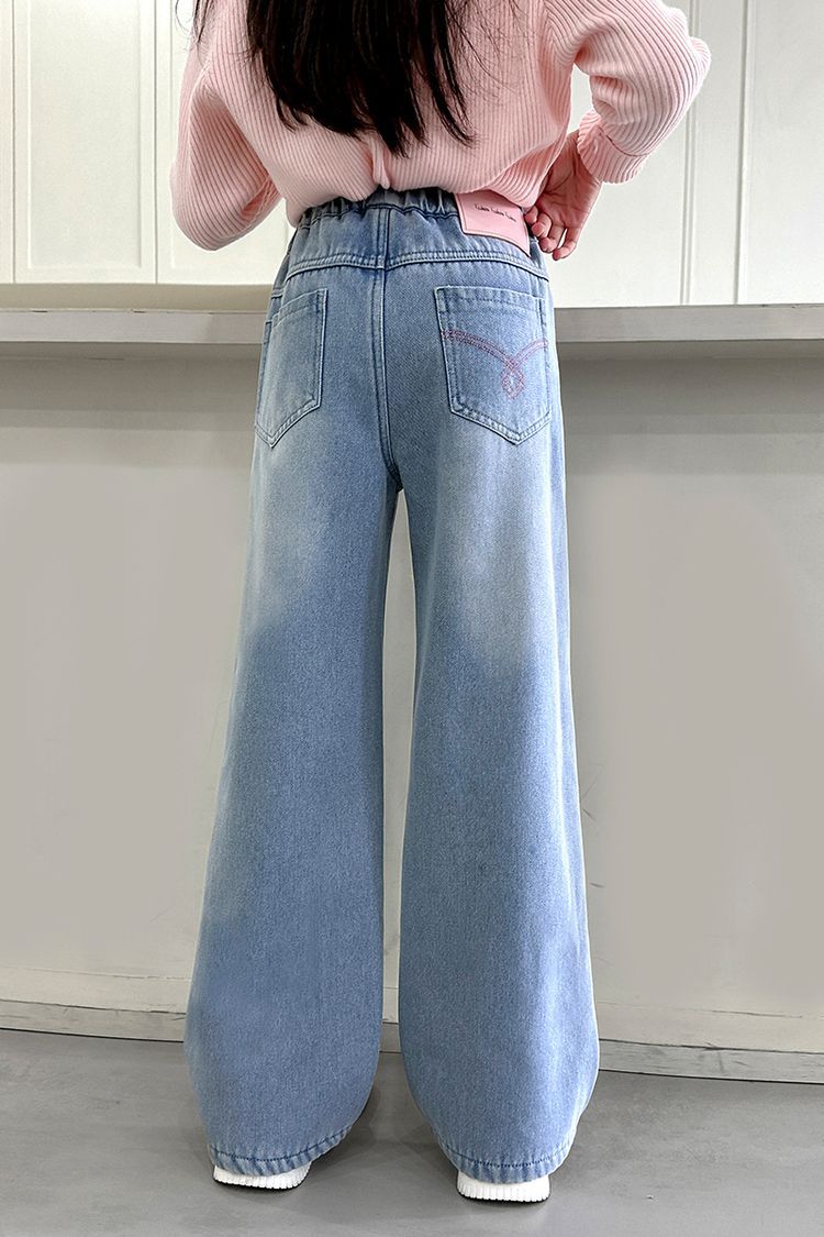 소녀 기모 바지 2024 가을/겨울 새로운 중대형 어린이 넓은 다리 두꺼운 캐주얼 올 매치 따뜻한 청바지