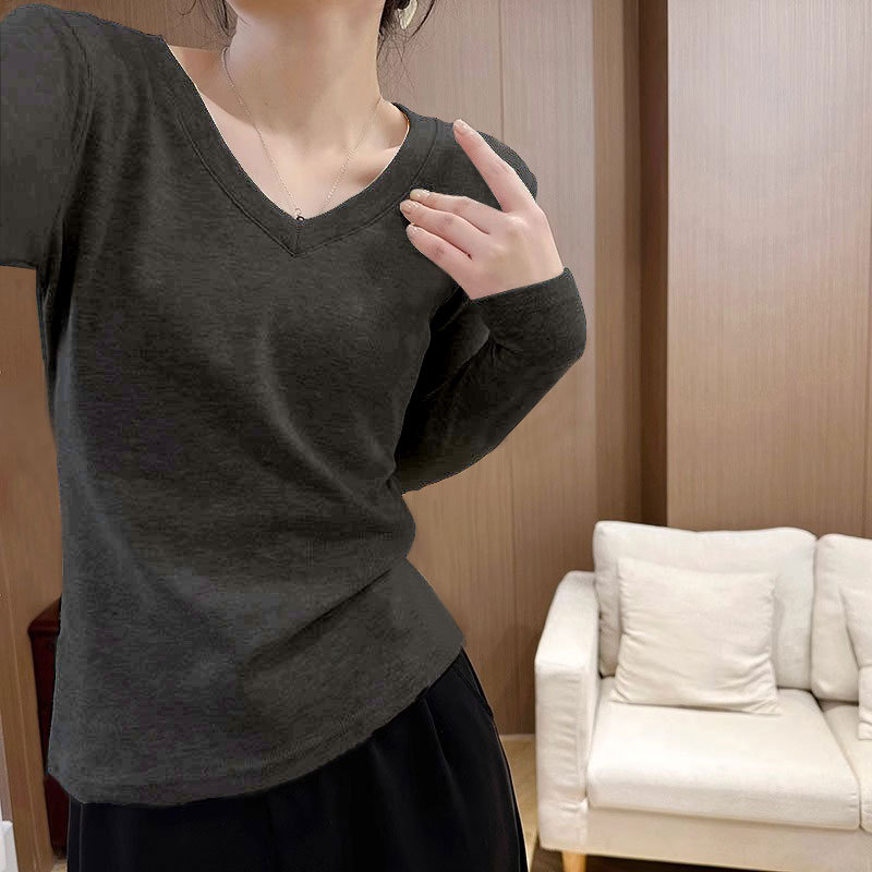 가을 겨울 여성용 슬림핏 셔츠, 슬림 핫걸 긴팔 티셔츠, 브이넥 이너웨어, 순수한 욕망 니치 솔리드 컬러 독일 벨벳 탑 트렌디스토어 가기
