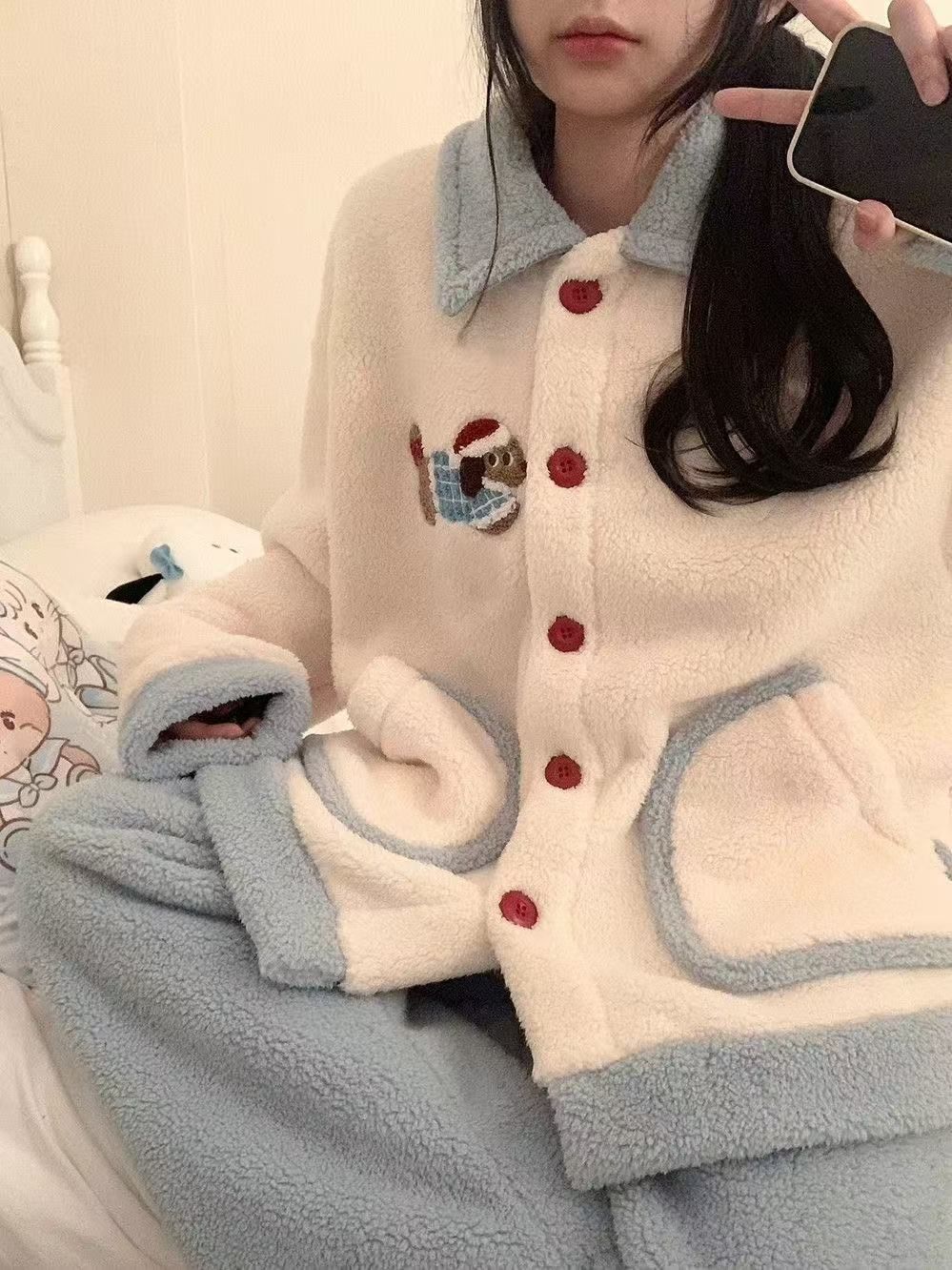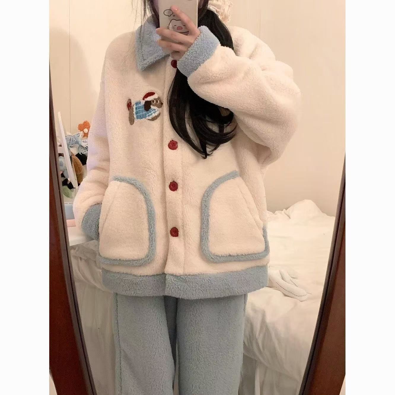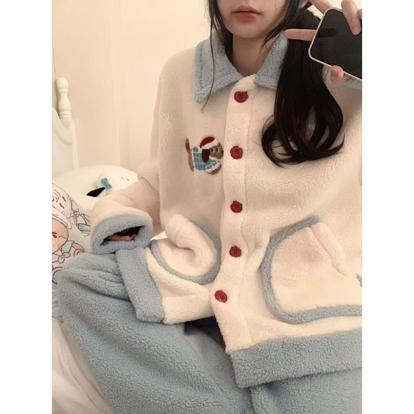 2024 겨울 만화 귀여운 닥스 훈트 산호 양털 잠옷 여성의 새로운 달콤한 소녀의 기모 두꺼운 홈 옷스토어 가기