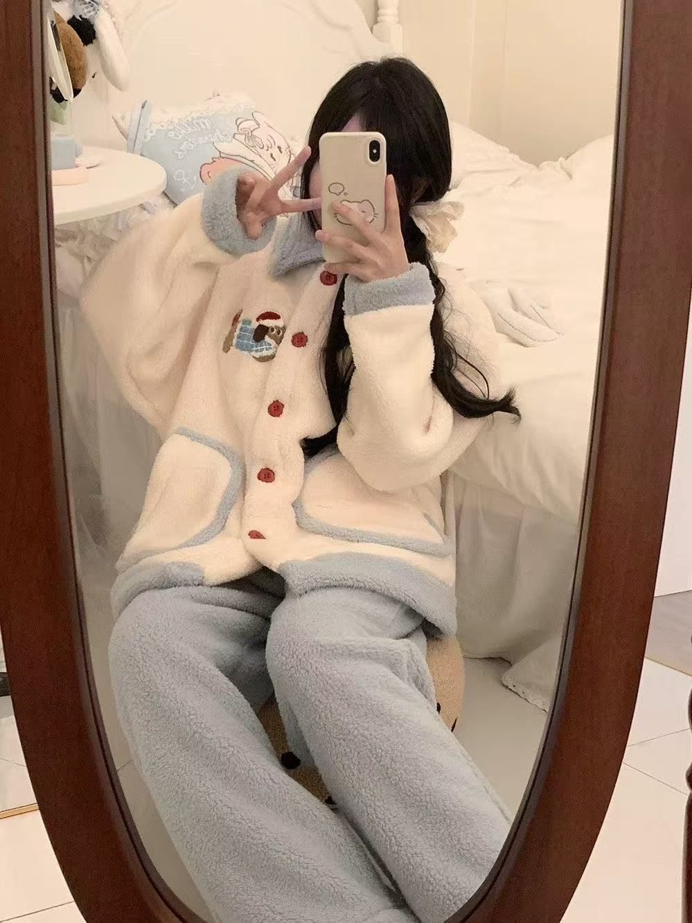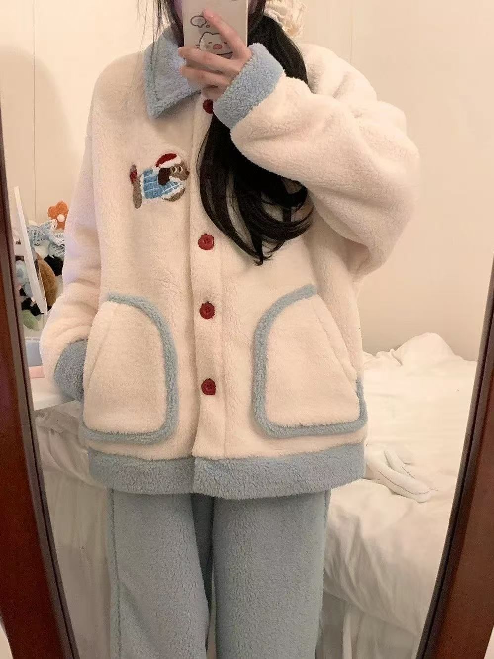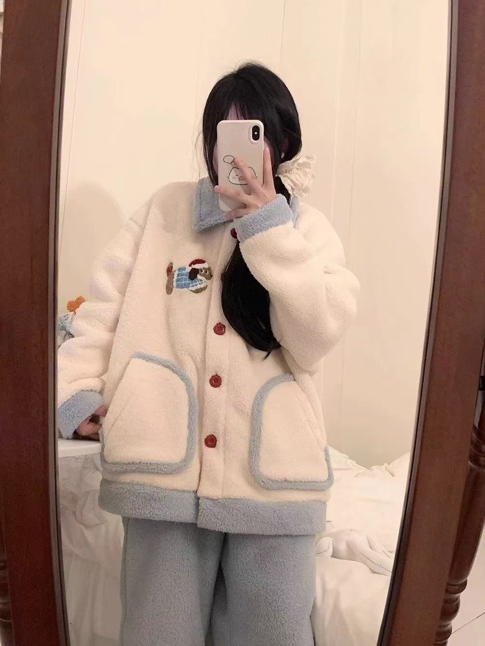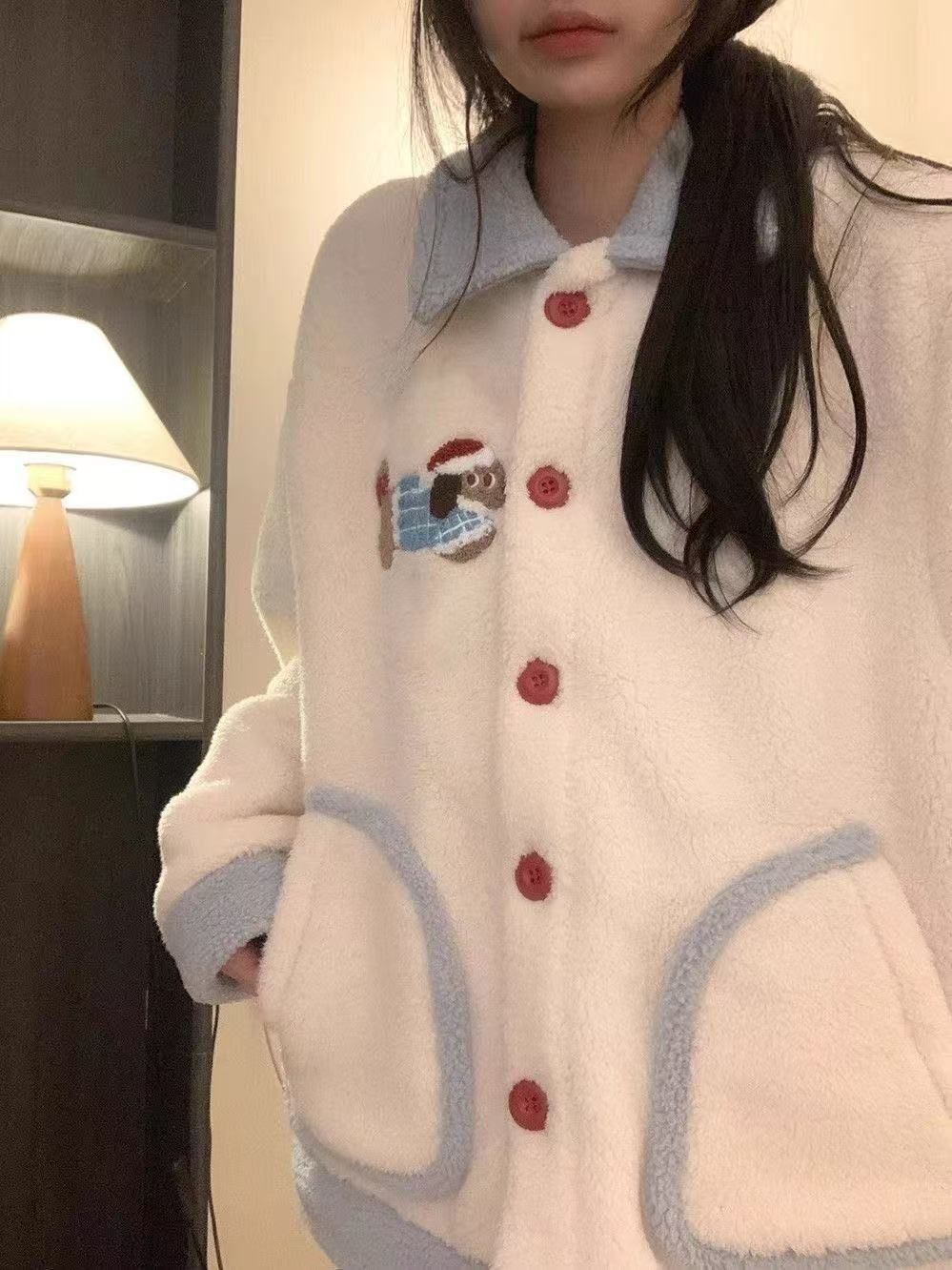 2024 겨울 만화 귀여운 닥스 훈트 산호 양털 잠옷 여성의 새로운 달콤한 소녀의 기모 두꺼운 홈 옷스토어 가기
