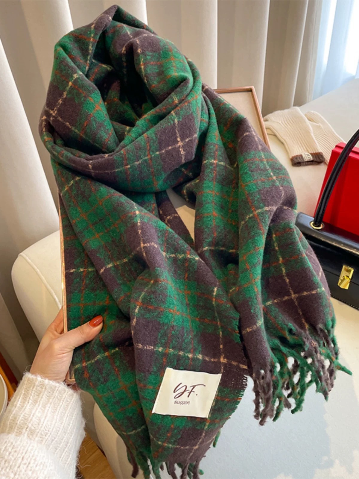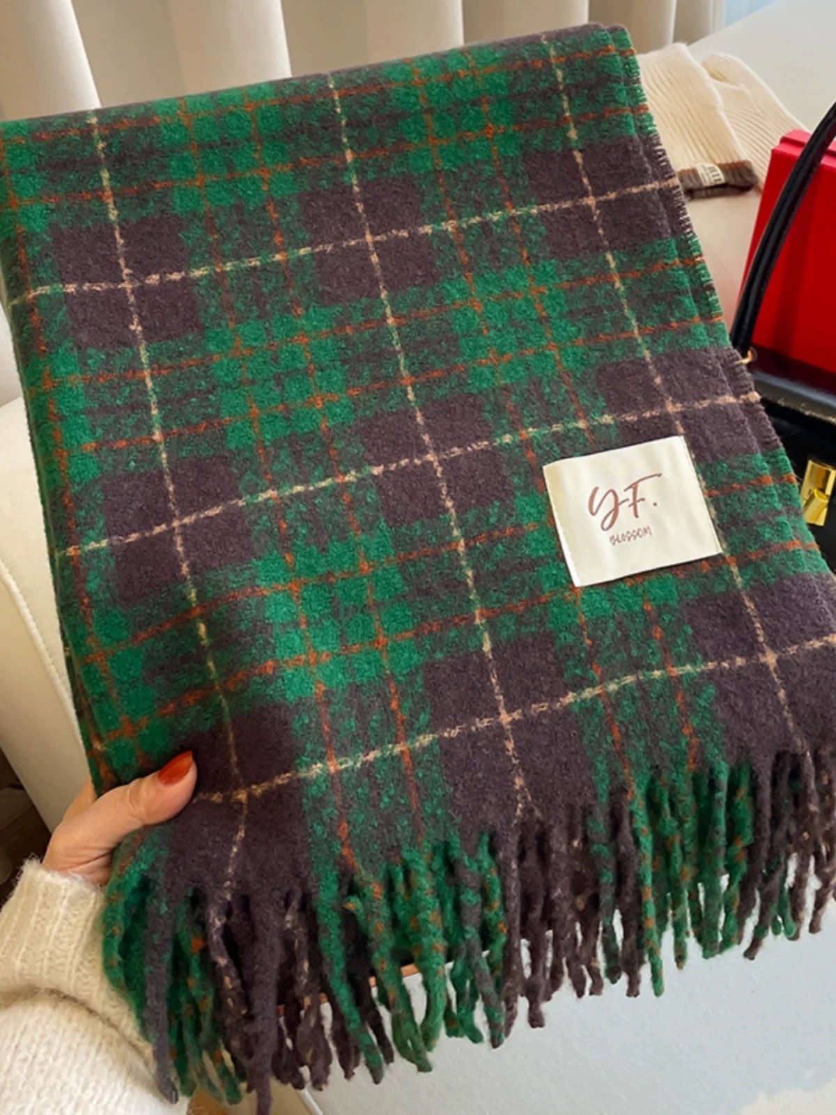 고급 버건디 복고풍 격자 술 스카프 여성 한국식 가을과 겨울 따뜻한 분위기 부드러운 왁스 목도리 스카프