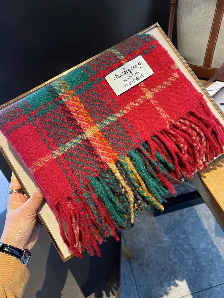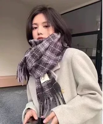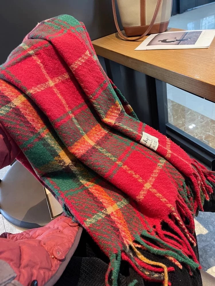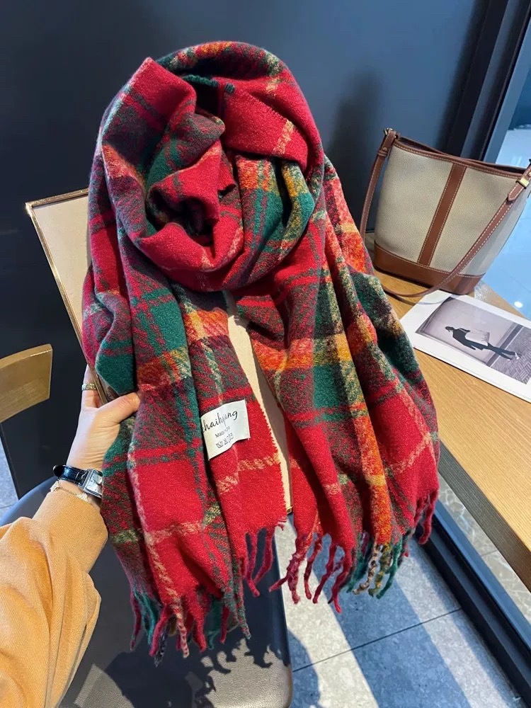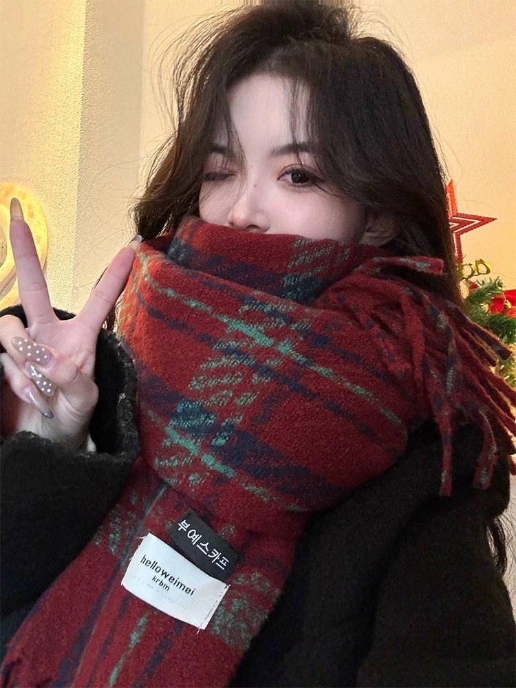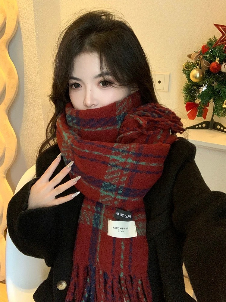 고급 버건디 복고풍 격자 술 스카프 여성 한국식 가을과 겨울 따뜻한 분위기 부드러운 왁스 목도리 스카프스토어 가기