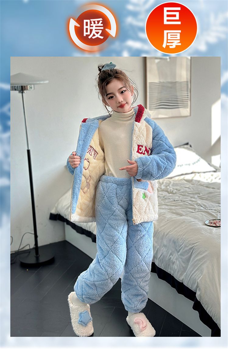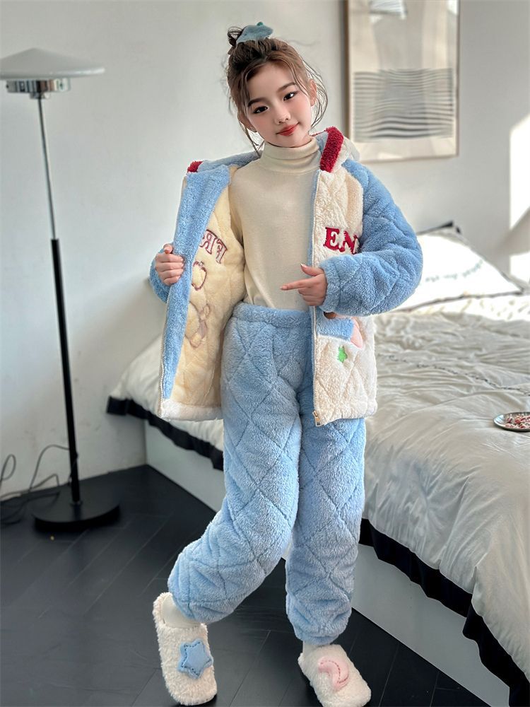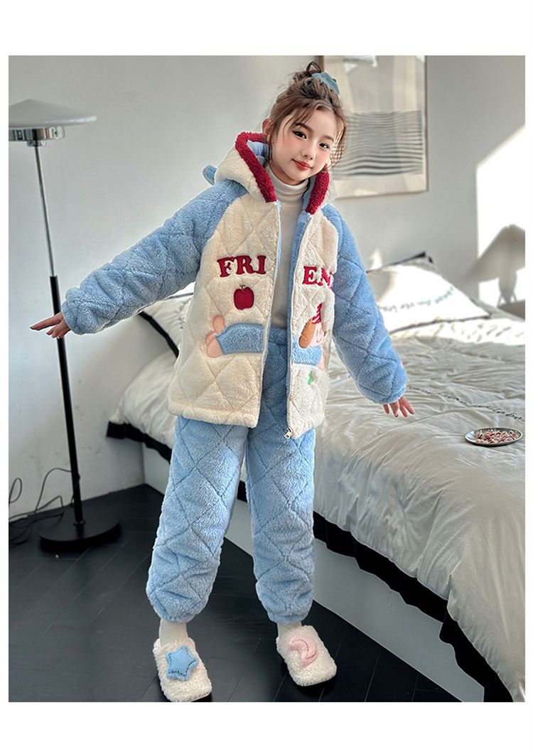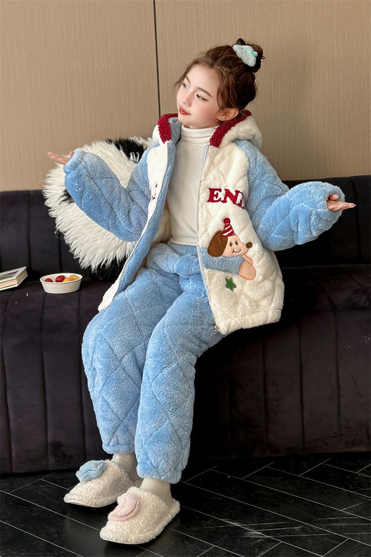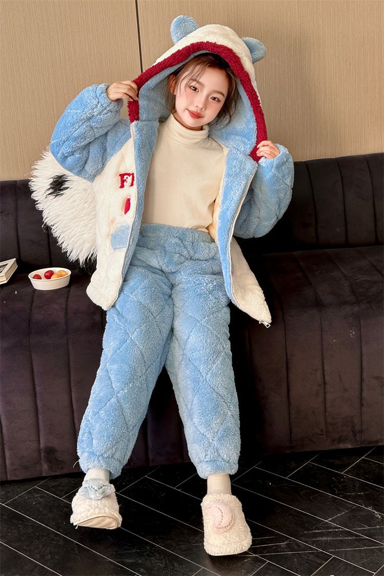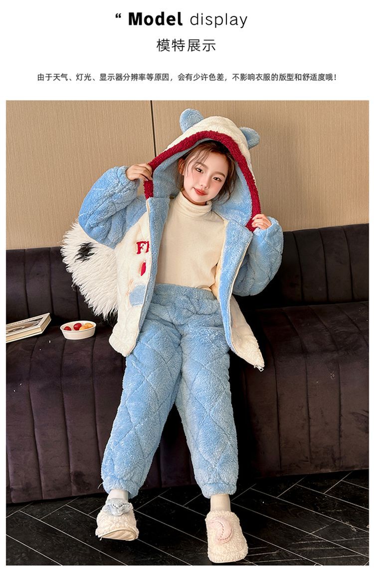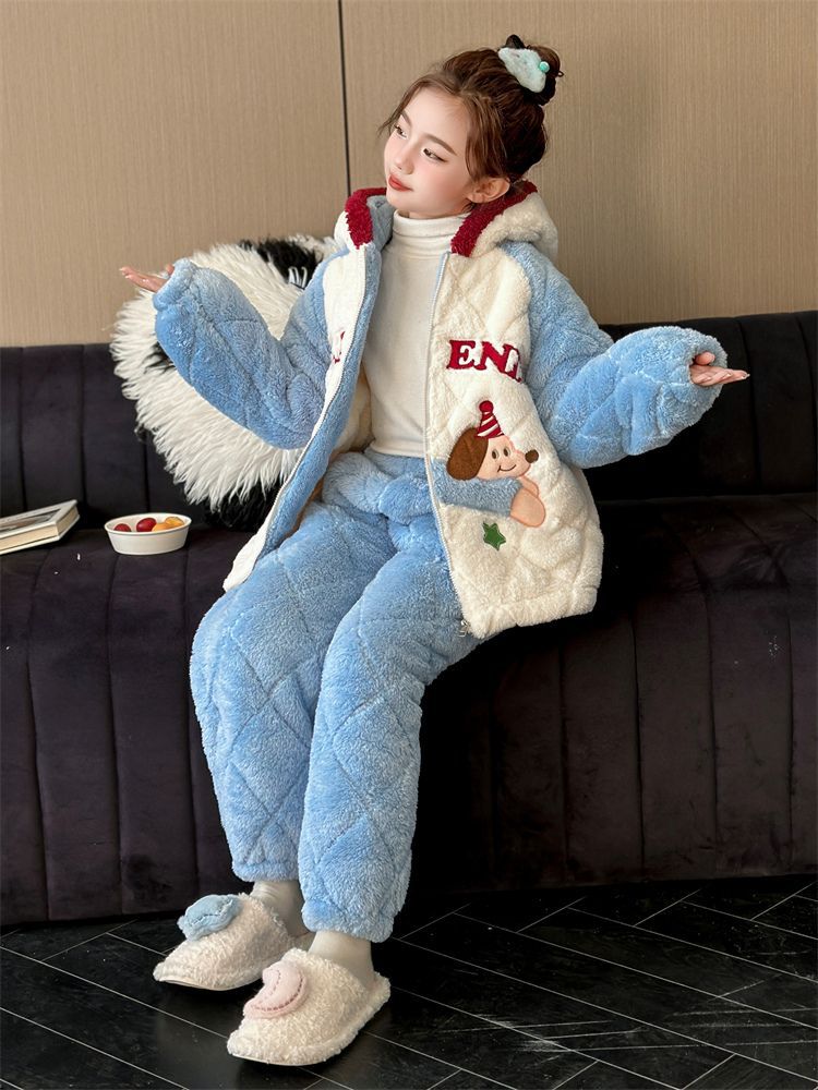 걸스 3 층 퀼트 파자마 세트 어린이 겨울 기모 두꺼운 따뜻한 외모가 후드 홈 옷을 입고스토어 가기