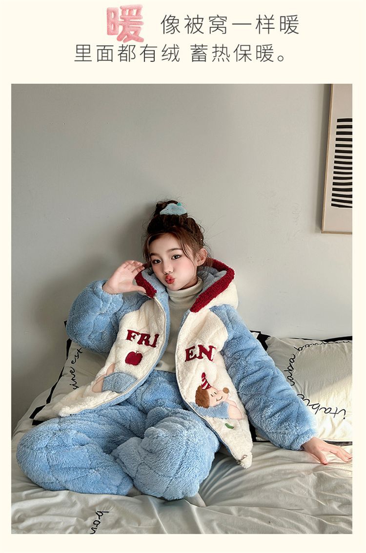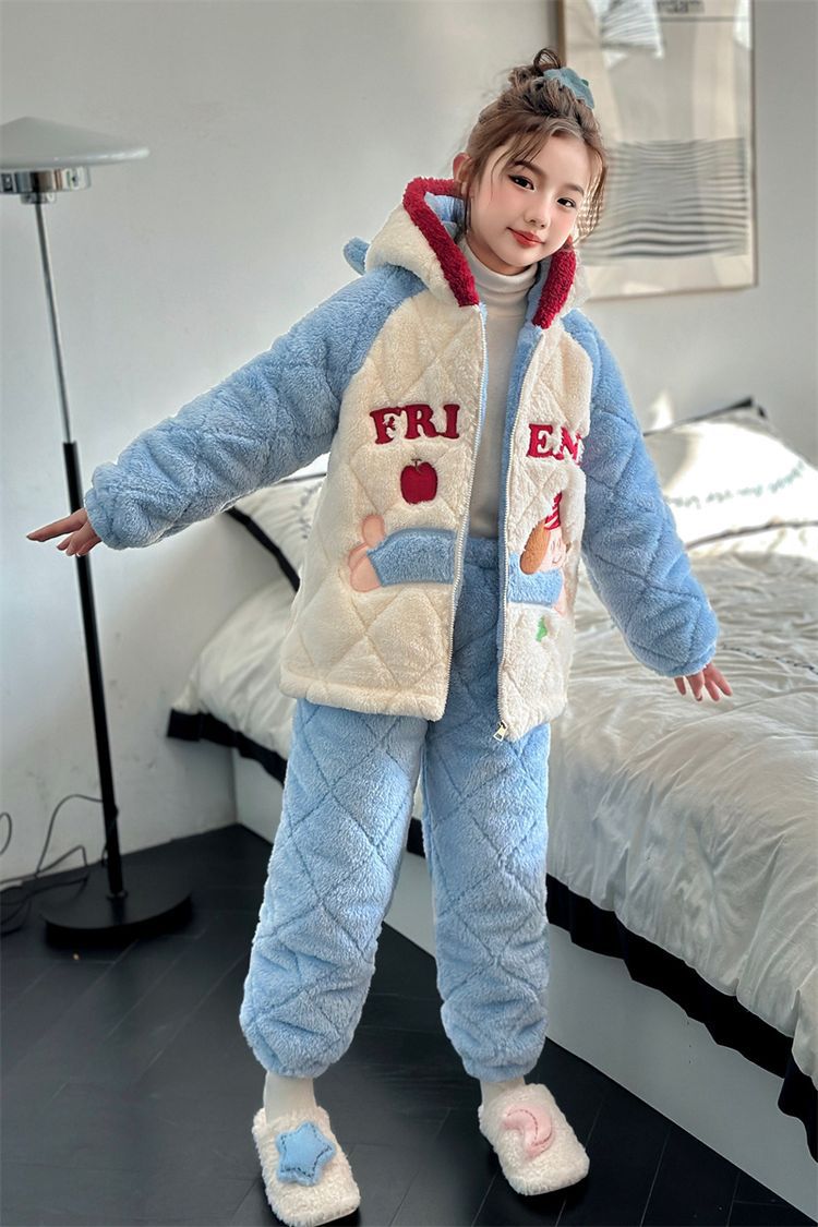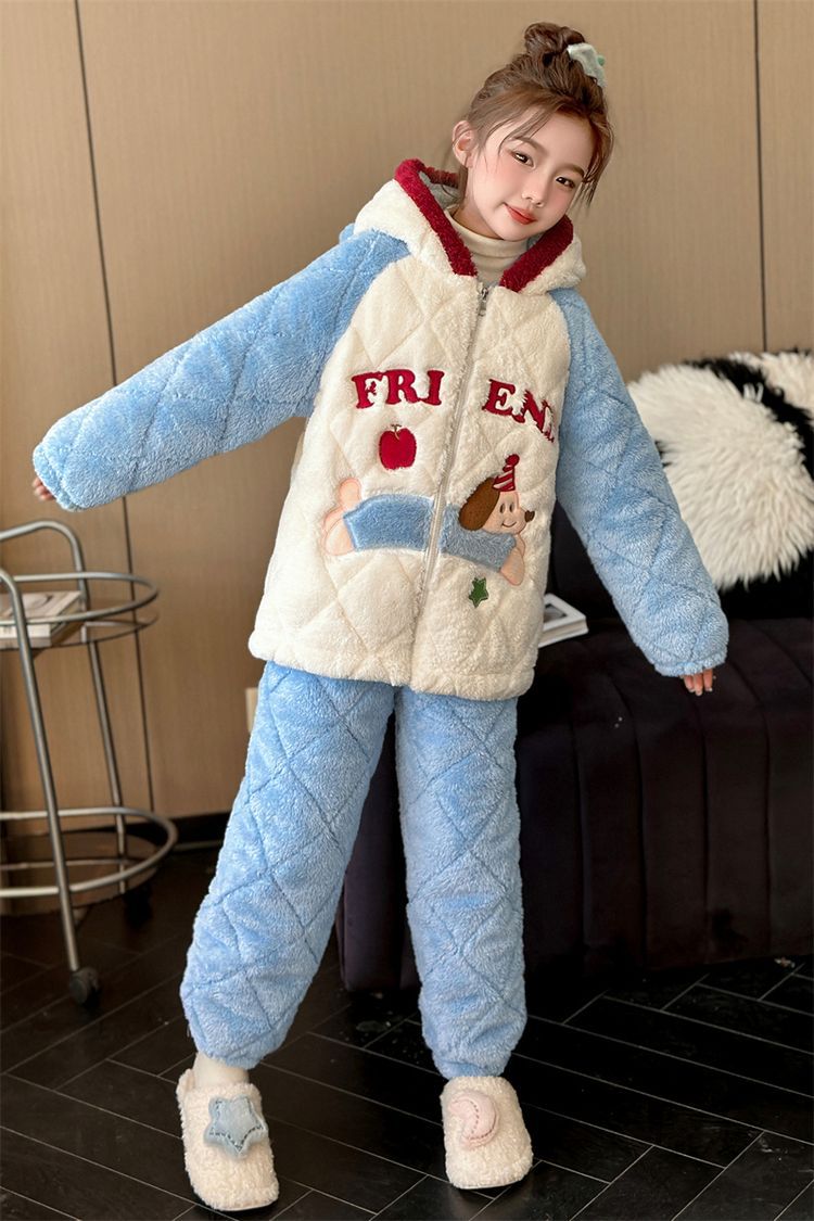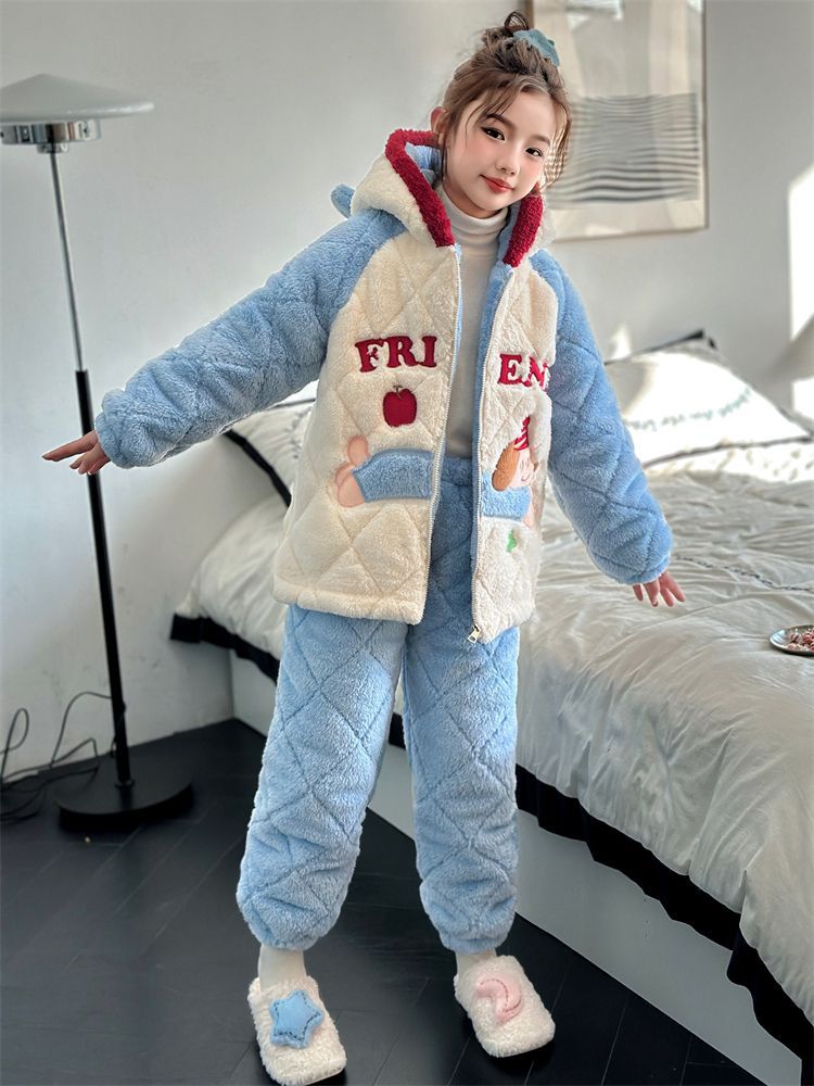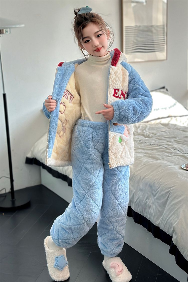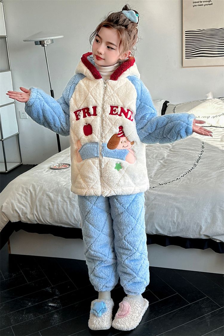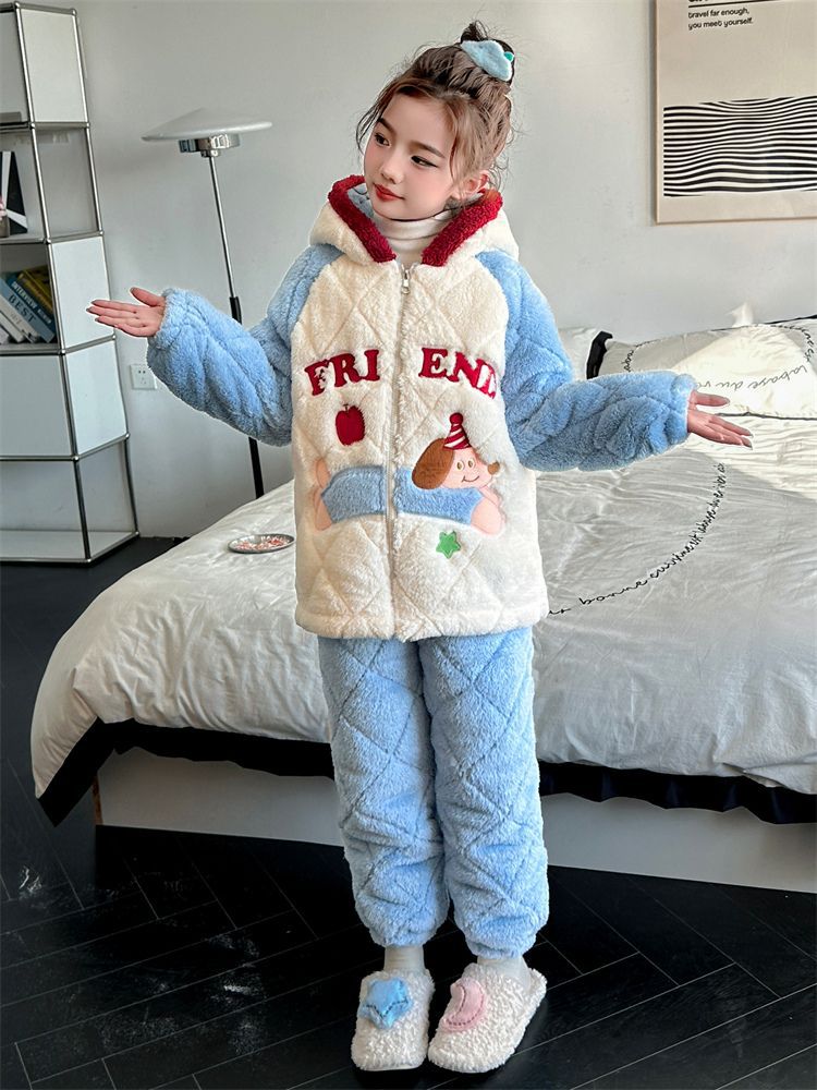 걸스 3 층 퀼트 파자마 세트 어린이 겨울 기모 두꺼운 따뜻한 외모가 후드 홈 옷을 입고스토어 가기