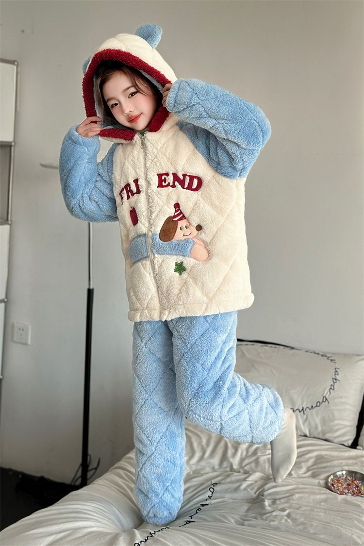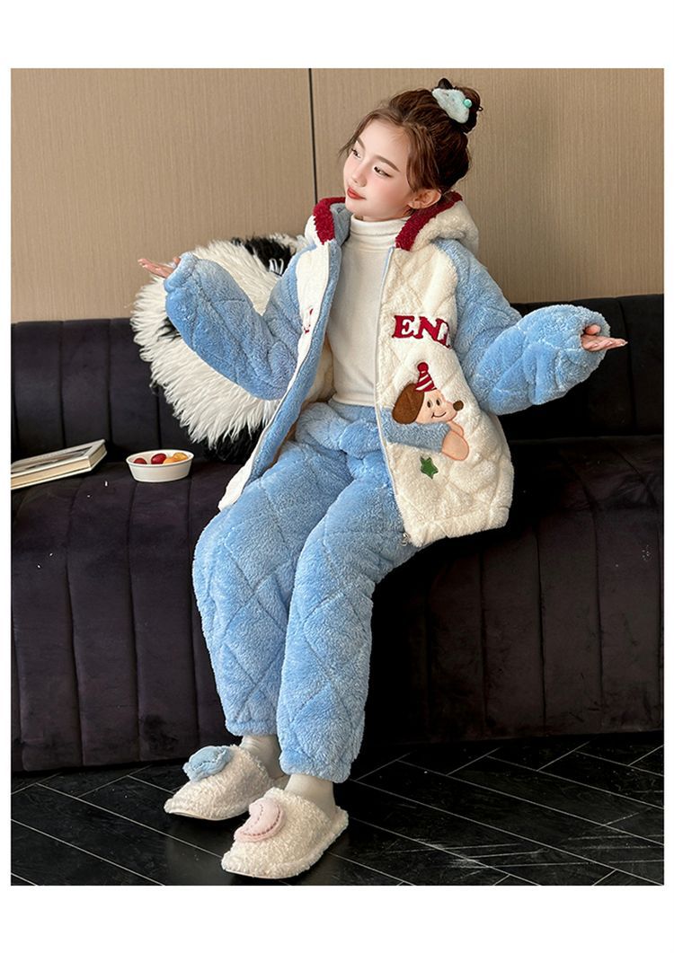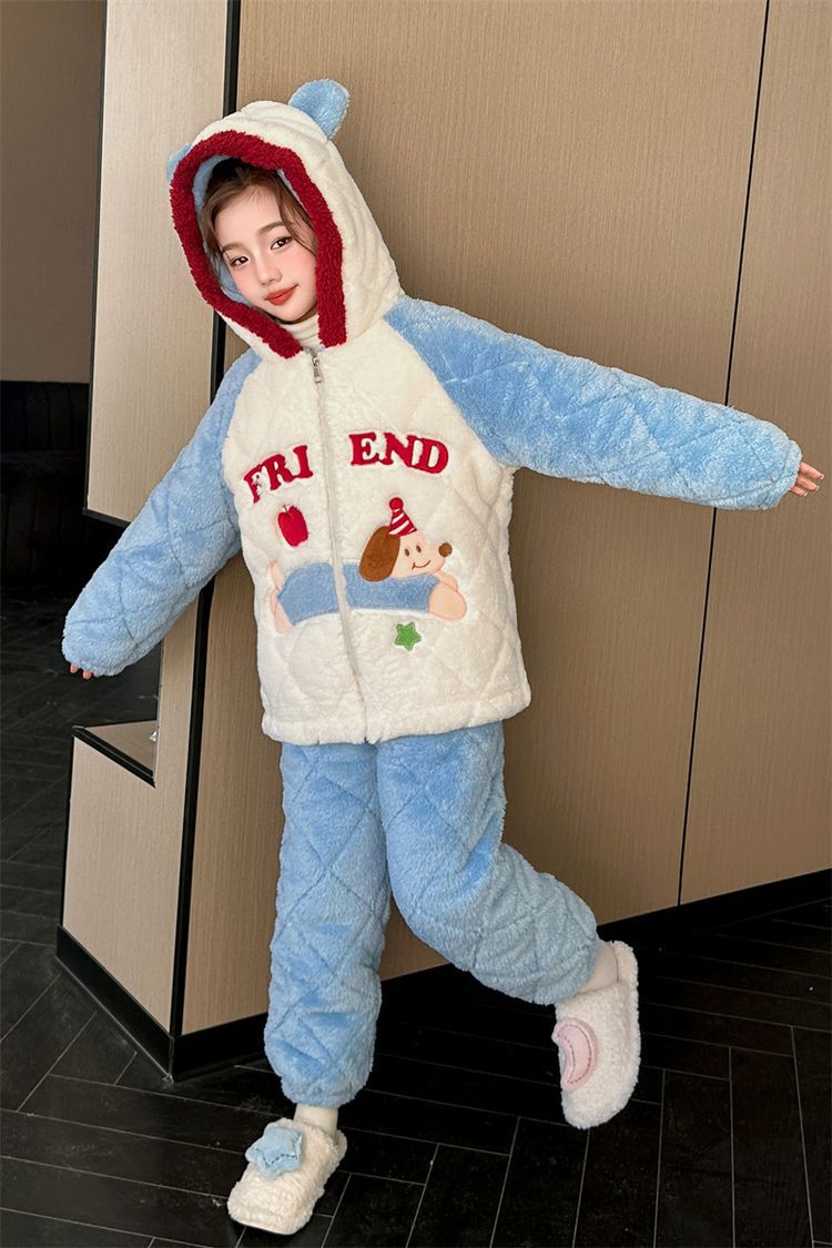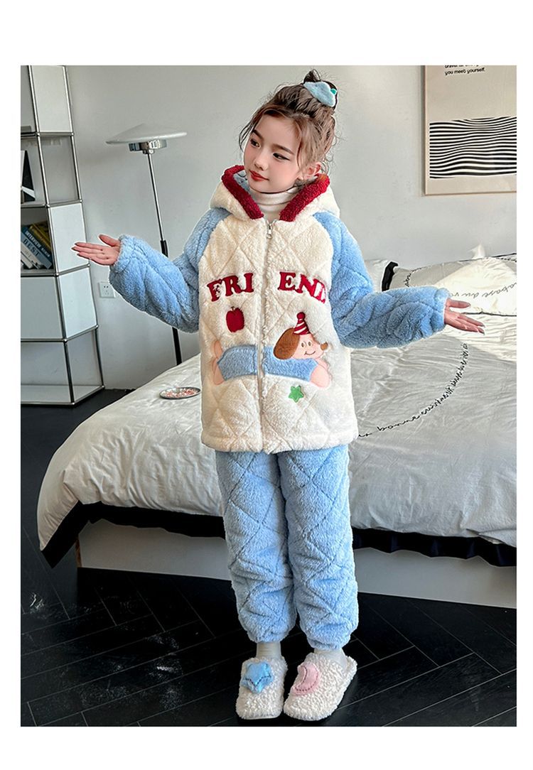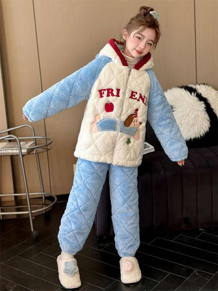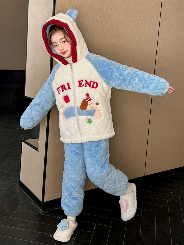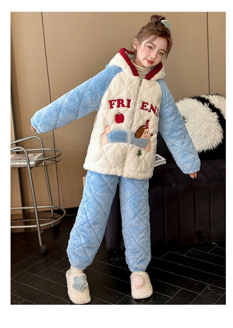 걸스 3 층 퀼트 파자마 세트 어린이 겨울 기모 두꺼운 따뜻한 외모가 후드 홈 옷을 입고스토어 가기