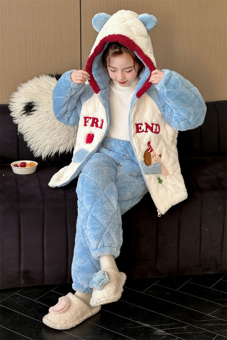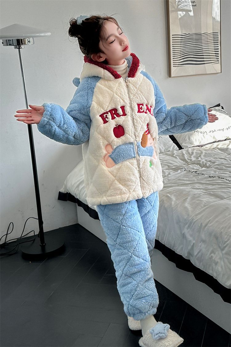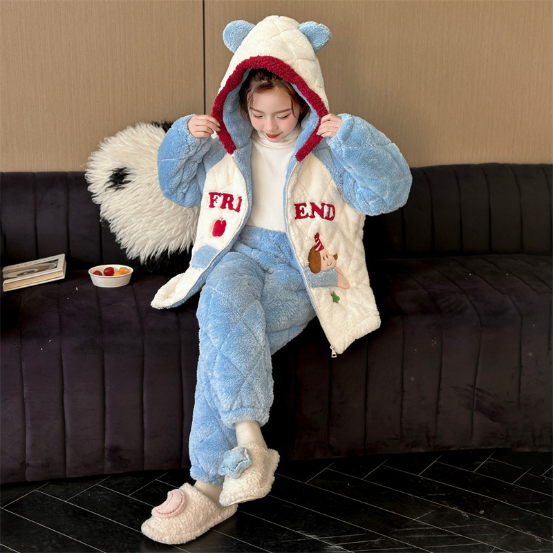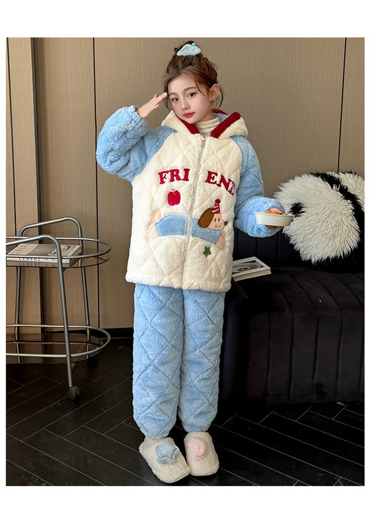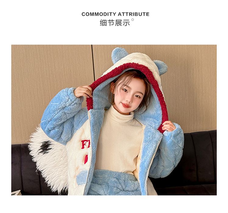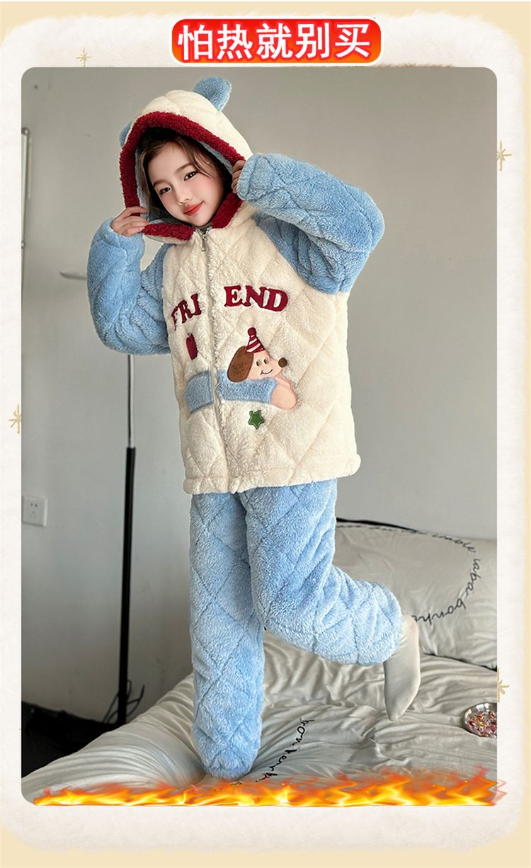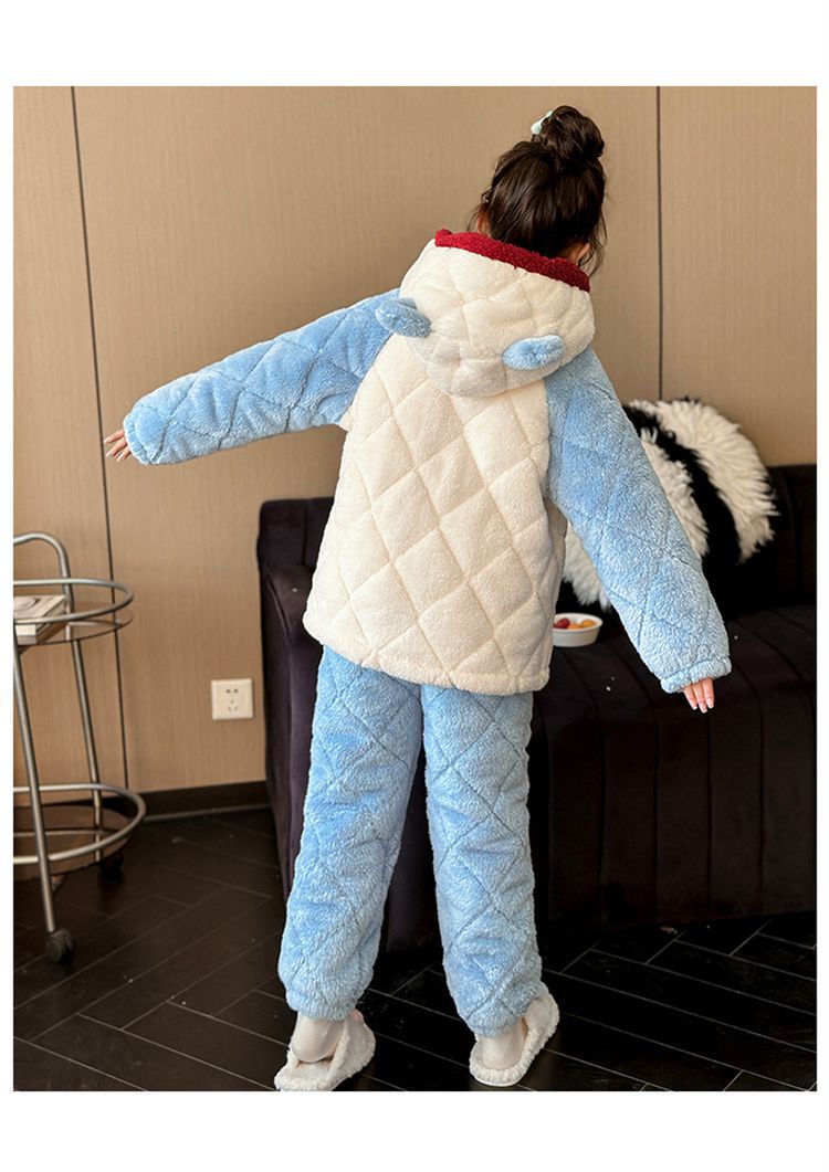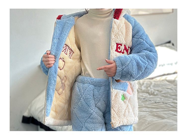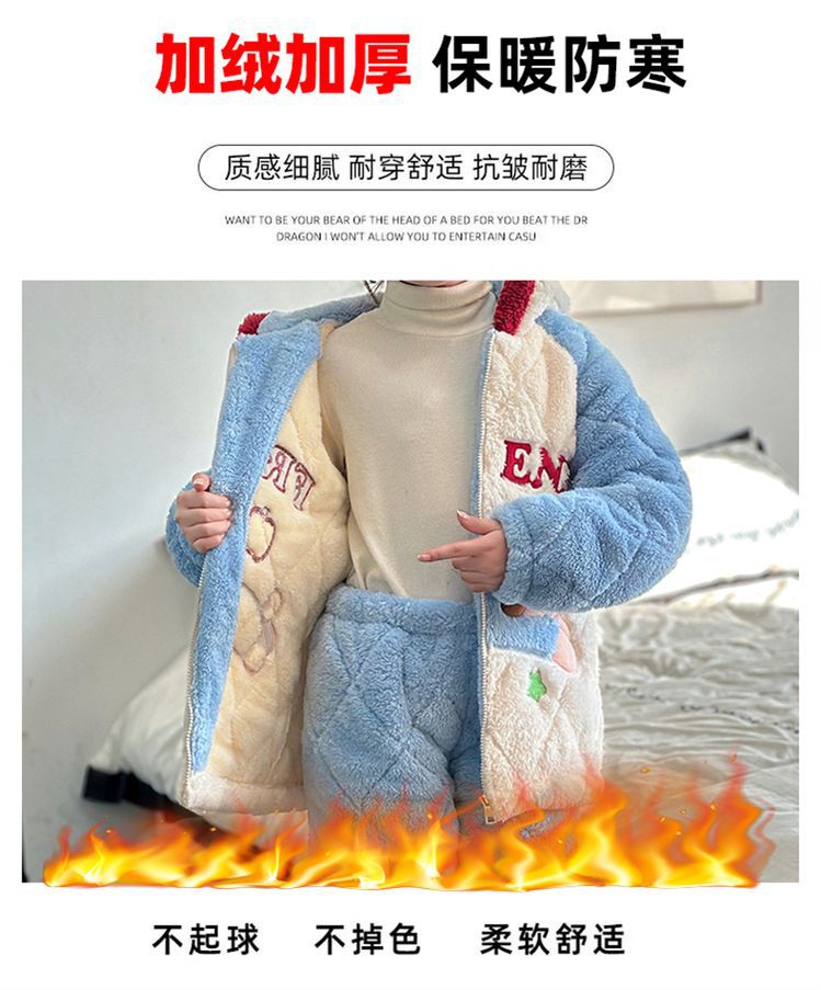걸스 3 층 퀼트 파자마 세트 어린이 겨울 기모 두꺼운 따뜻한 외모가 후드 홈 옷을 입고스토어 가기