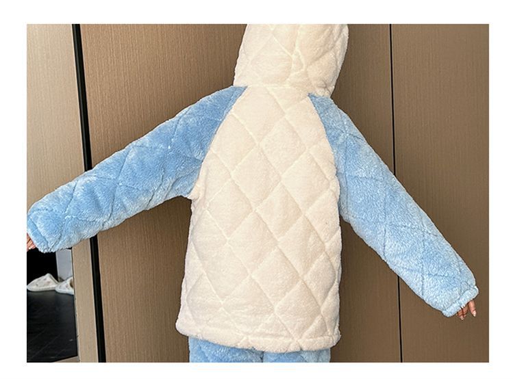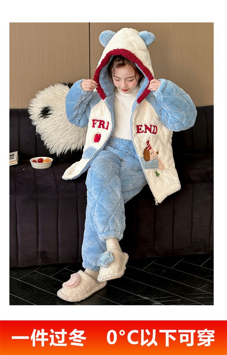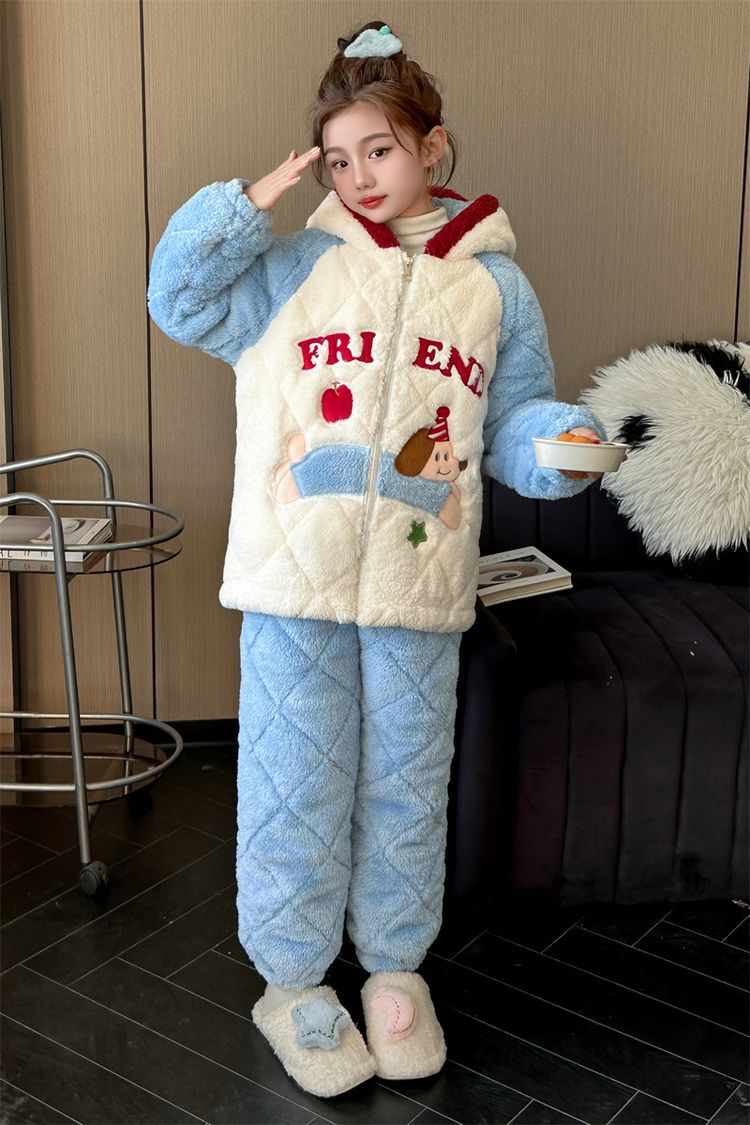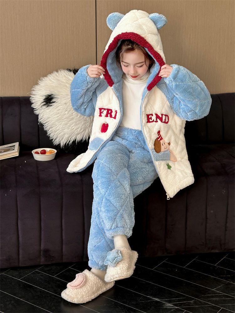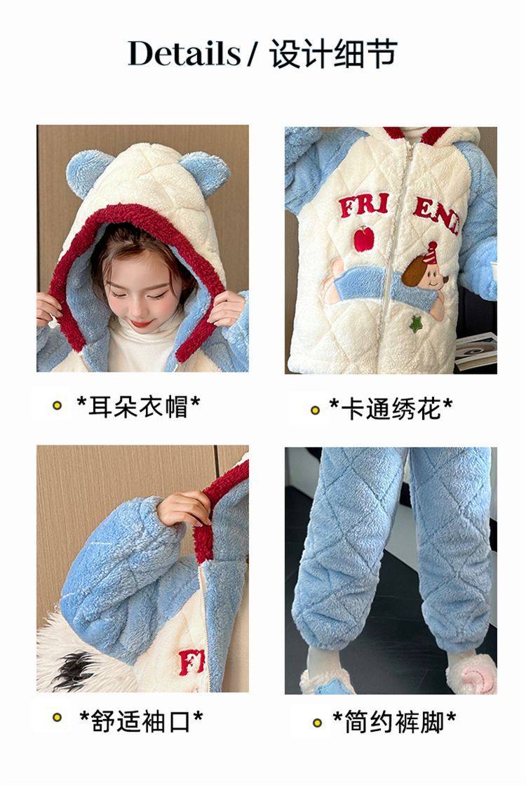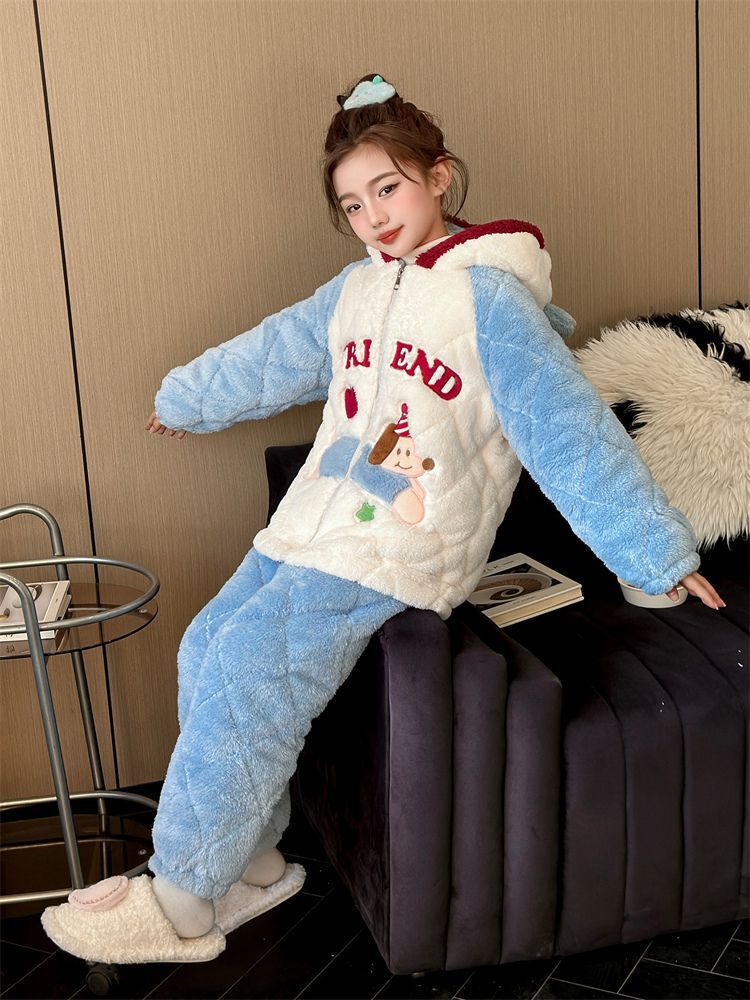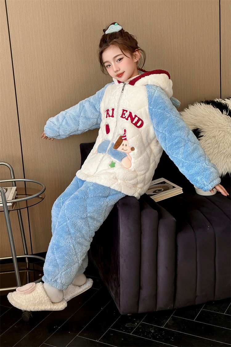 걸스 3 층 퀼트 파자마 세트 어린이 겨울 기모 두꺼운 따뜻한 외모가 후드 홈 옷을 입고스토어 가기