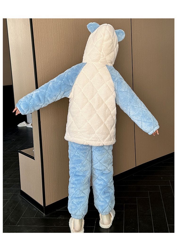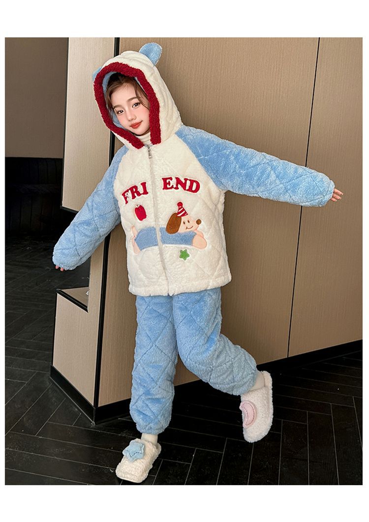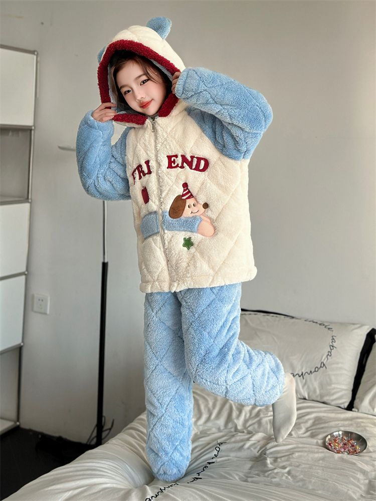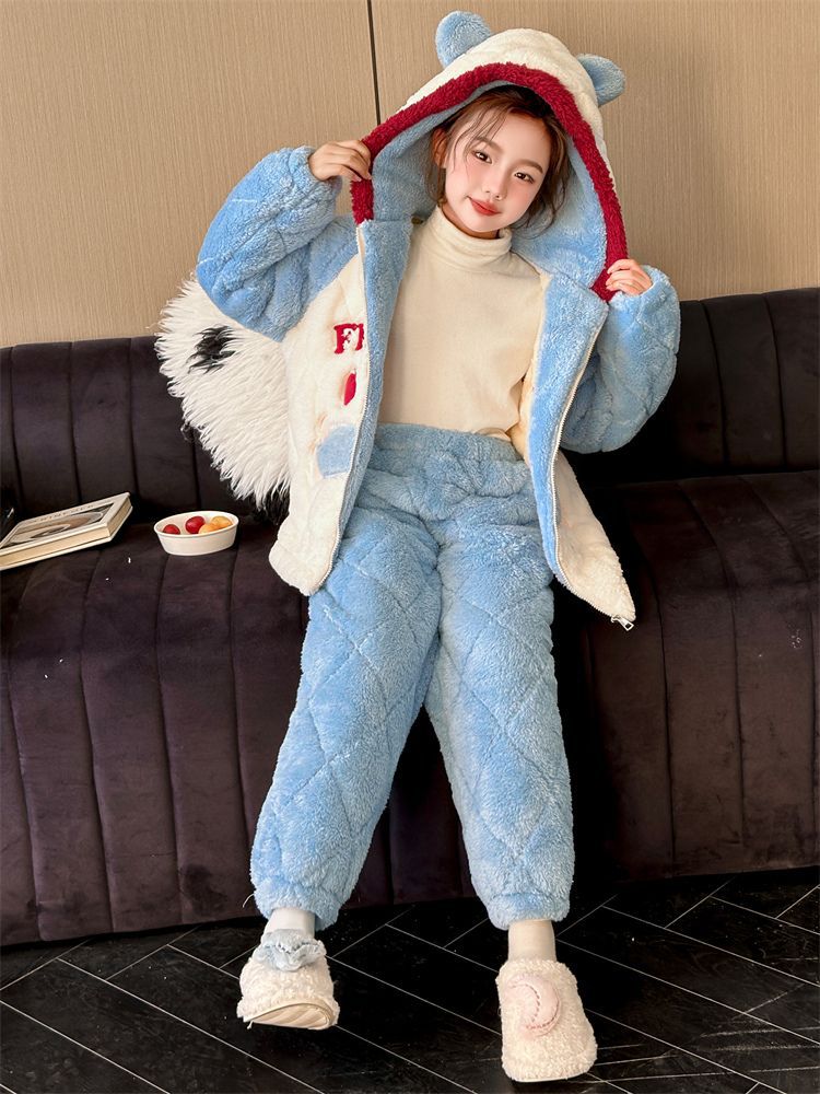 걸스 3 층 퀼트 파자마 세트 어린이 겨울 기모 두꺼운 따뜻한 외모가 후드 홈 옷을 입고