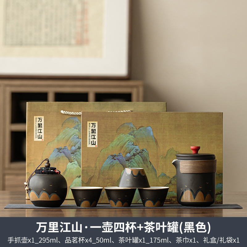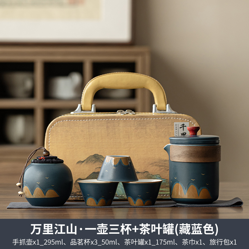 • ♥❤❥❣진한 파란색 Wanli Jiangshan, 냄비 1개, 컵 4개, 캔 1개 + 수건 클립 + 차 트레이 + 타원형 가죽 가방❣❥❤