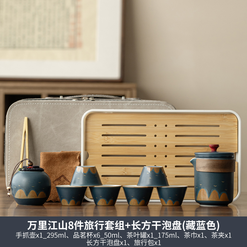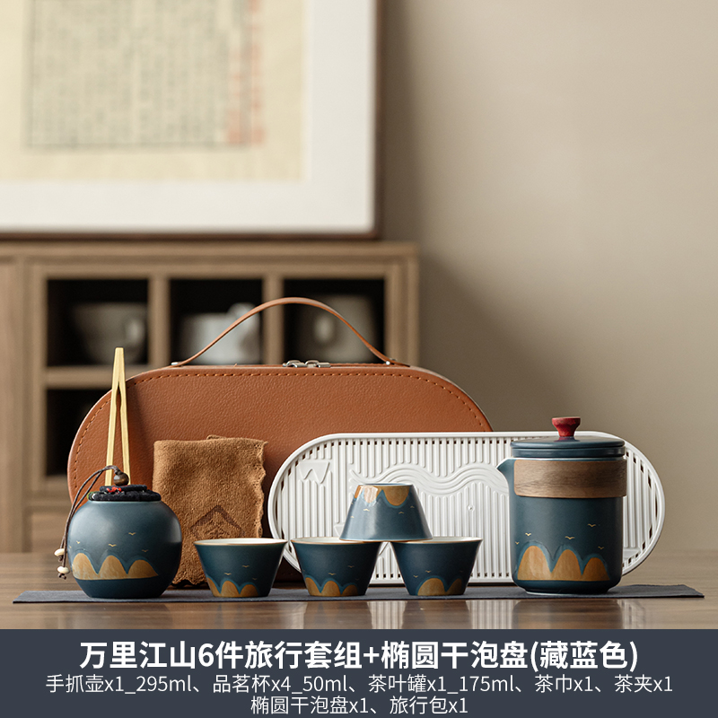 • ♥❤❥❣진한 파란색 Wanli Jiangshan, 냄비 1개, 컵 6개, 캔 1개 + 수건 클립 + 차 트레이 + 회색 가죽 가방❣❥❤