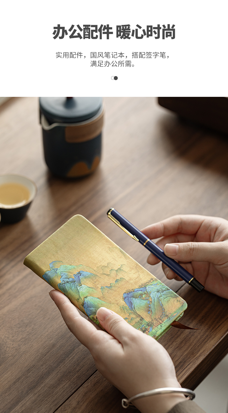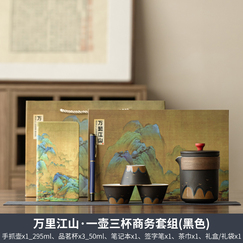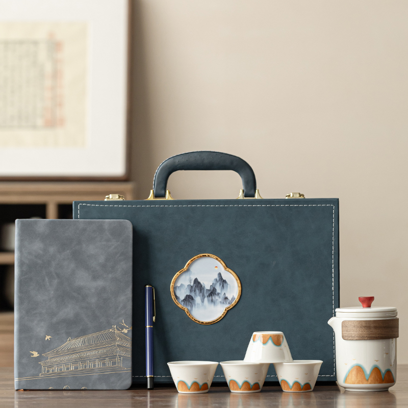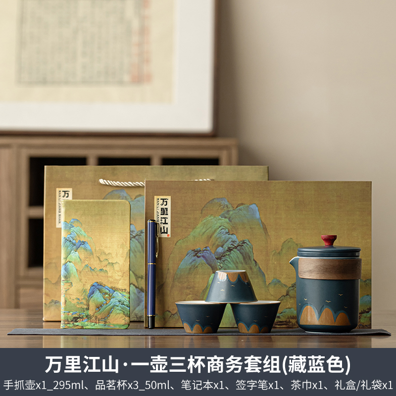 • ♥❤❥❣진한 파란색 Wanli Jiangshan 한 냄비에 컵 4개 + 펜 + 노트북 + 휴대용 가죽 가방❣❥❤