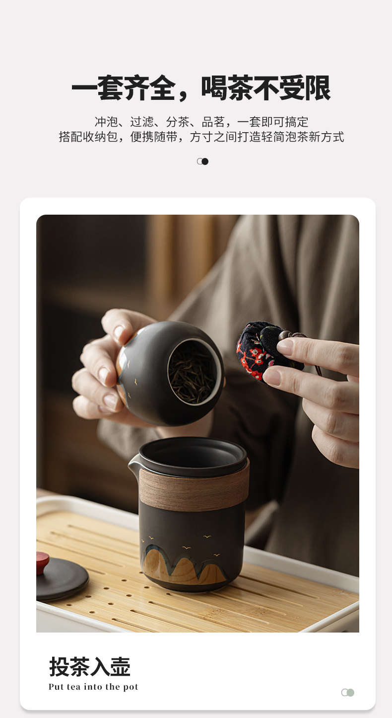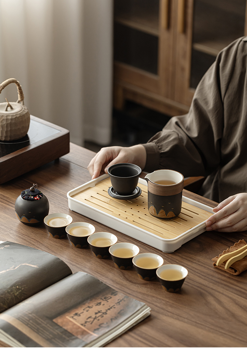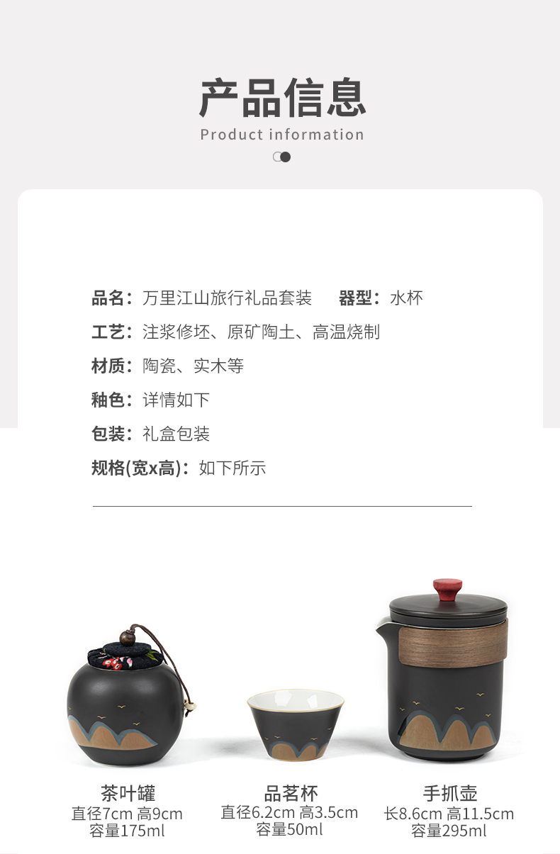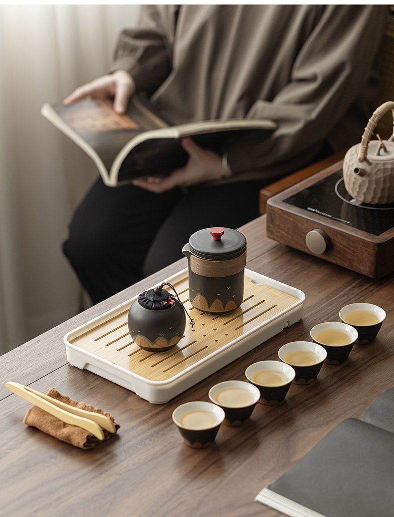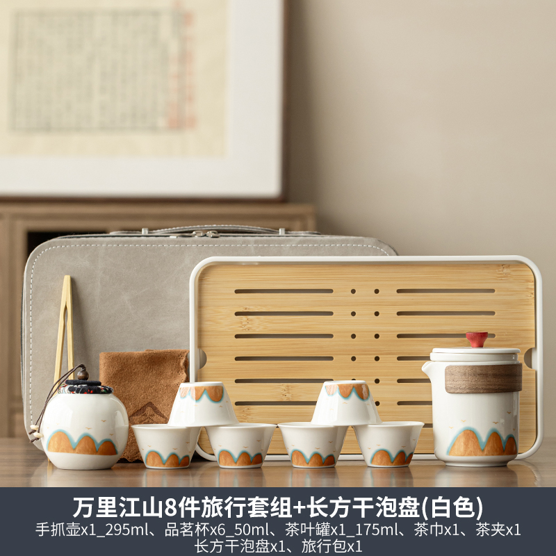 • ♥❤❥❣매트 화이트 Wanli Jiangshan, 냄비 1개, 컵 6개, 캔 1개 + 수건 클립 + 차 트레이 + 회색 가죽 가방❣❥❤