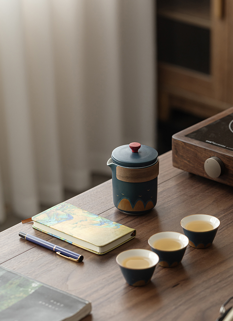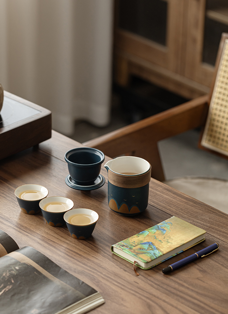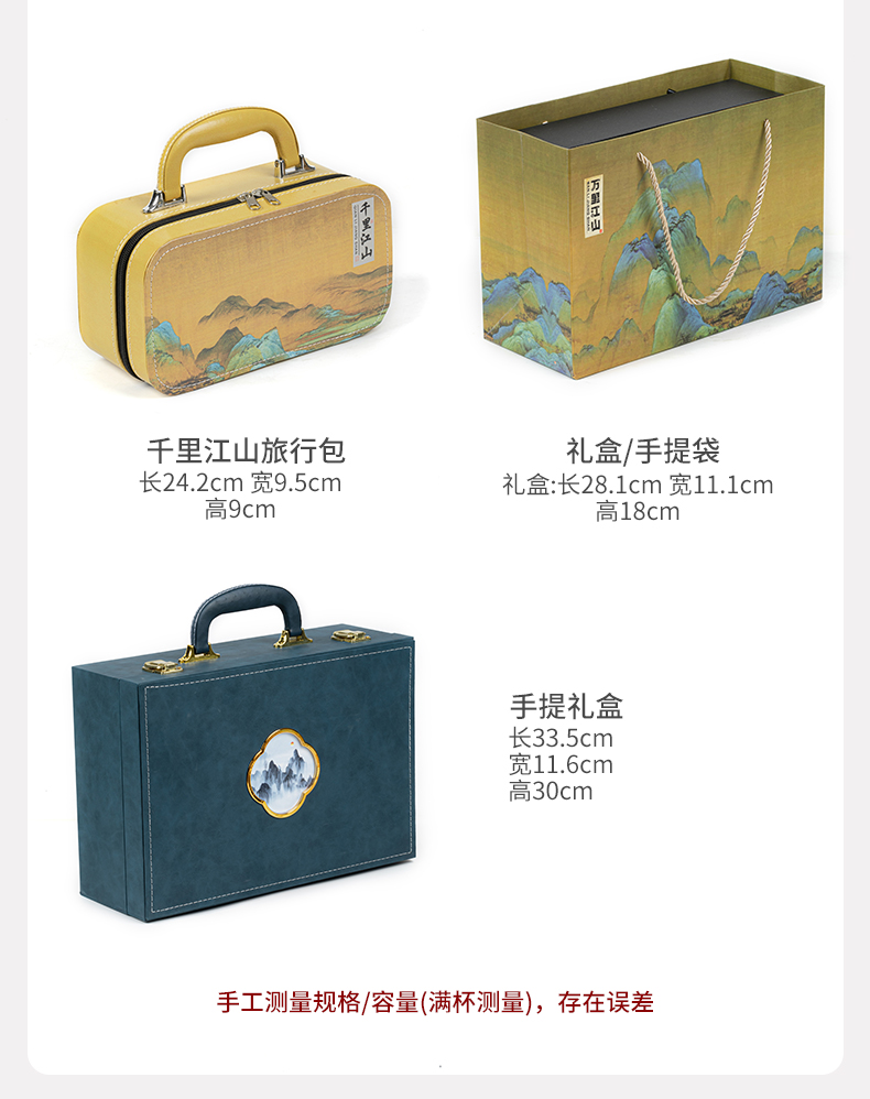 • ♥❤❥❣진한 파란색 Wanli Jiangshan, 냄비 1개, 컵 3개, 캔 1개 + Jiangshan 가죽 가방❣❥❤
