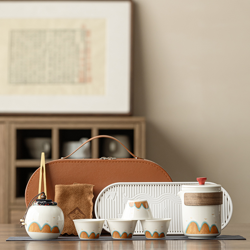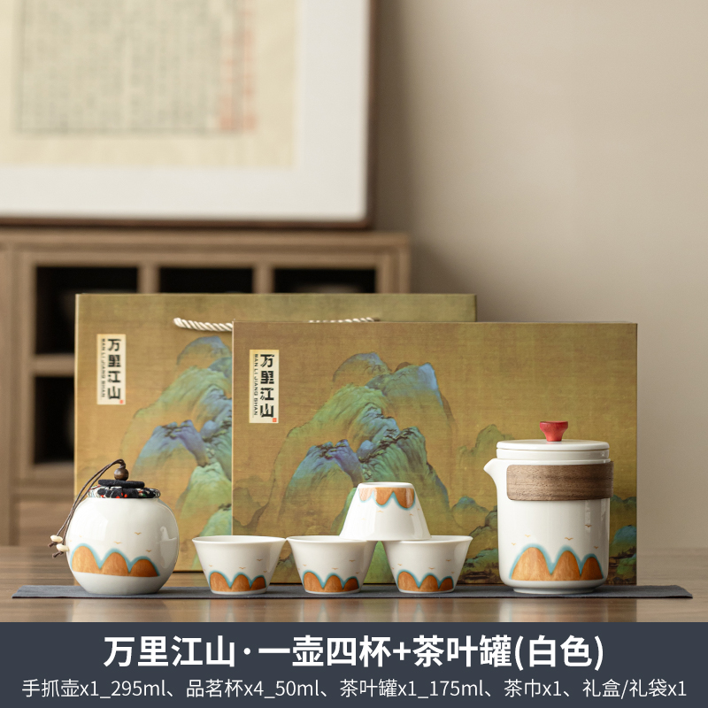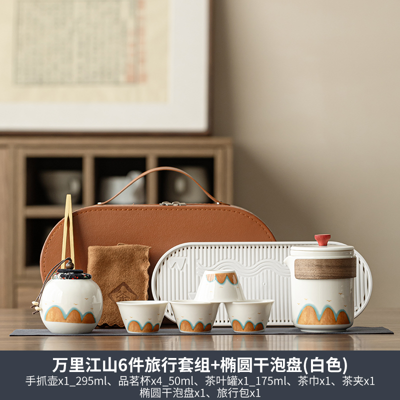 • ♥❤❥❣매트 화이트 Wanli Jiangshan, 냄비 1개, 컵 4개, 캔 1개 + 수건 클립 + 차 트레이 + 타원형 가죽 가방❣❥❤