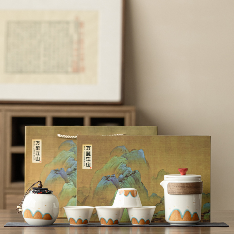 • ♥❤❥❣진한 파란색 Wanli Jiangshan, 냄비 1개, 컵 4개, 캔 1개 + 선물 상자❣❥❤