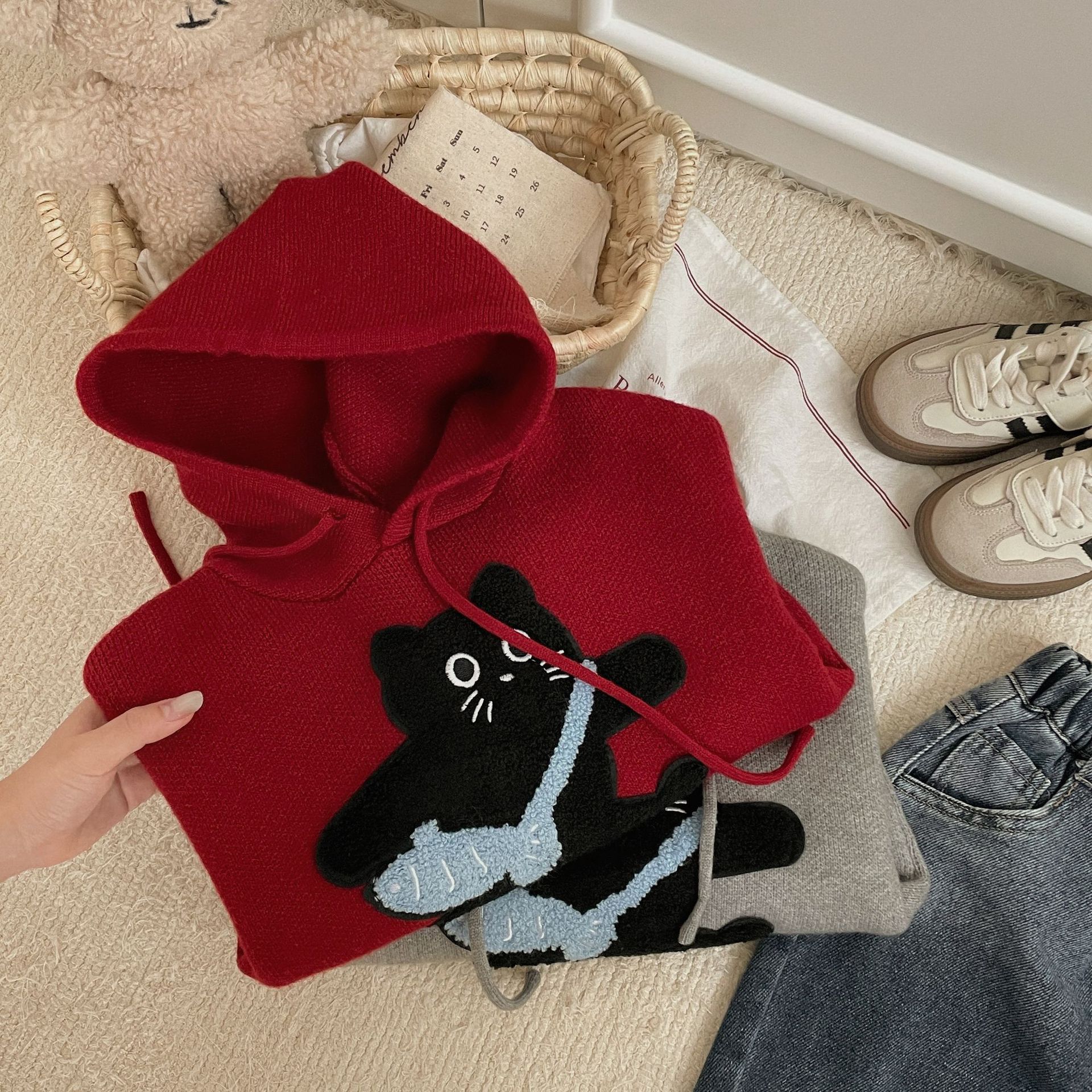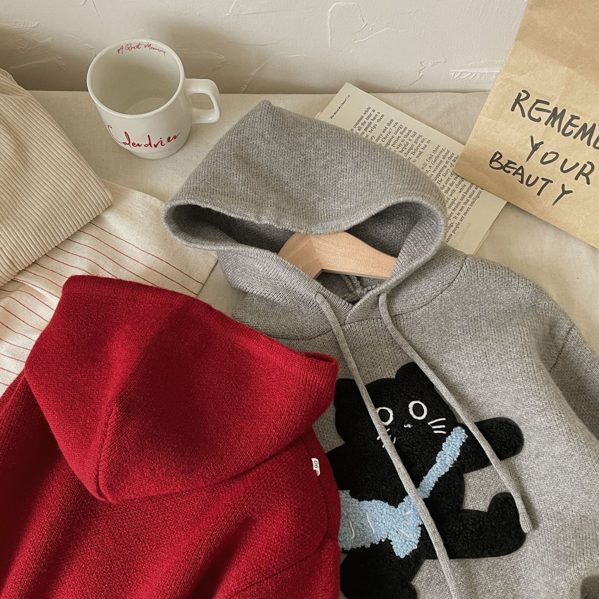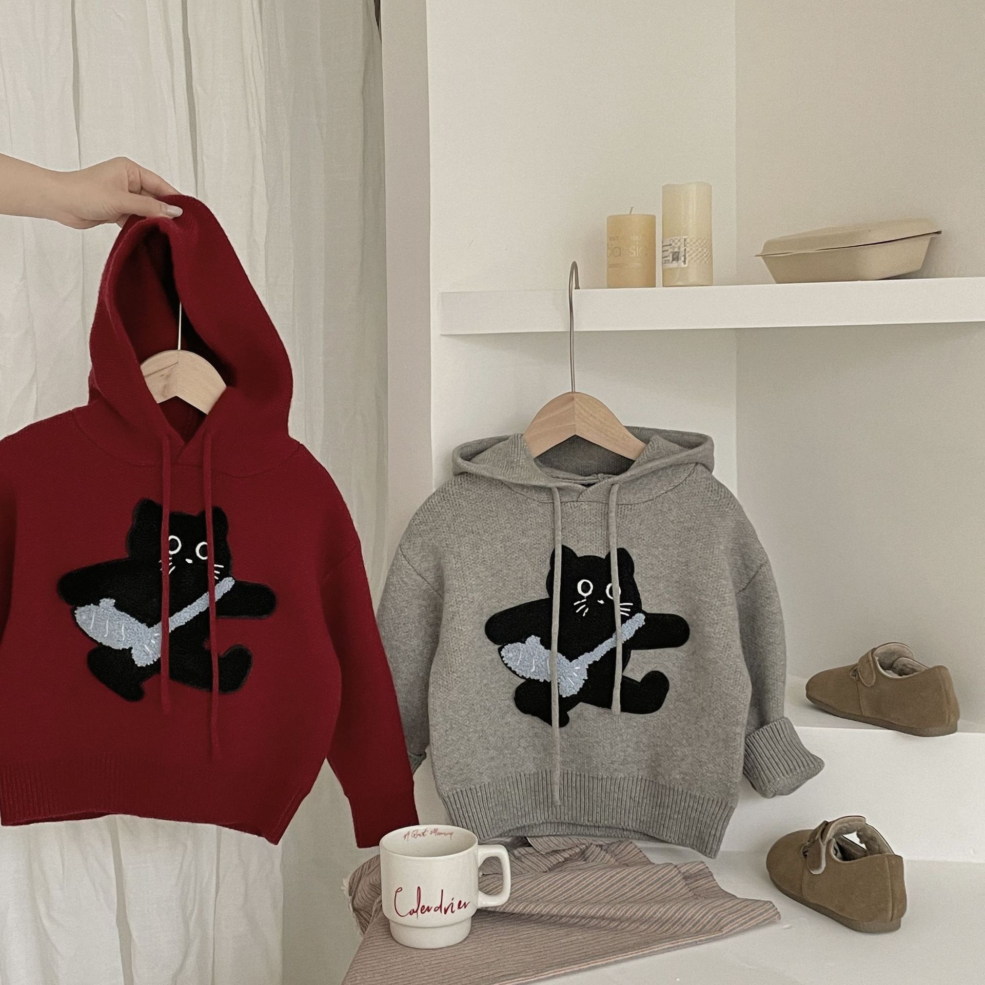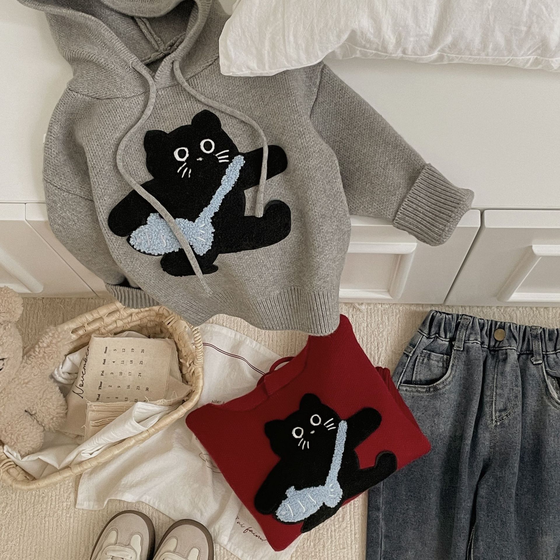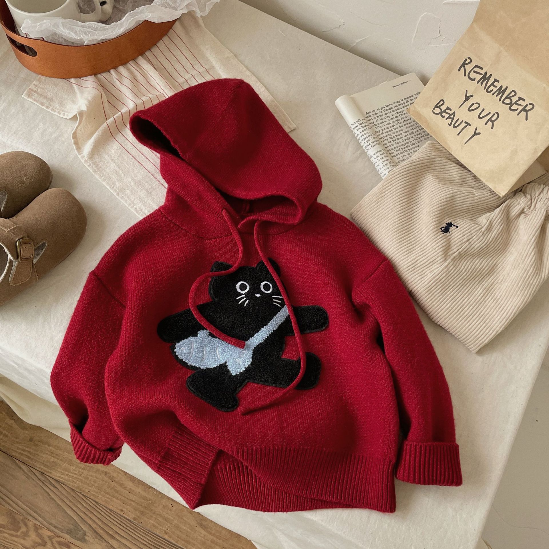 Benshu Shu 가을 및 겨울 소년과 소녀를위한 새로운 두꺼운 스웨터 웨스턴 스타일 올 매치 패딩 고양이 니트 후디 스웨터스토어 가기