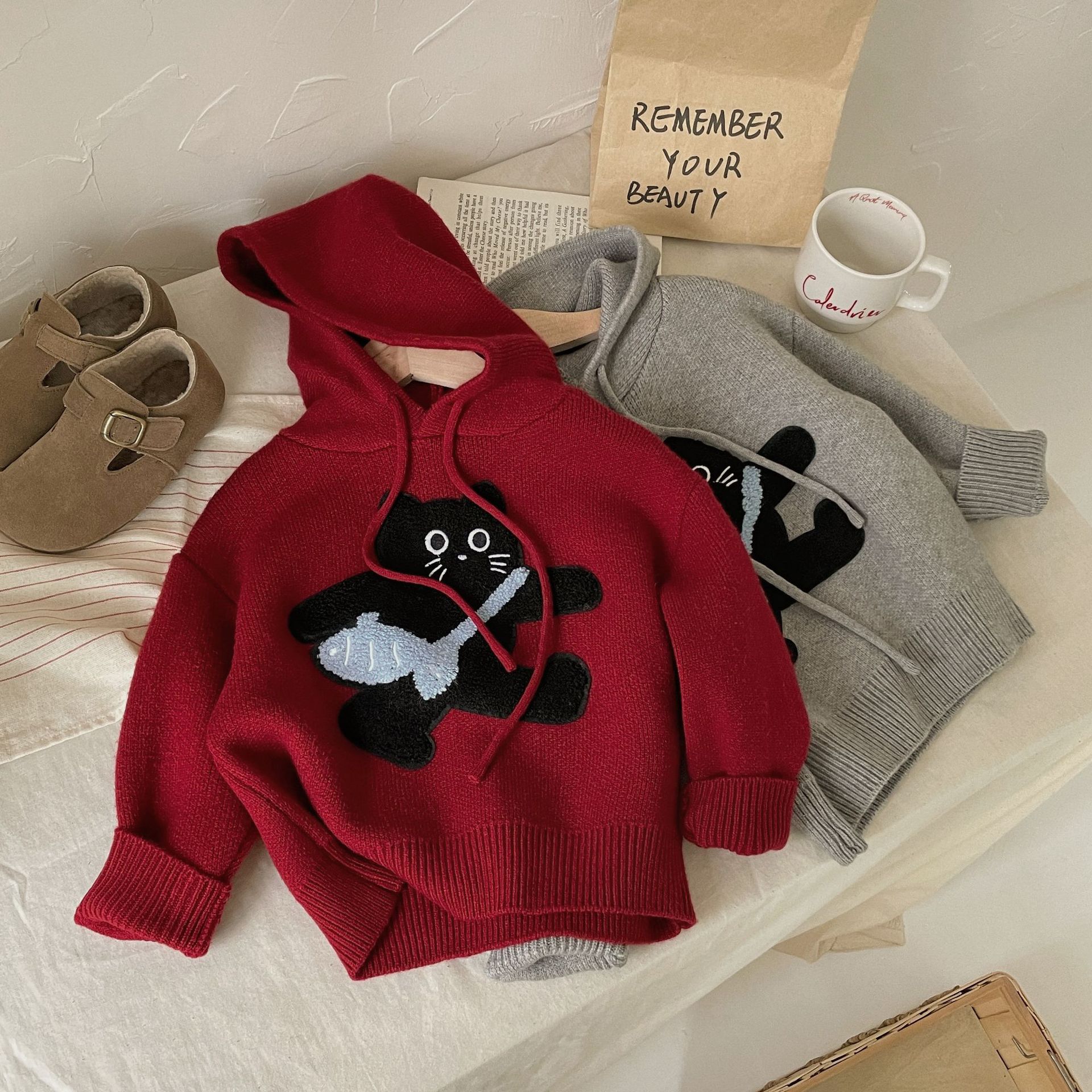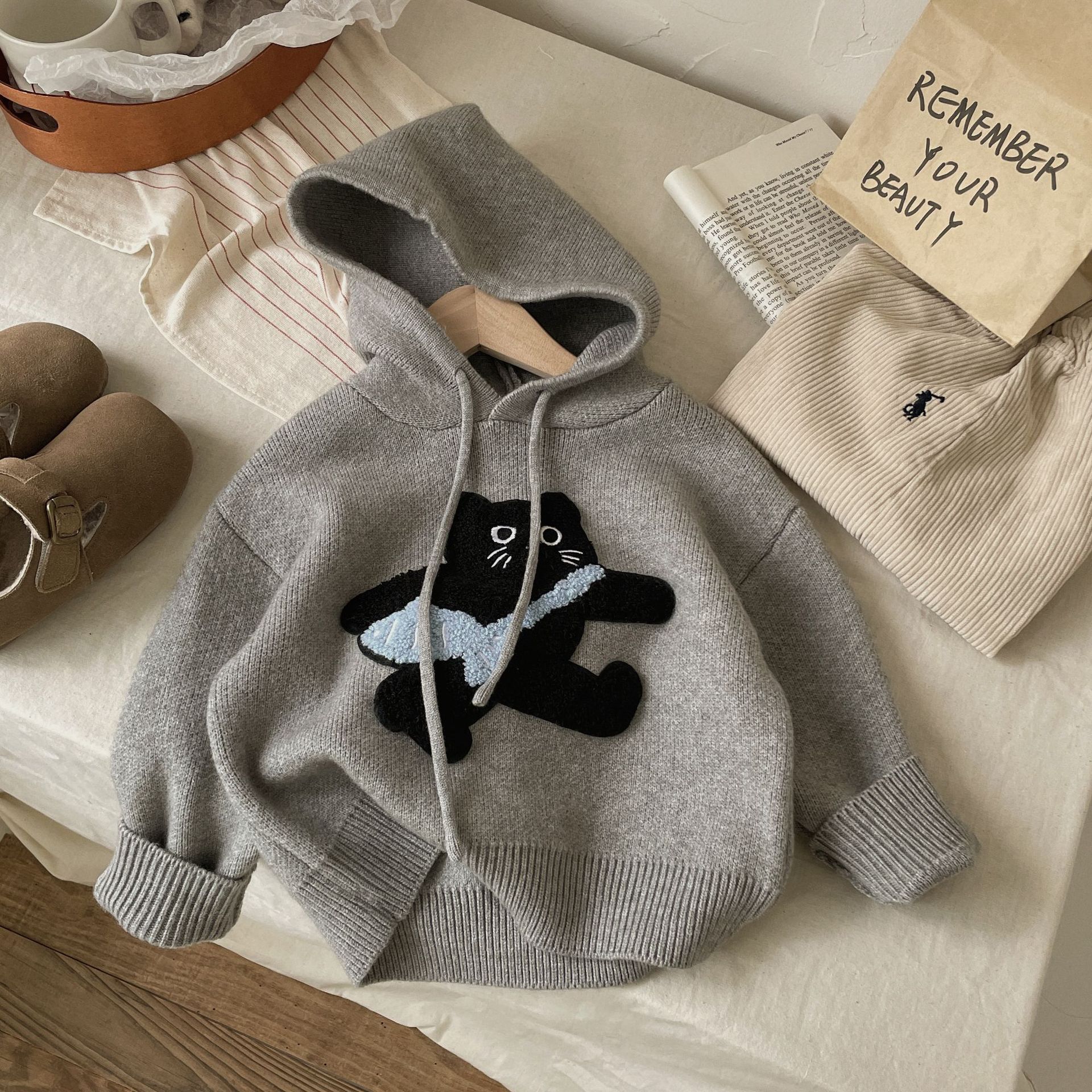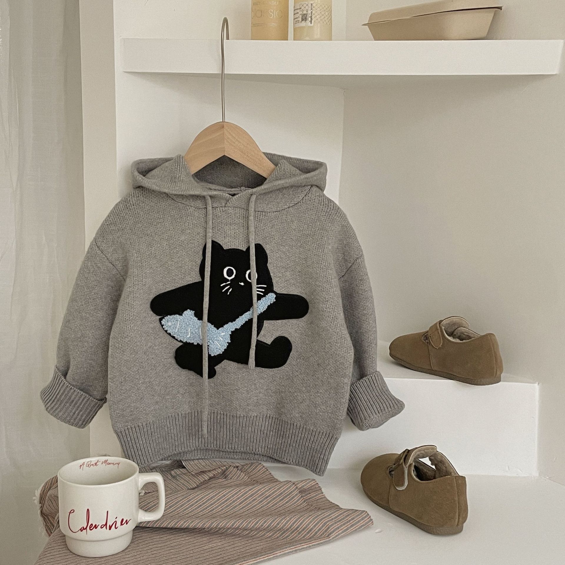 Benshu Shu 가을 및 겨울 소년과 소녀를위한 새로운 두꺼운 스웨터 웨스턴 스타일 올 매치 패딩 고양이 니트 후디 스웨터