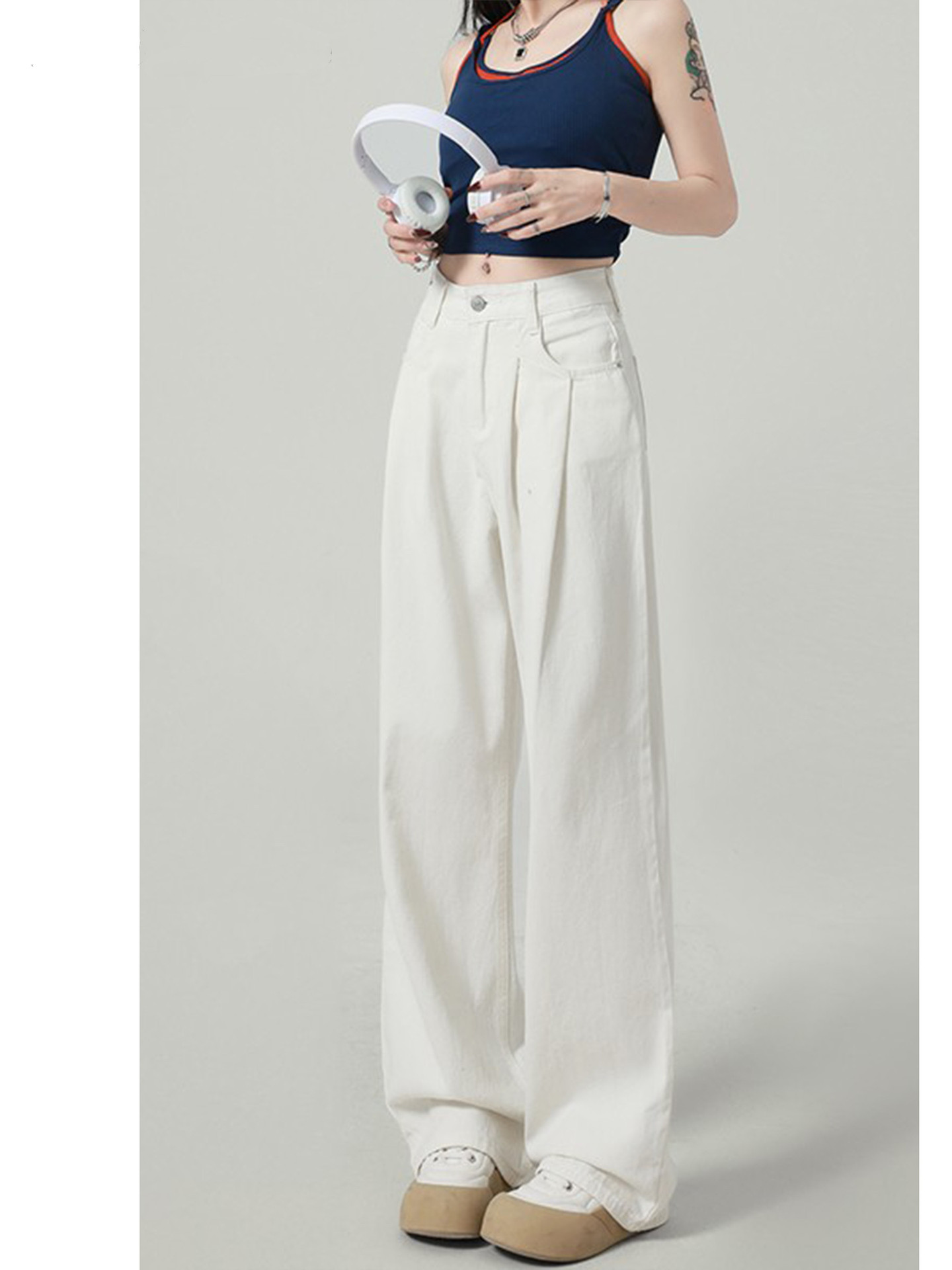 흰색 좁은 넓은 다리 청바지 여성의 봄과 가을 한국식 올매치 주름 디자인 느슨한 틈새 높은 허리 스트레이트 바지