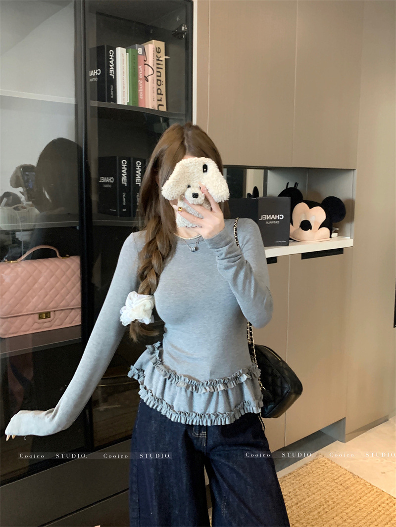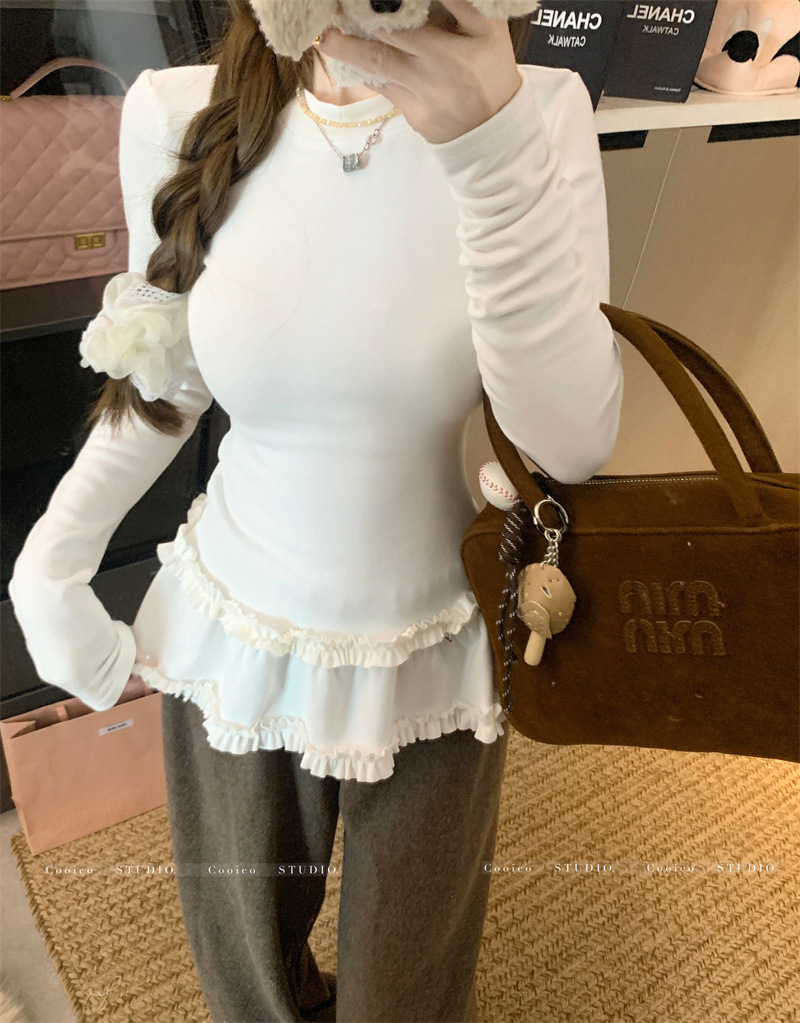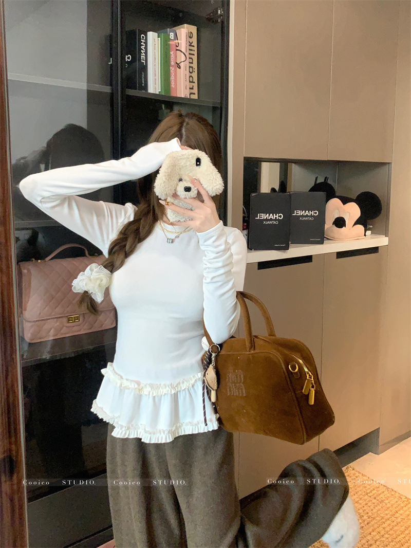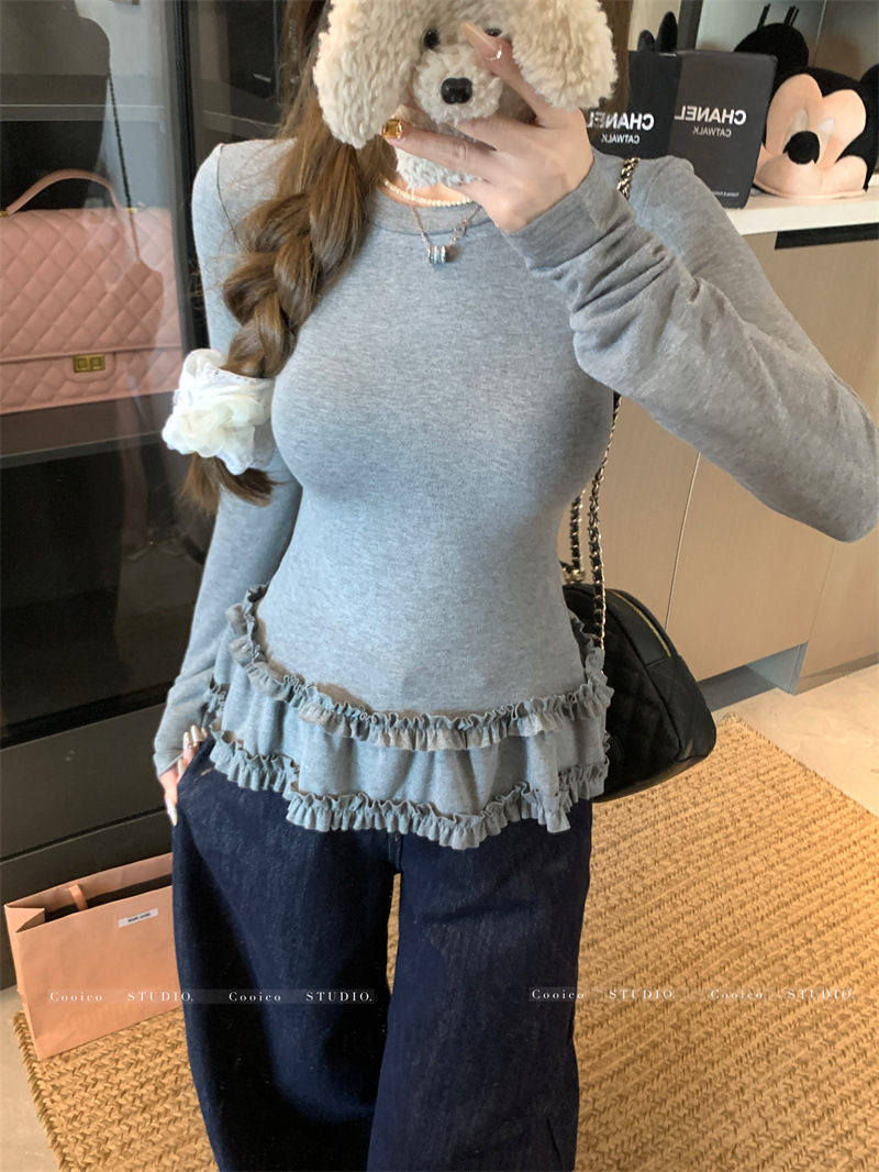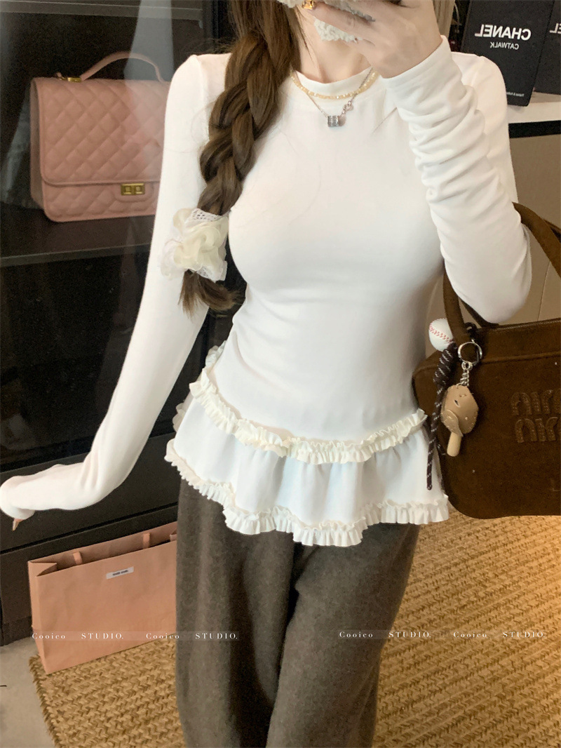 발레 스타일 레이스 브러쉬 티셔츠 여성용 가을과 겨울 새로운 슬림 핏 슬리밍 기모 두꺼운 내베이스 셔츠 탑