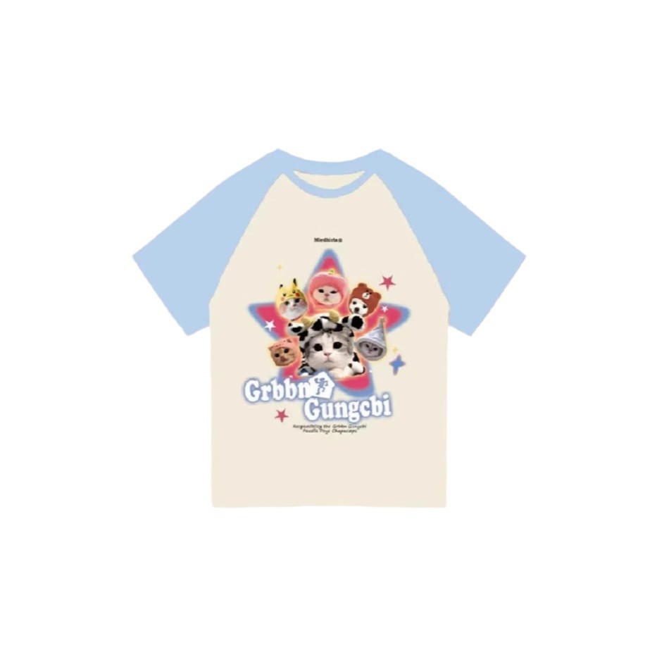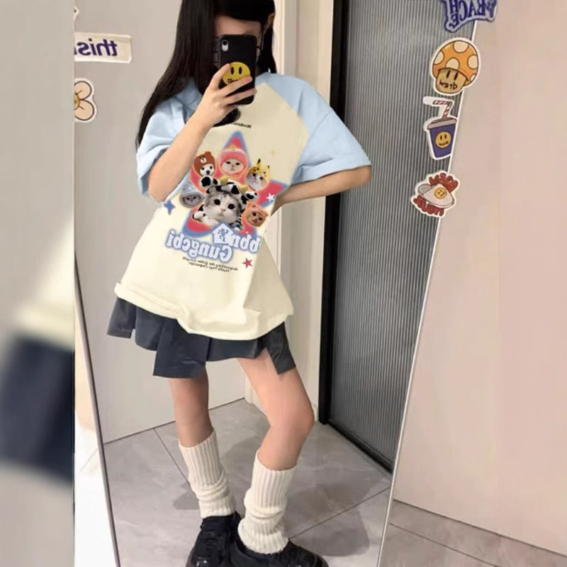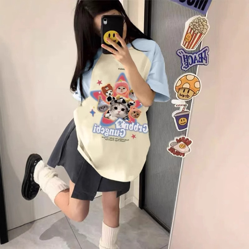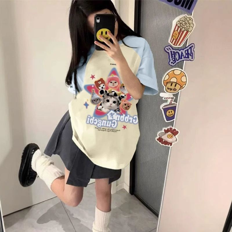 도파민 착용 라스 반팔 티셔츠 여성용 여름 통통녀 새로운 달콤한 스티칭 대조 컬러 티셔츠 루즈 탑스토어 가기