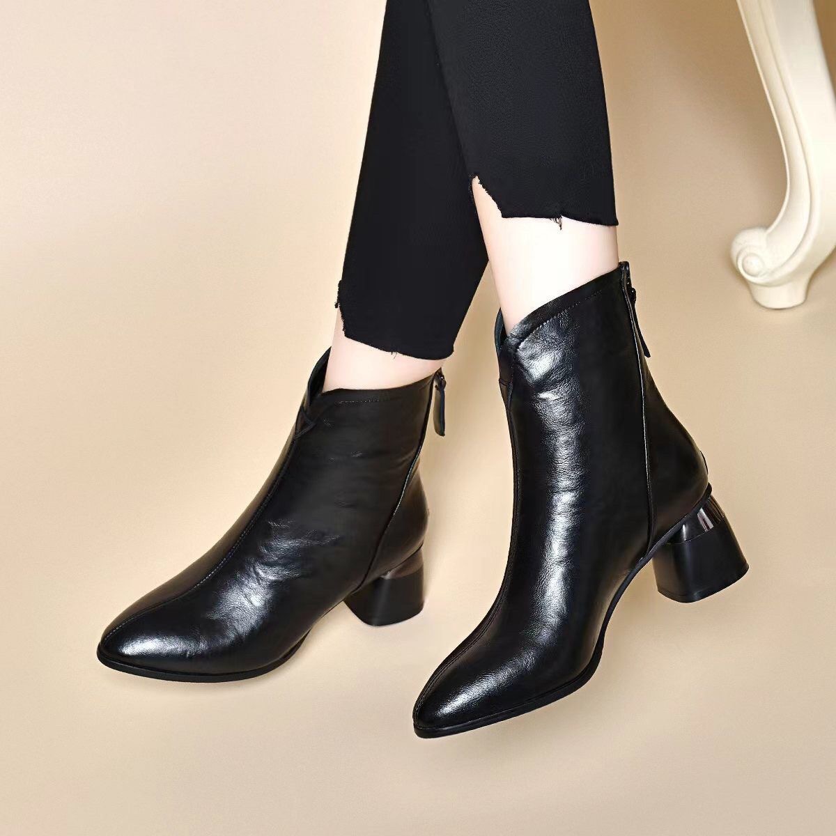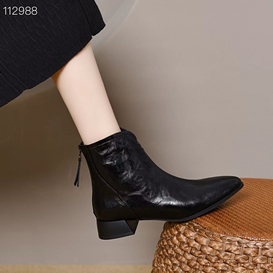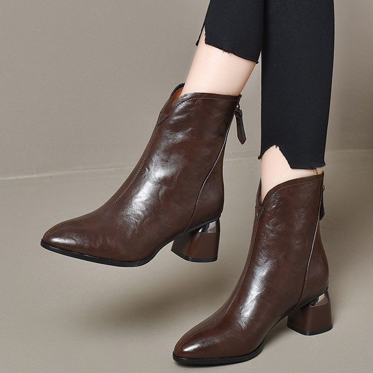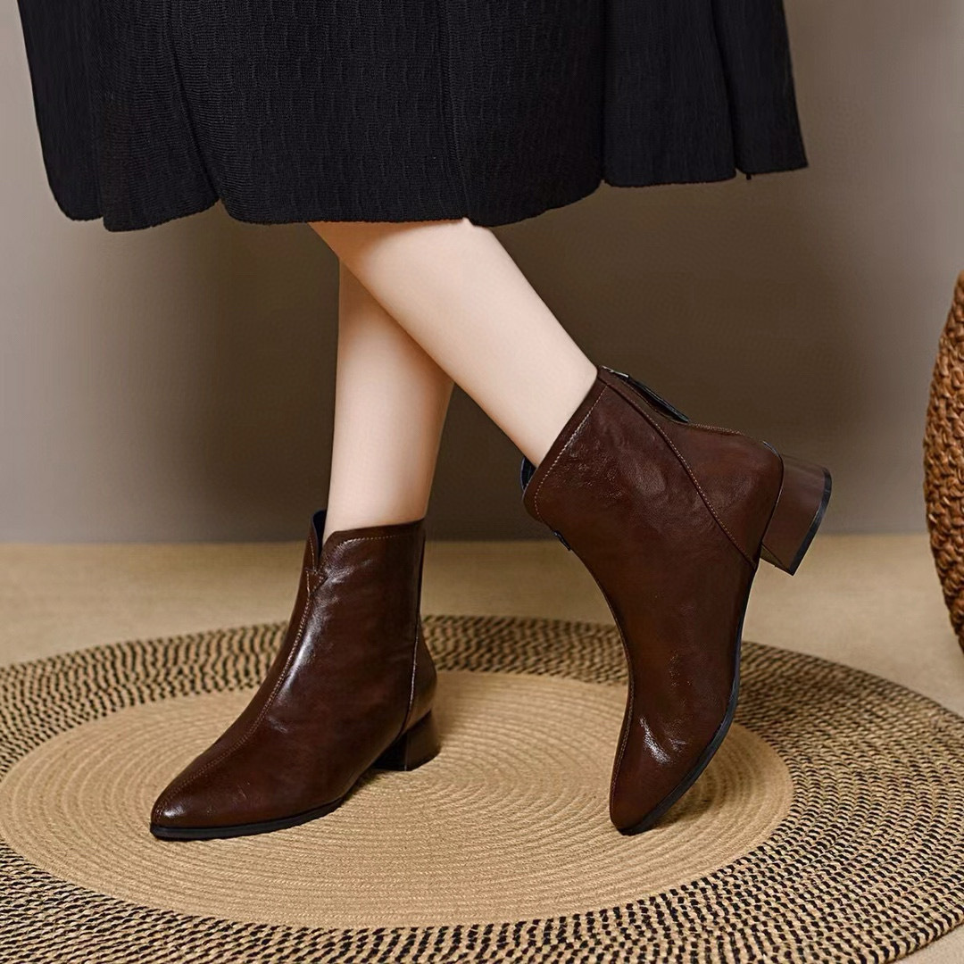 2024 새로운 소프트 가죽 짧은 부츠 두꺼운 힐 기모 가을 겨울 소프트 가죽 뾰족한 마틴 부츠 여성용 코튼 가죽 신발스토어 가기