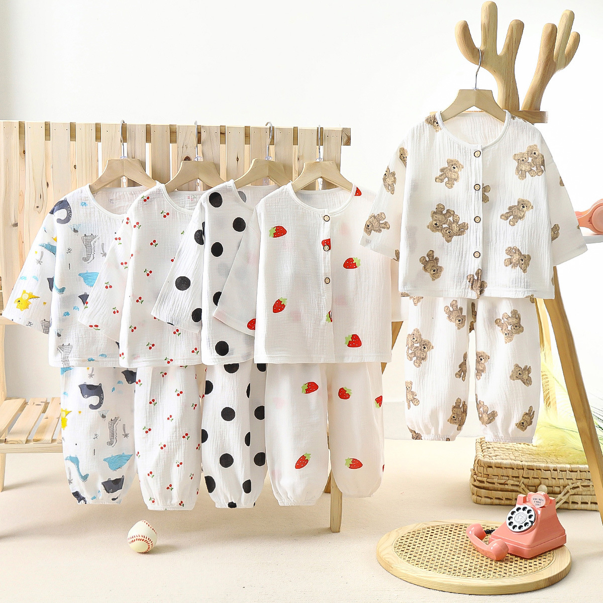소년 소녀 홈 의류 반팔 바지 어린이 잠옷 한순면 거즈 여름 아기 에어컨 의류 세트 직접 판매스토어 가기