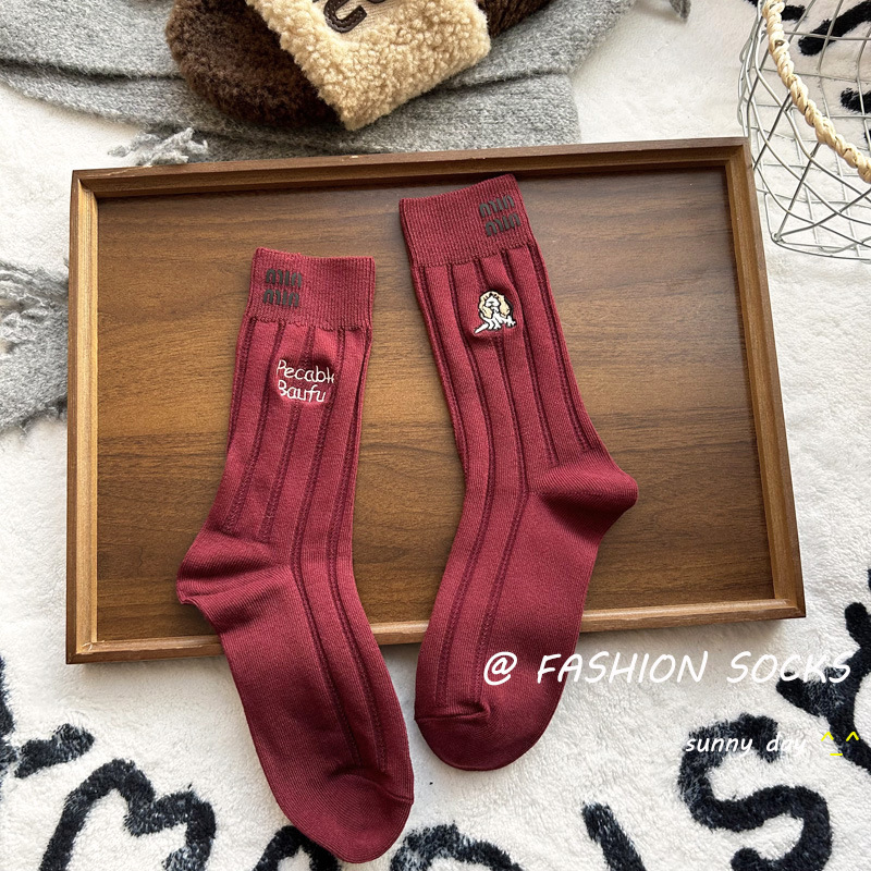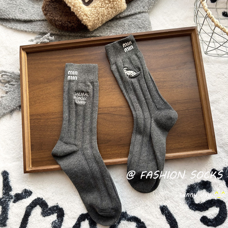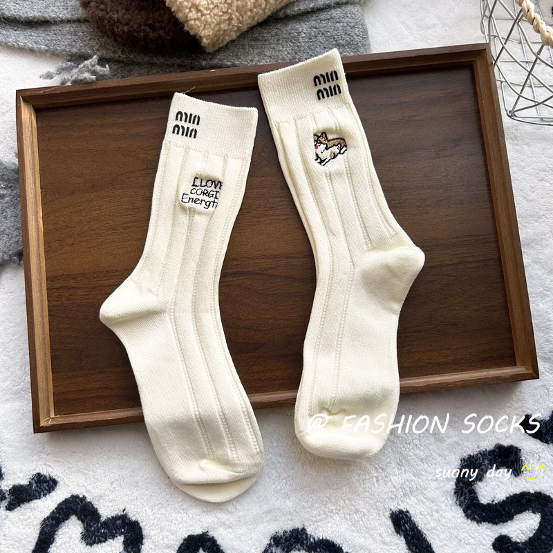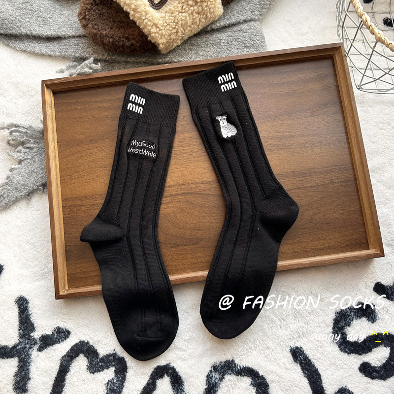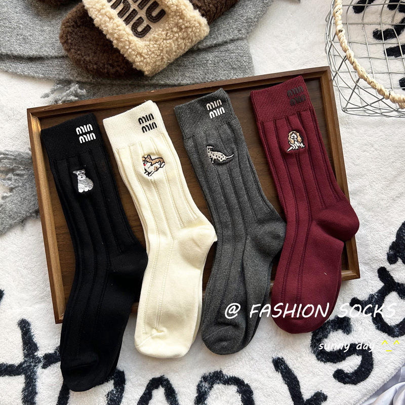 가을과 겨울 자수 강아지 동물 양말 여성 유행 편지 세련된 중간 실린더 스택 양말 모든 매치 니트 독특한 달콤한스토어 가기
