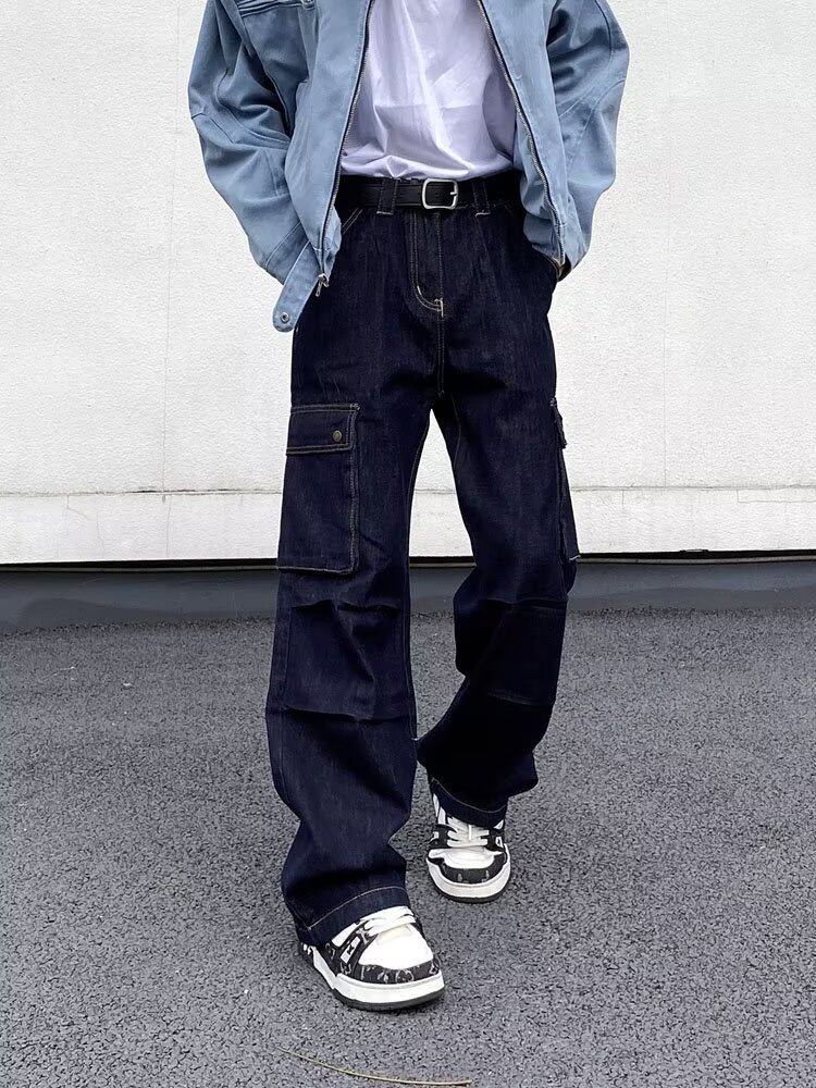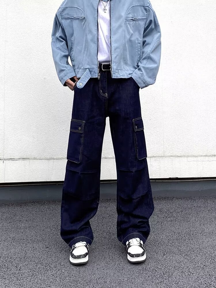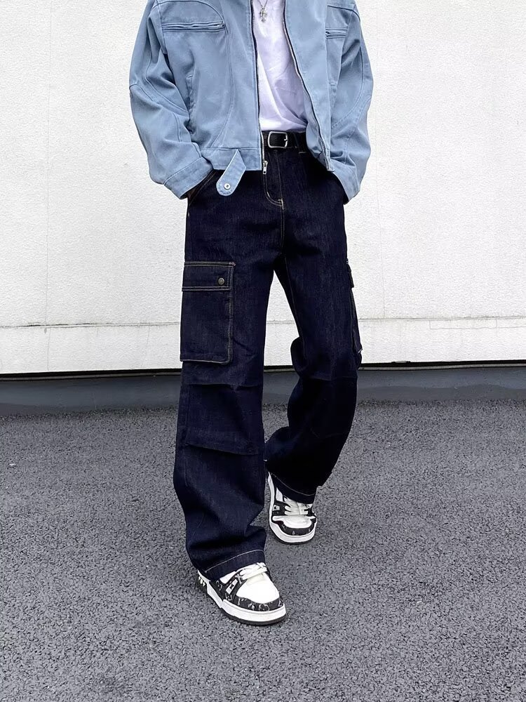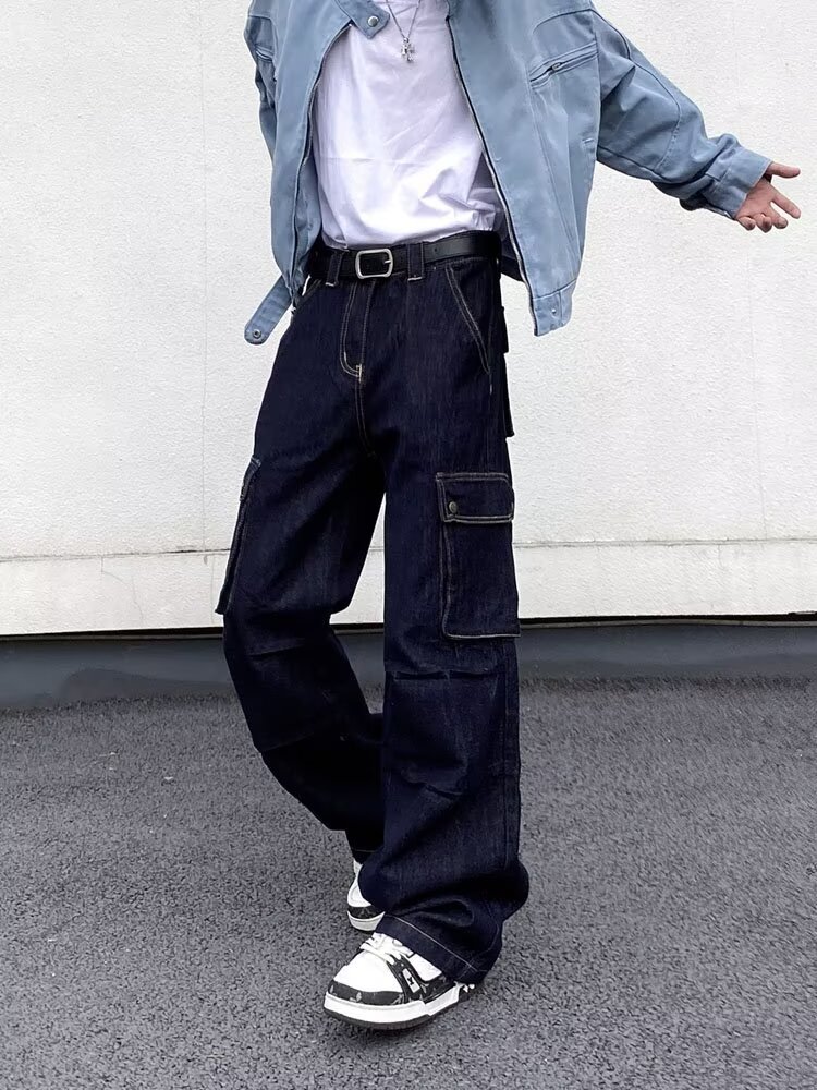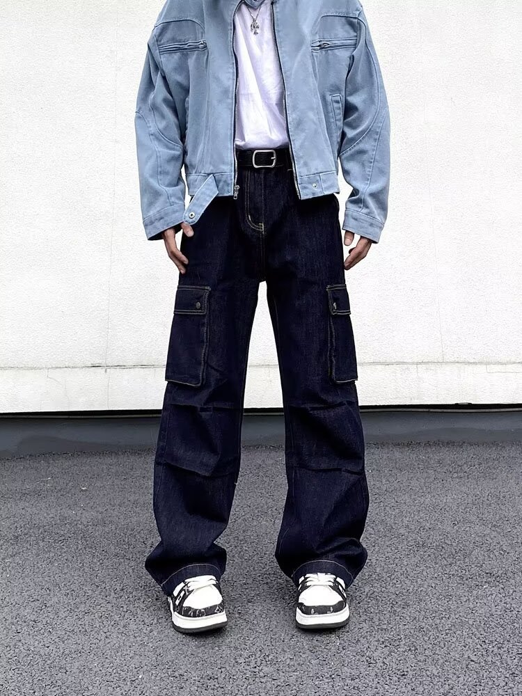 미국식 바이브 하이 스트리트 레트로 멀티 포켓 카고 청바지 남성 봄과 가을 느슨한 스트레이트 올 매치 캐주얼 트렌디 팬츠