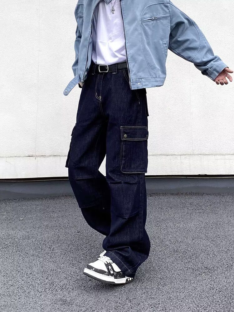 미국식 바이브 하이 스트리트 레트로 멀티 포켓 카고 청바지 남성 봄과 가을 느슨한 스트레이트 올 매치 캐주얼 트렌디 팬츠스토어 가기