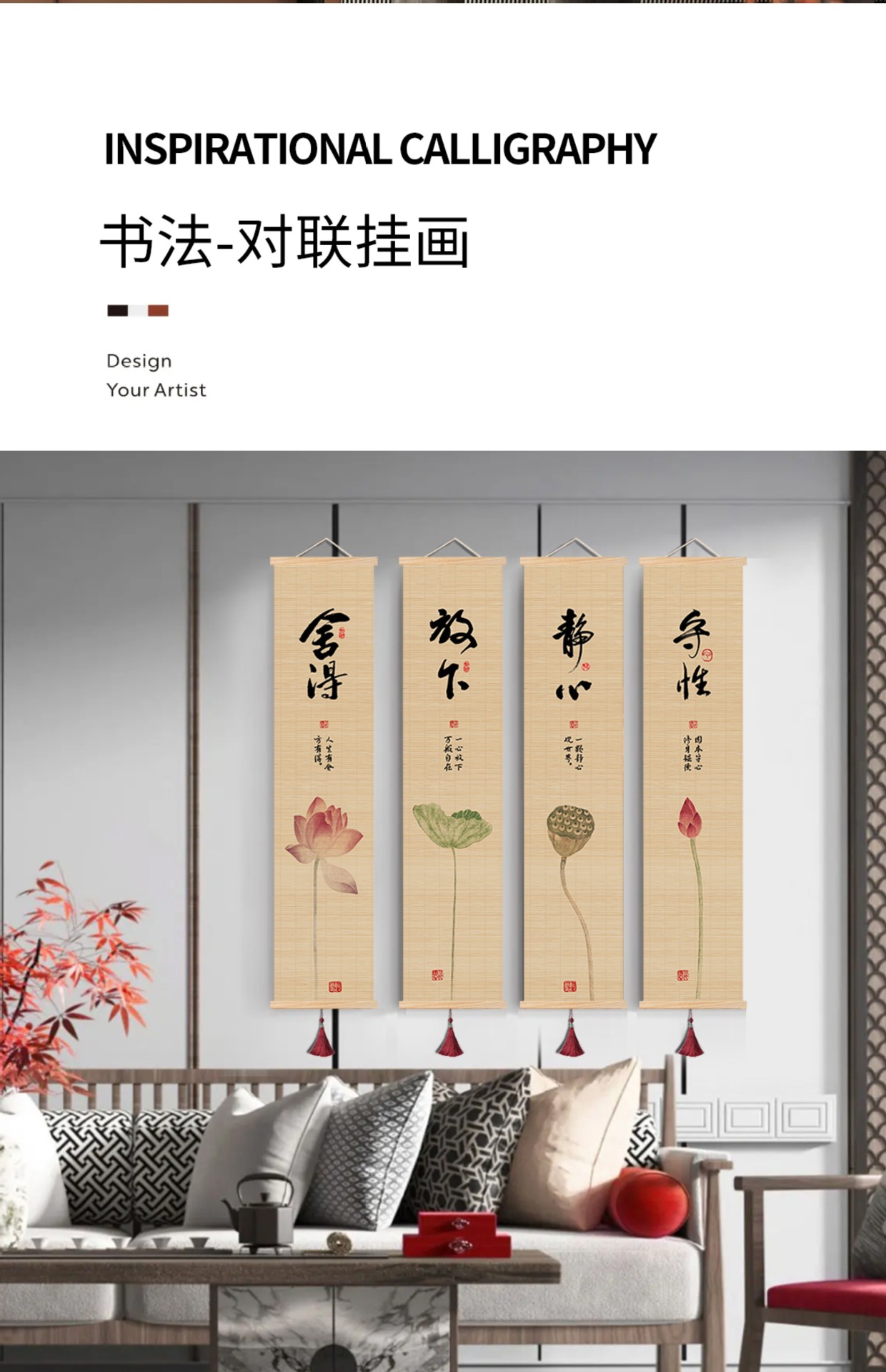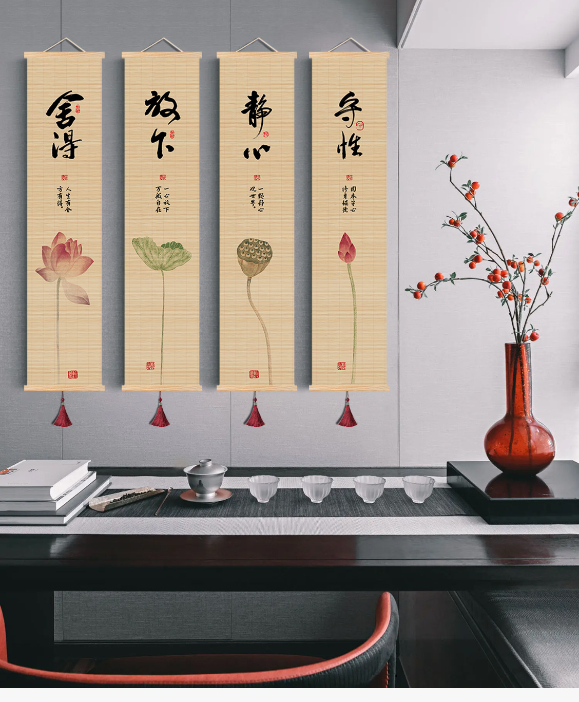 새로운 중국 스타일 거실 장식 그림 선 스타일 티 룸 인쇄 대나무 커튼 교수형 그림 연구 배경 스크롤 서예 연꽃 진 쑤언