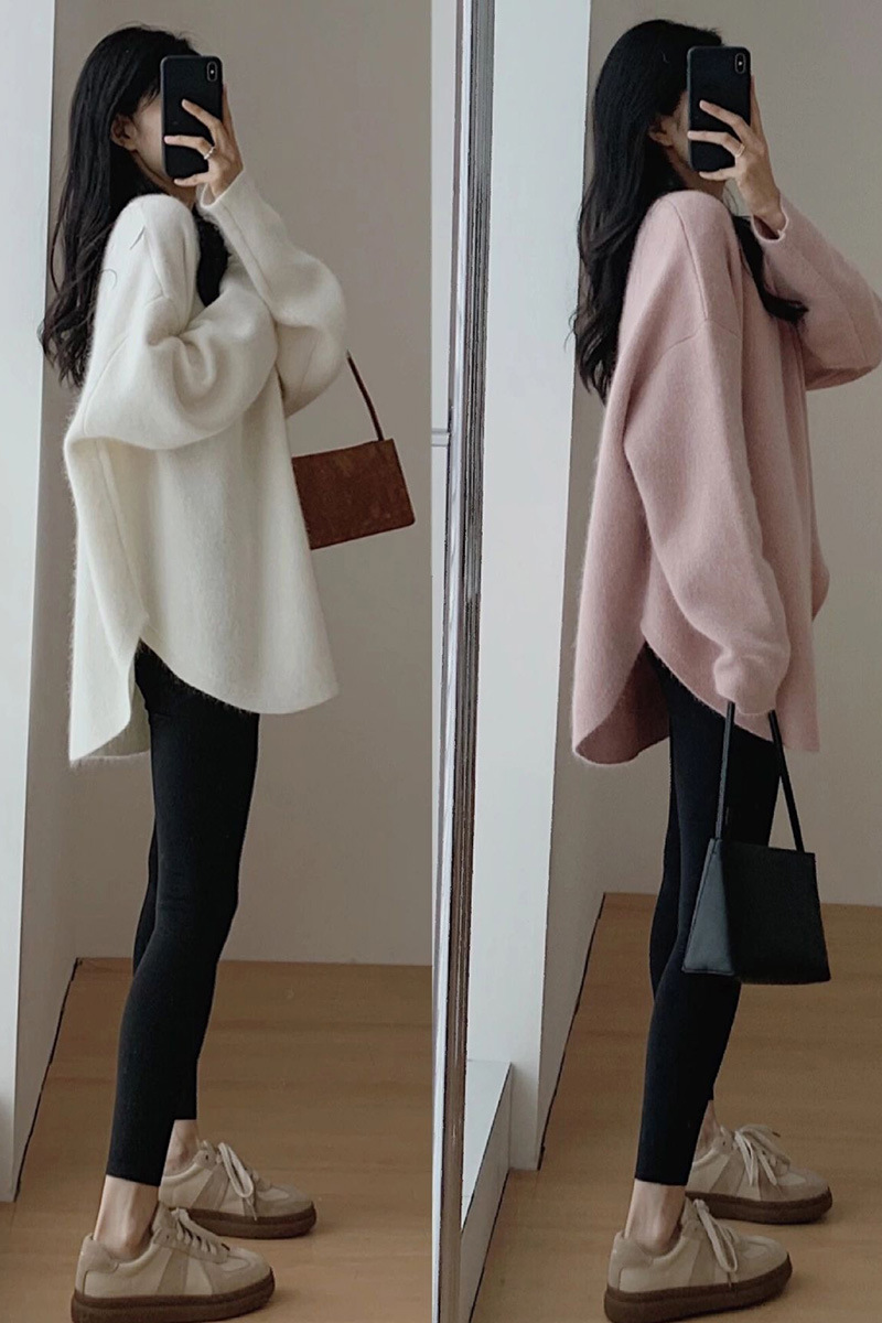 가을과 겨울 새로운 여성의 중간 길이 게으른 스타일 하이 엔드 프랑스베이스 스웨터 레드 소프트 왁스 크루 넥 스웨터스토어 가기