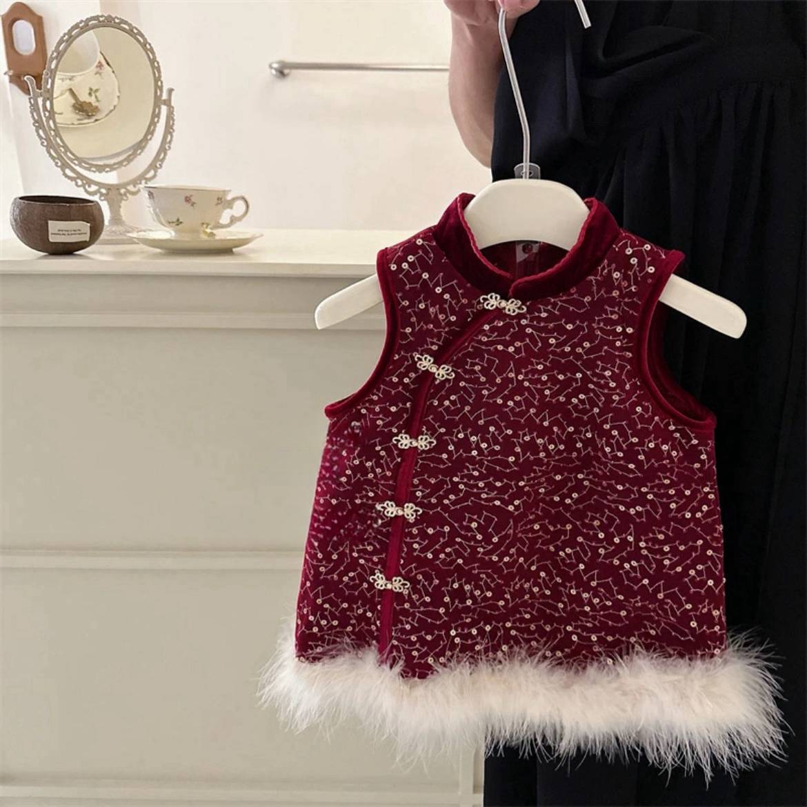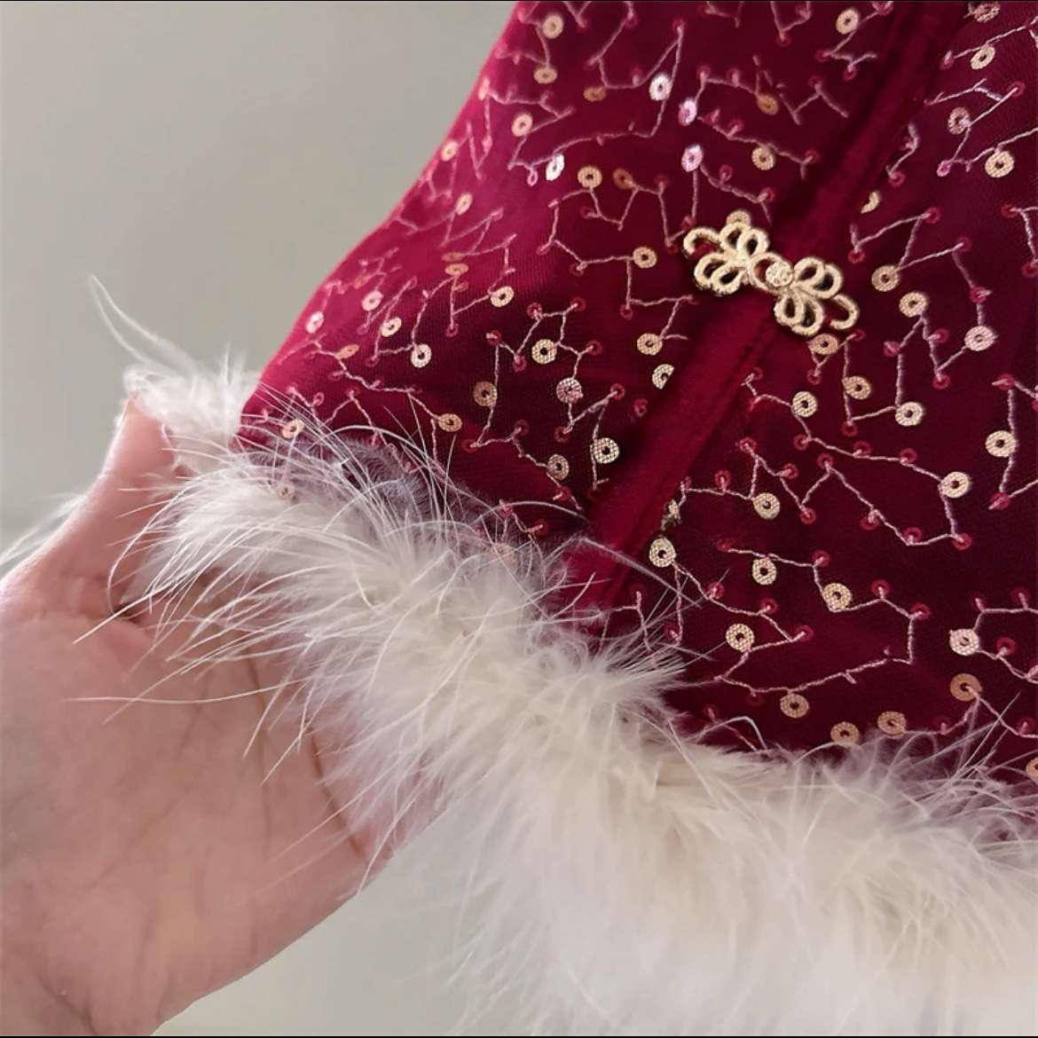 2024 년 신소녀 청삼 원피스 기모 서양식 겨울 원피스 아기 원피스 어린이 붉은 새해 원피스