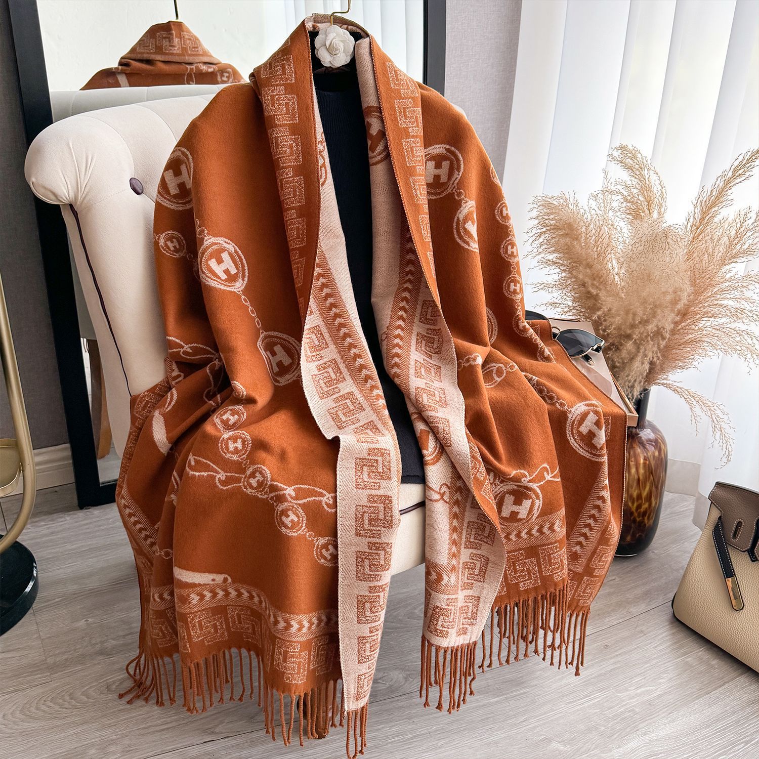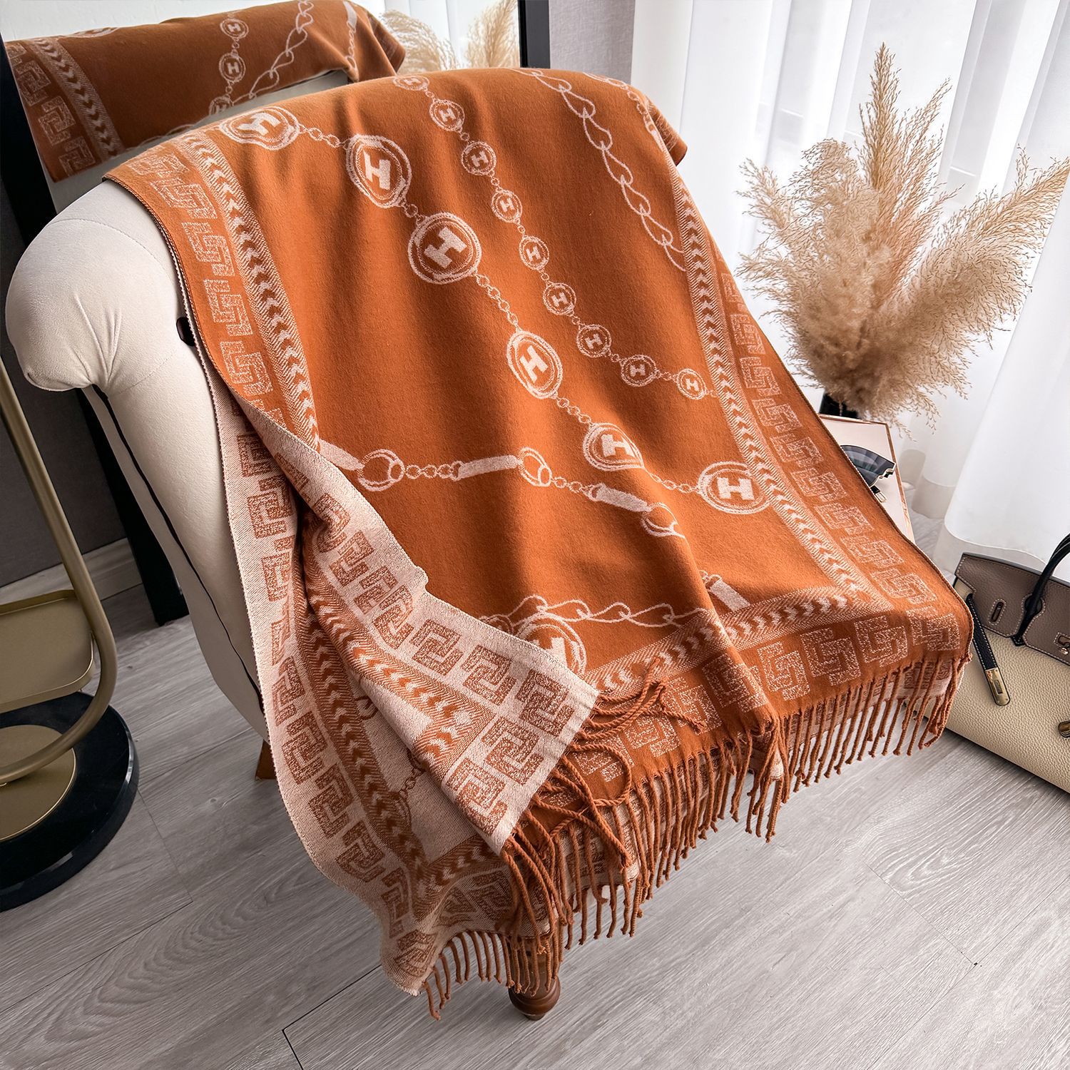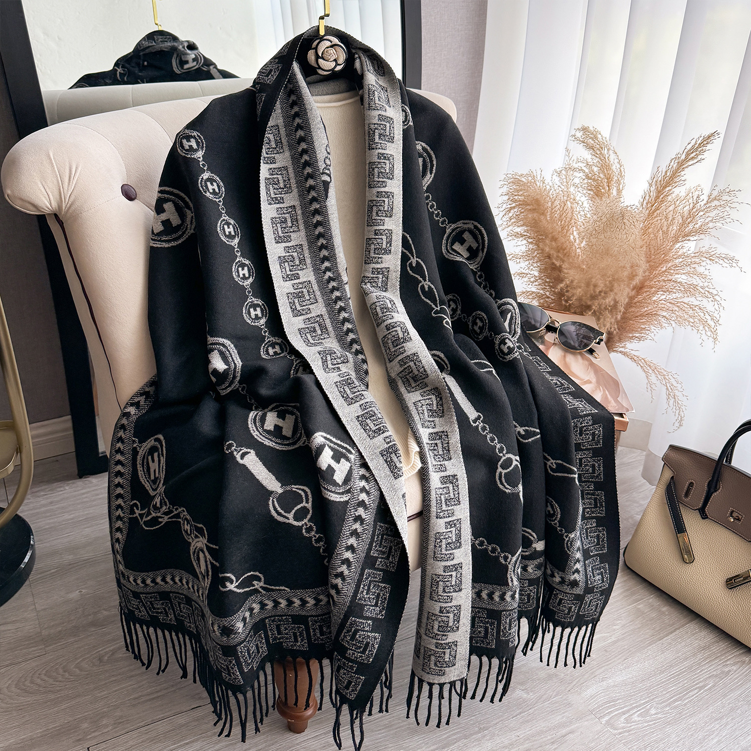 가을과 겨울 패션 새로운 유럽과 미국 스타일의 문자 체인 다재다능한 따뜻한 캐시미어 여성의 높은 수준의 양면 스카프스토어 가기