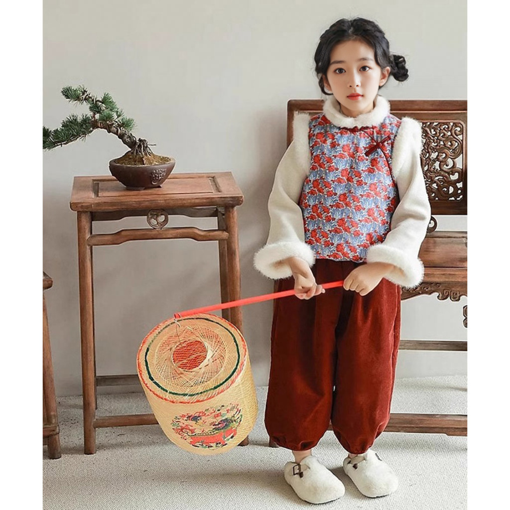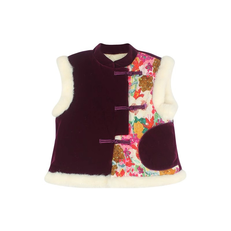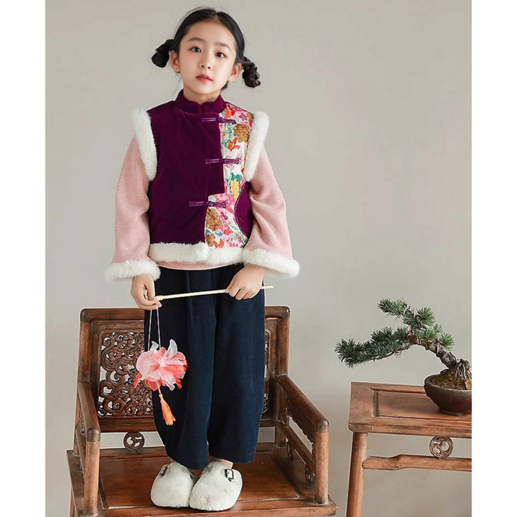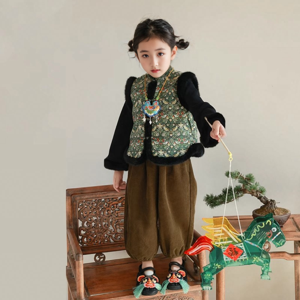 여아용 새해 3종 세트 2026 겨울 신상 아동용 플러시 치파오 조끼 플러시 이너 셔츠 바지 세트