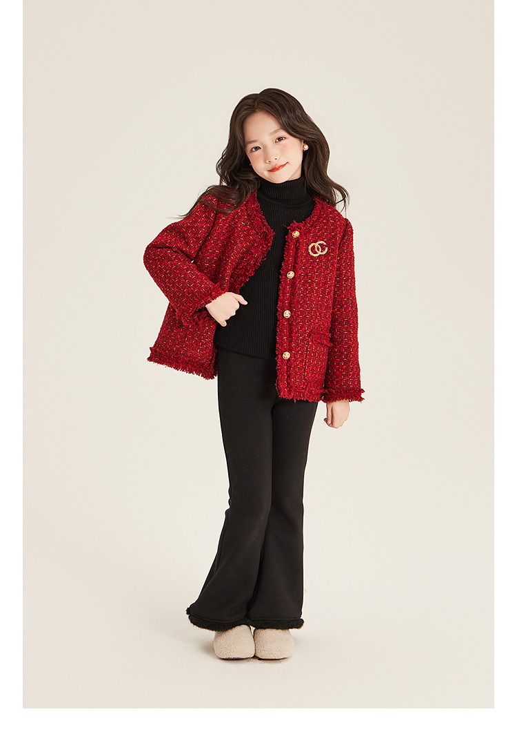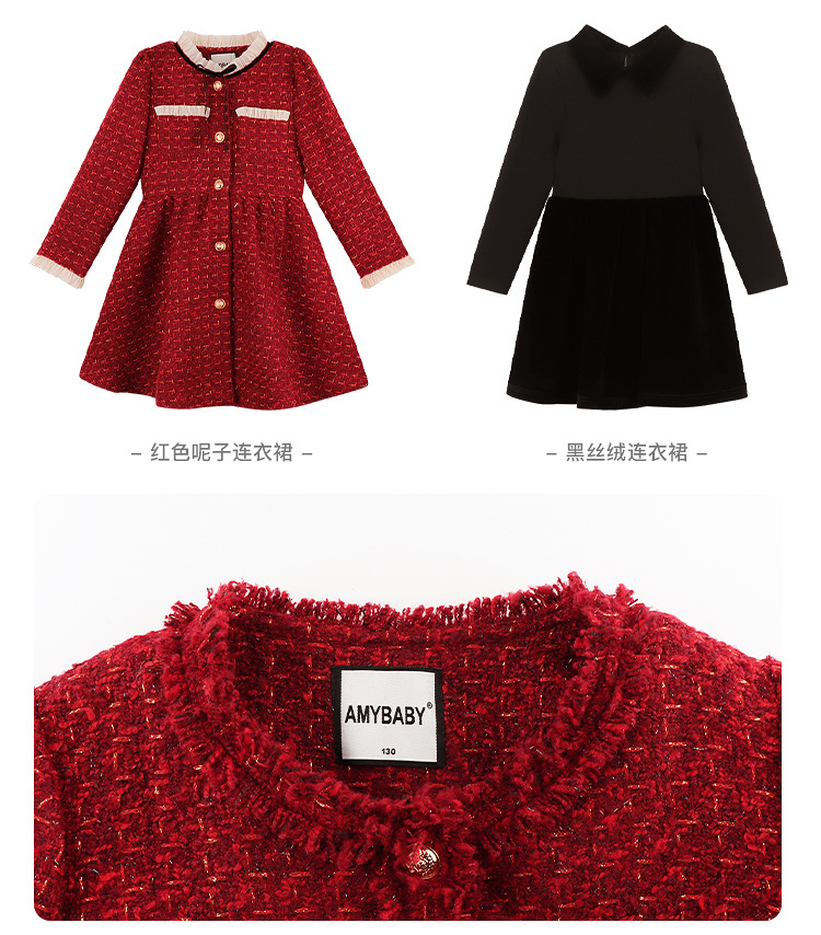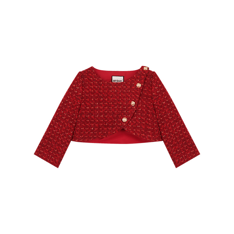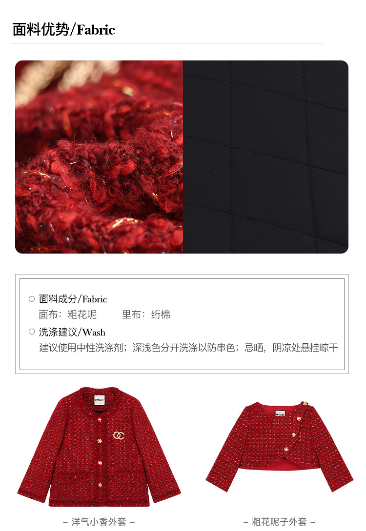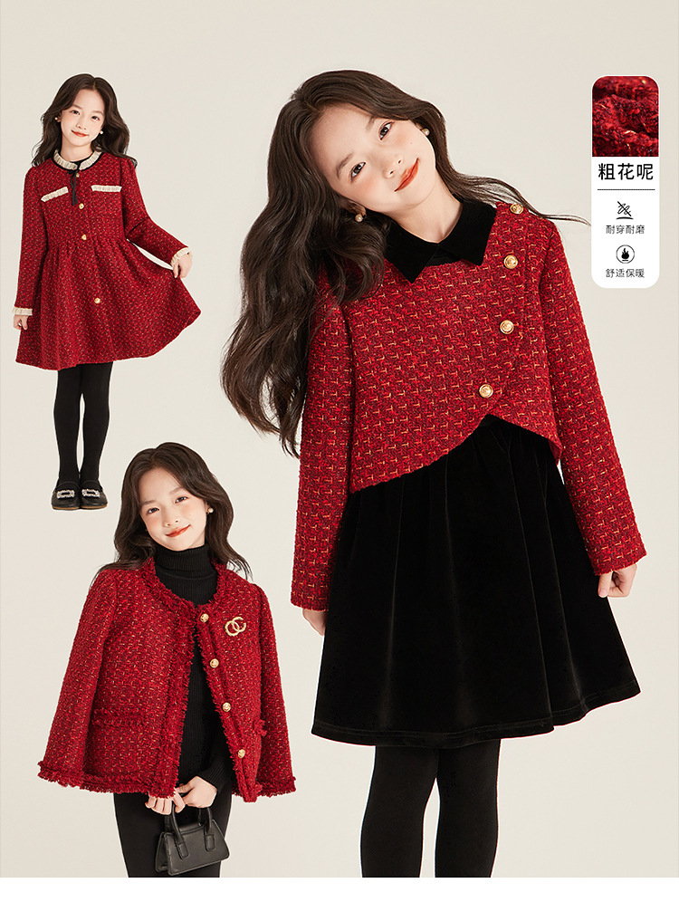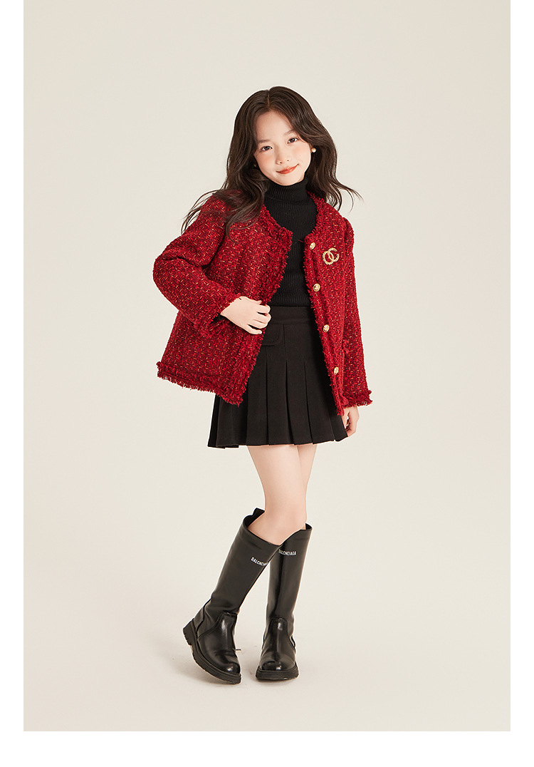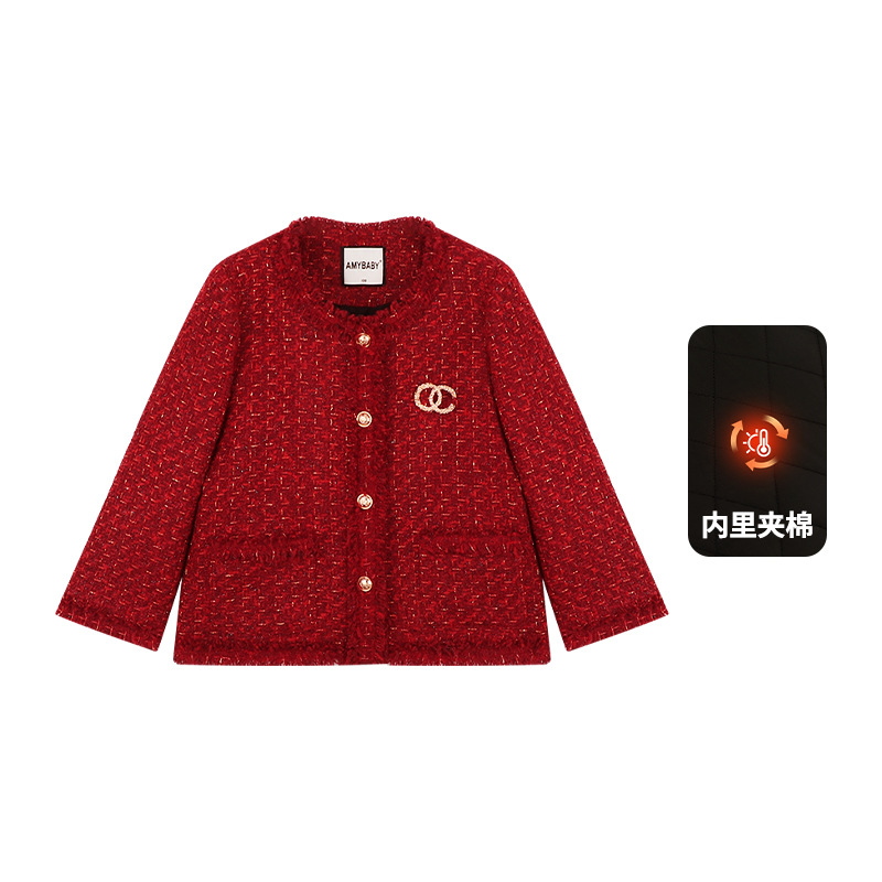 Amybaby Girls 세트 겨울 2024 새로운 레드 샤넬 고급 원피스 울 코튼 재킷스토어 가기
