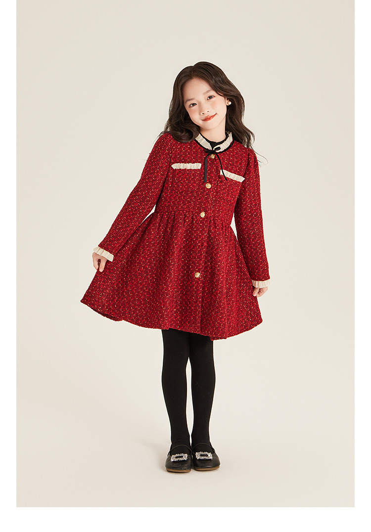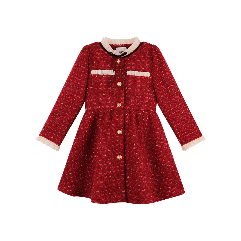 Amybaby Girls 세트 겨울 2024 새로운 레드 샤넬 고급 원피스 울 코튼 재킷
