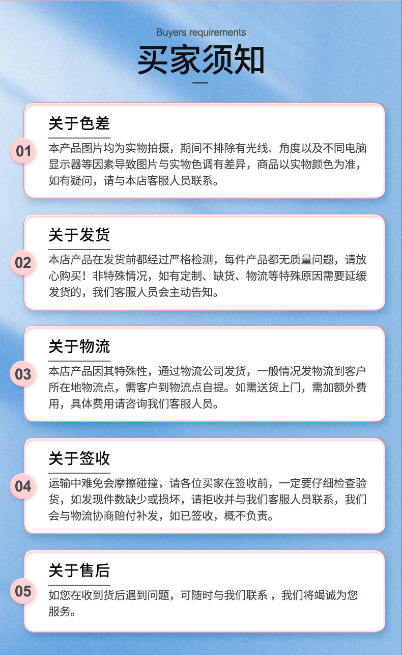 定制产品一旦样品确认,不接受任何形式任何情况的退货退款,定制产品都是不能二次销售的 ,所以需要定制好的样式一经确认概不修改,完美主义者慎拍!