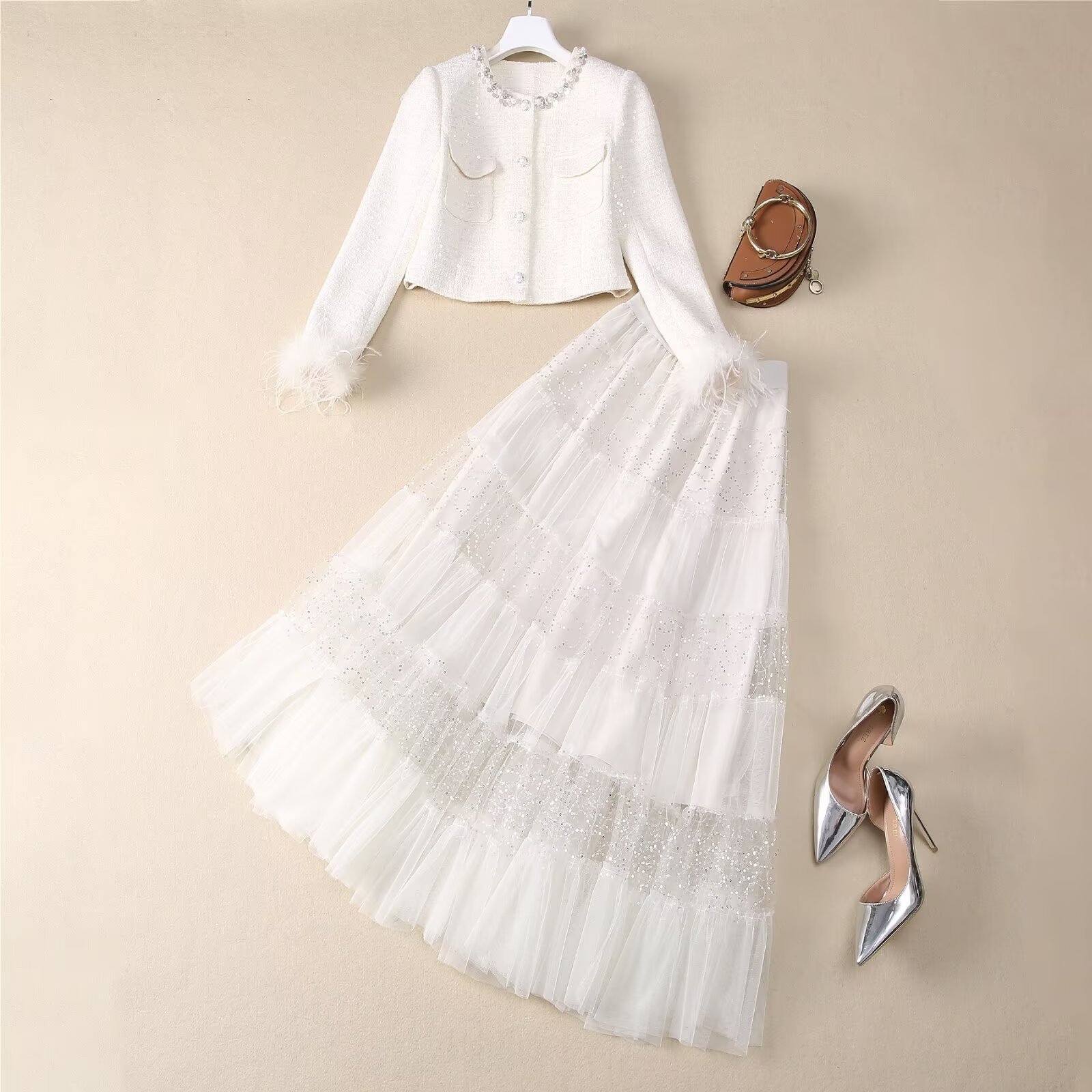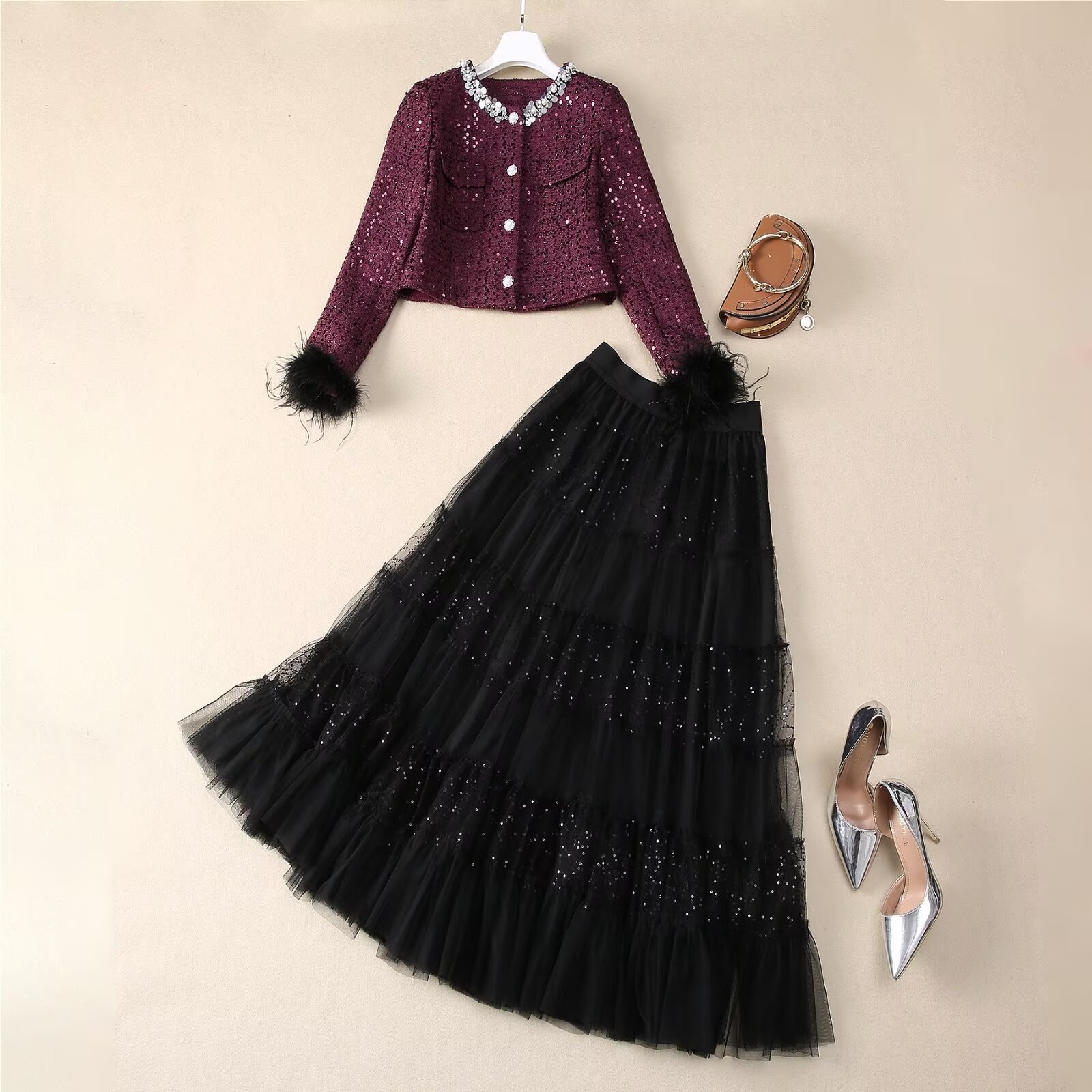 프랑스 2025 가을과 겨울 새로운 여성 승무원 긴 소매 트위드 코트 메쉬 자수 Sequin 오버 스커트 세트