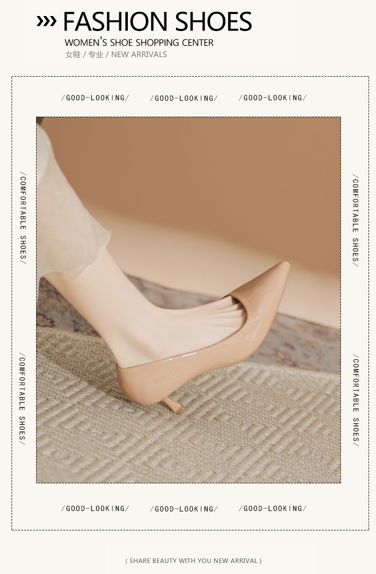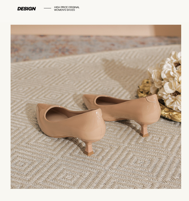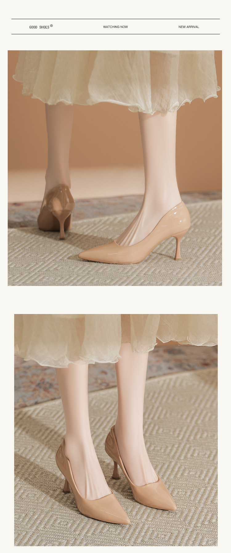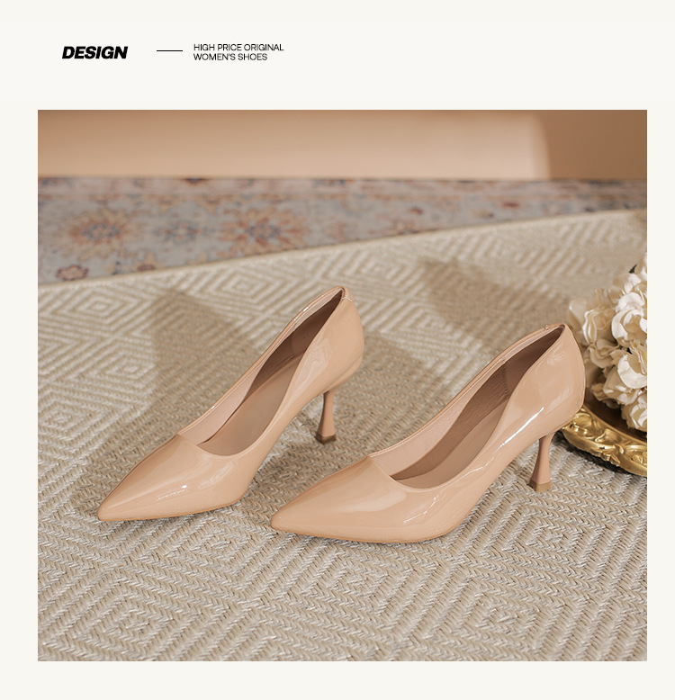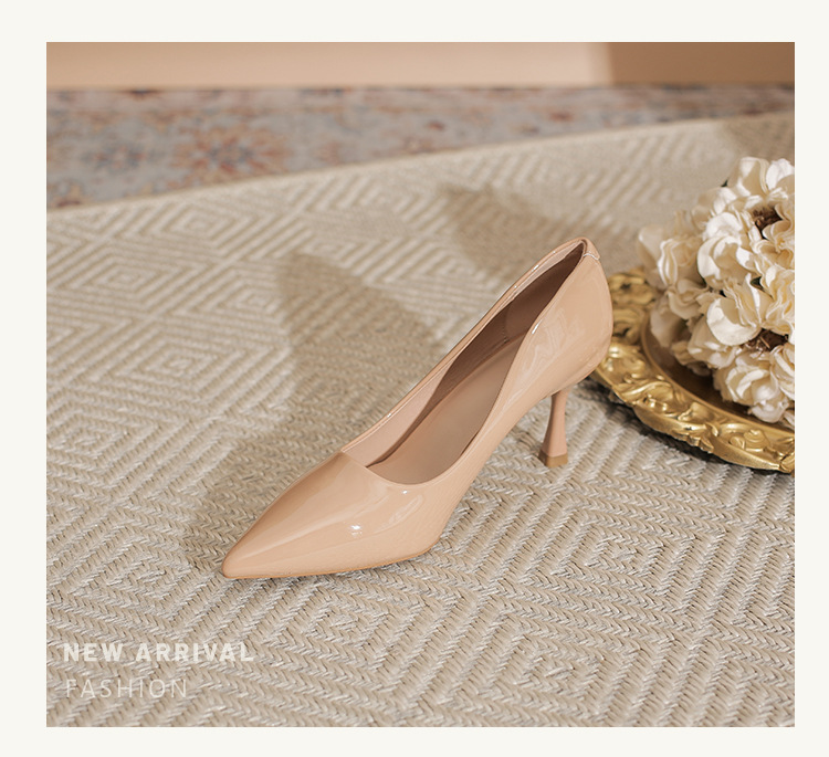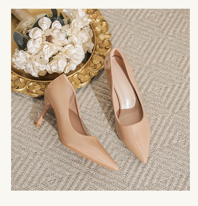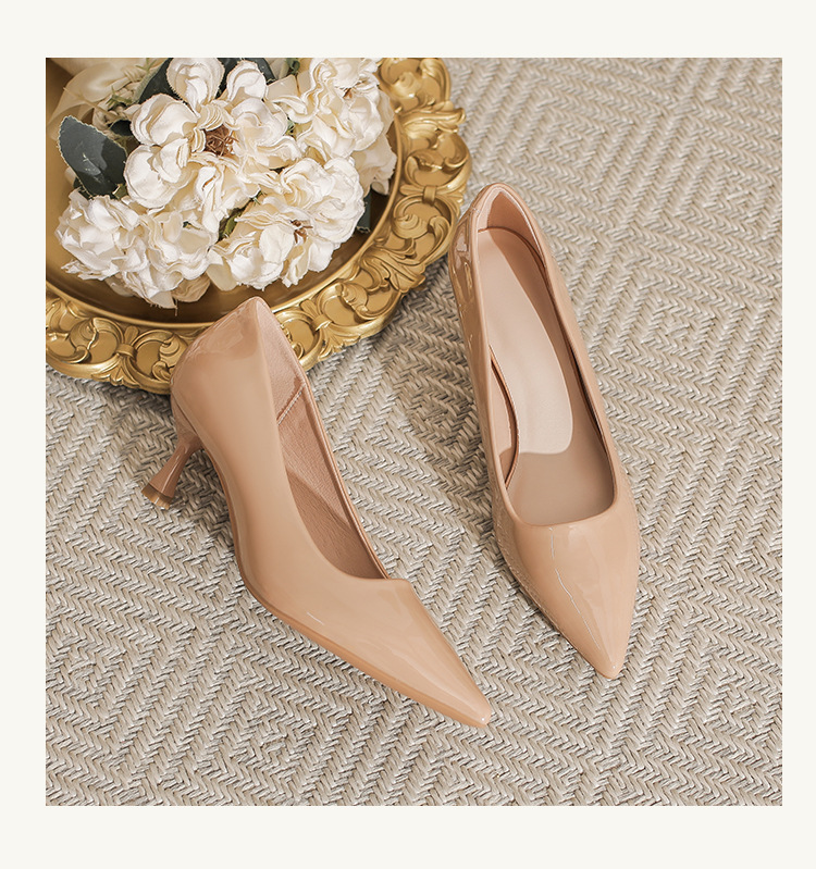 여성용 730-3 순수한 섹시 누드 컬러 하이힐 2025 새로운 스타일 프렌치 스타일 얕은 입 얇은 굽 페이턴트 가죽 뾰족한 발가락 신발스토어 가기