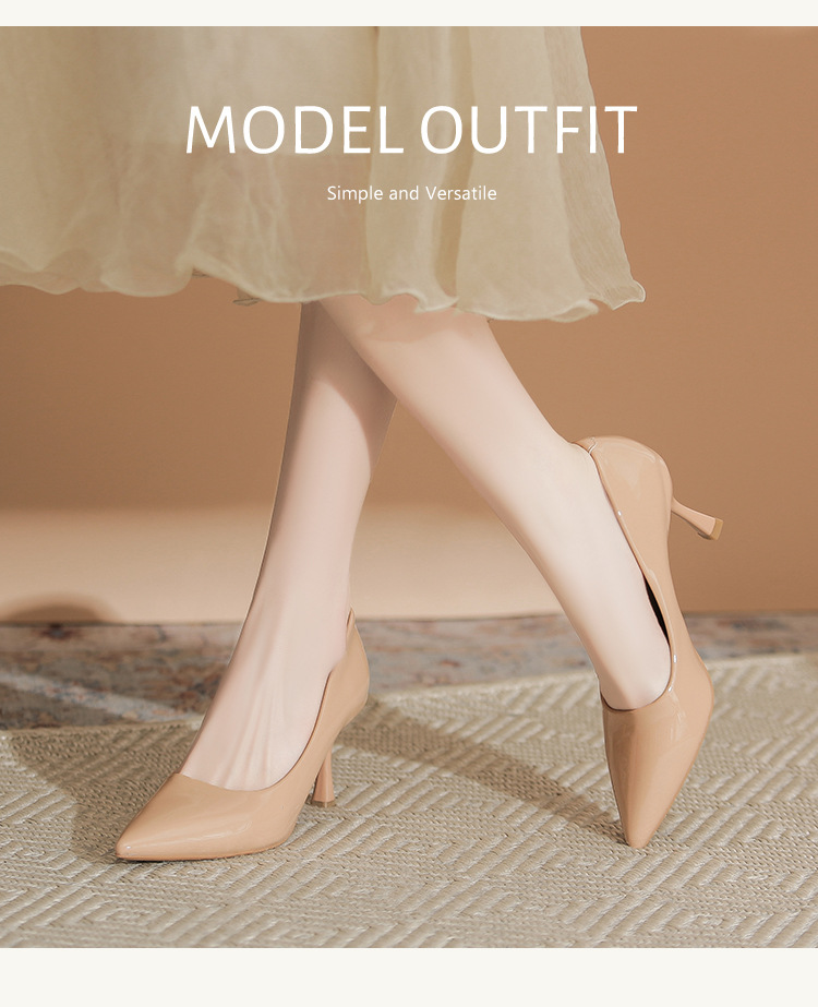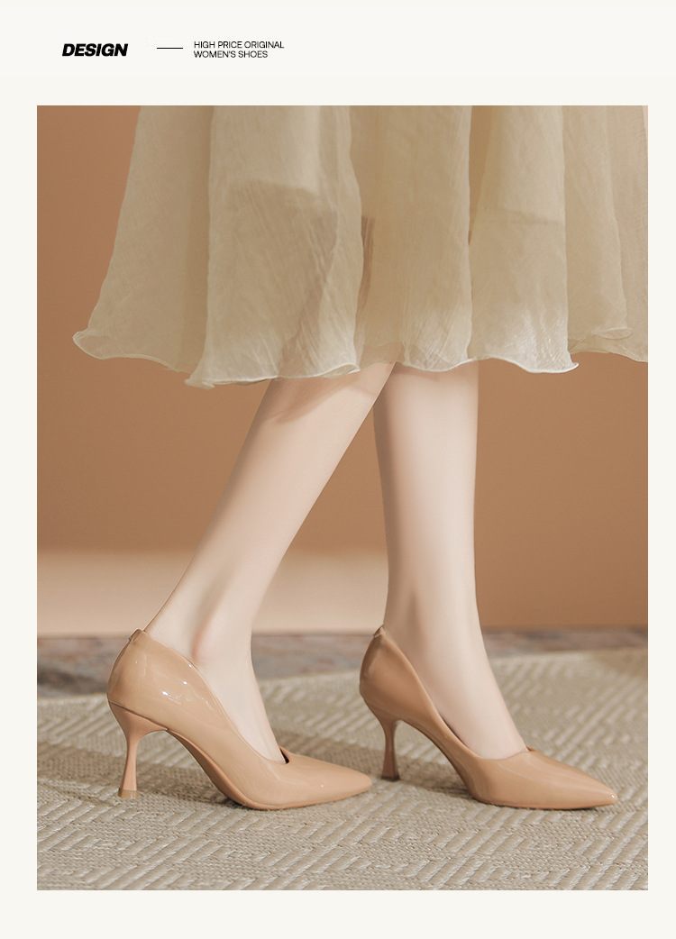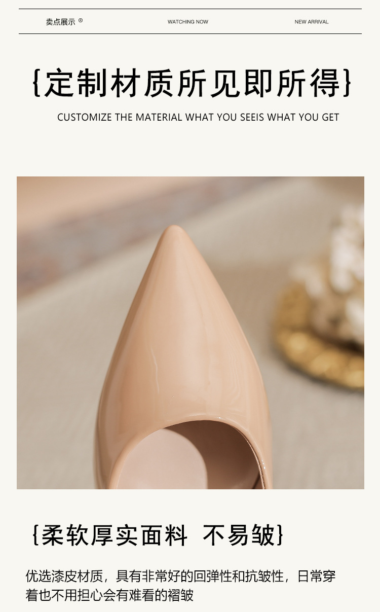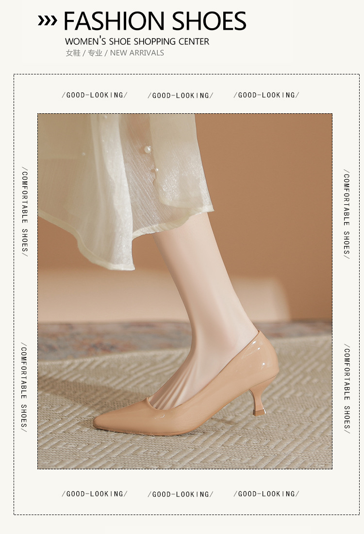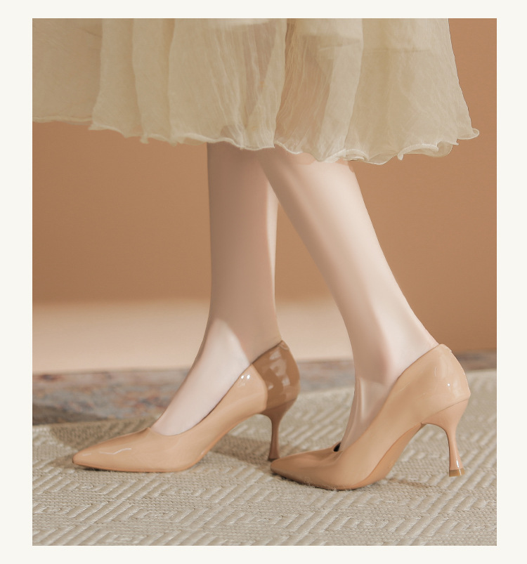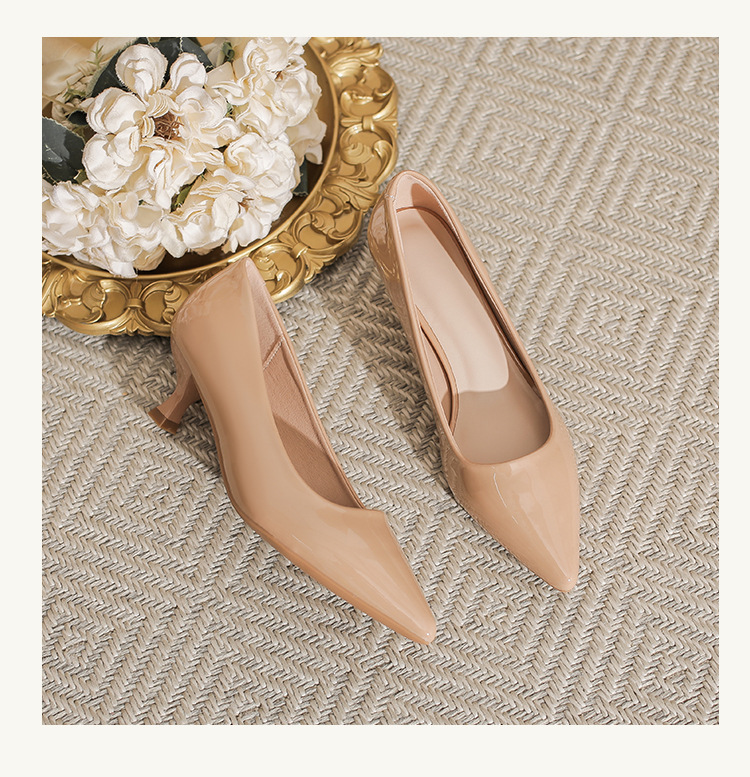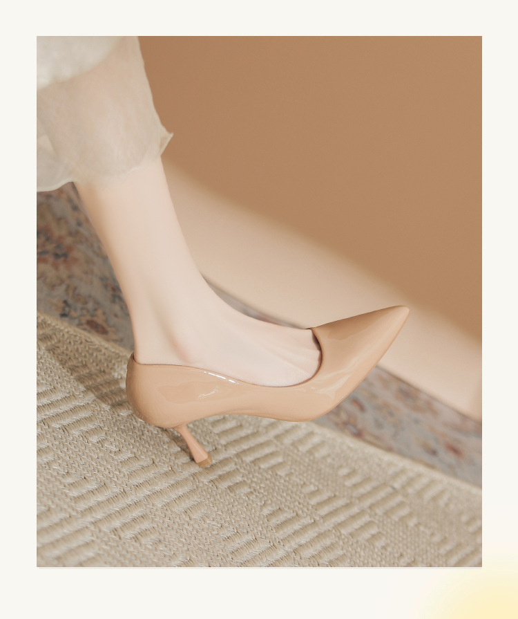 여성용 730-3 순수한 섹시 누드 컬러 하이힐 2025 새로운 스타일 프렌치 스타일 얕은 입 얇은 굽 페이턴트 가죽 뾰족한 발가락 신발스토어 가기