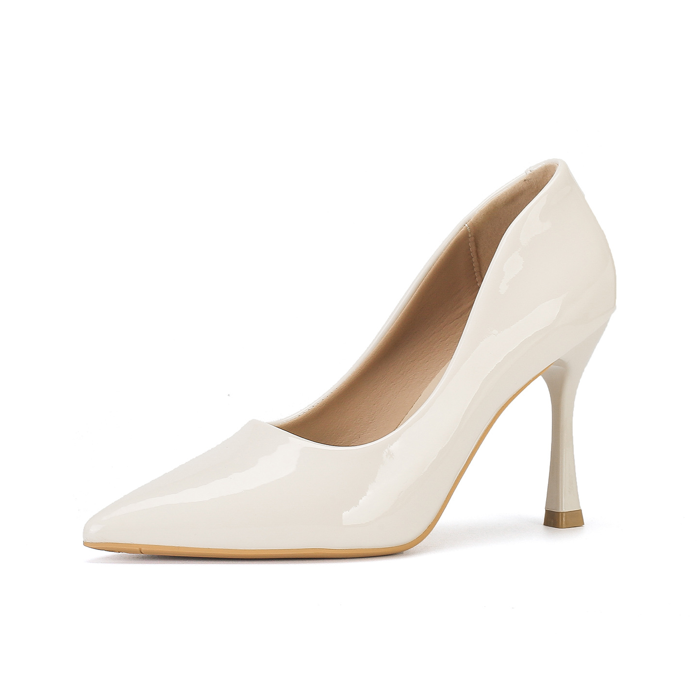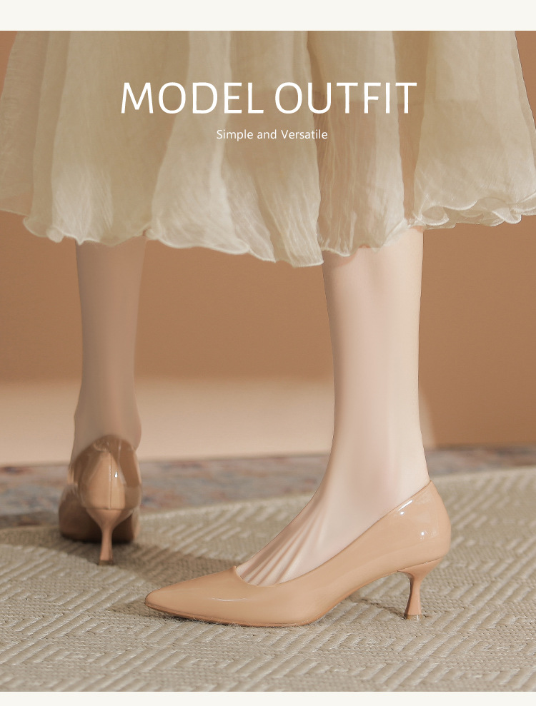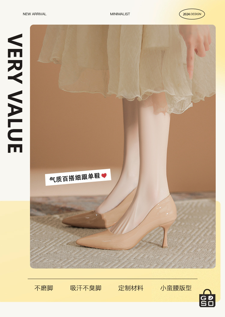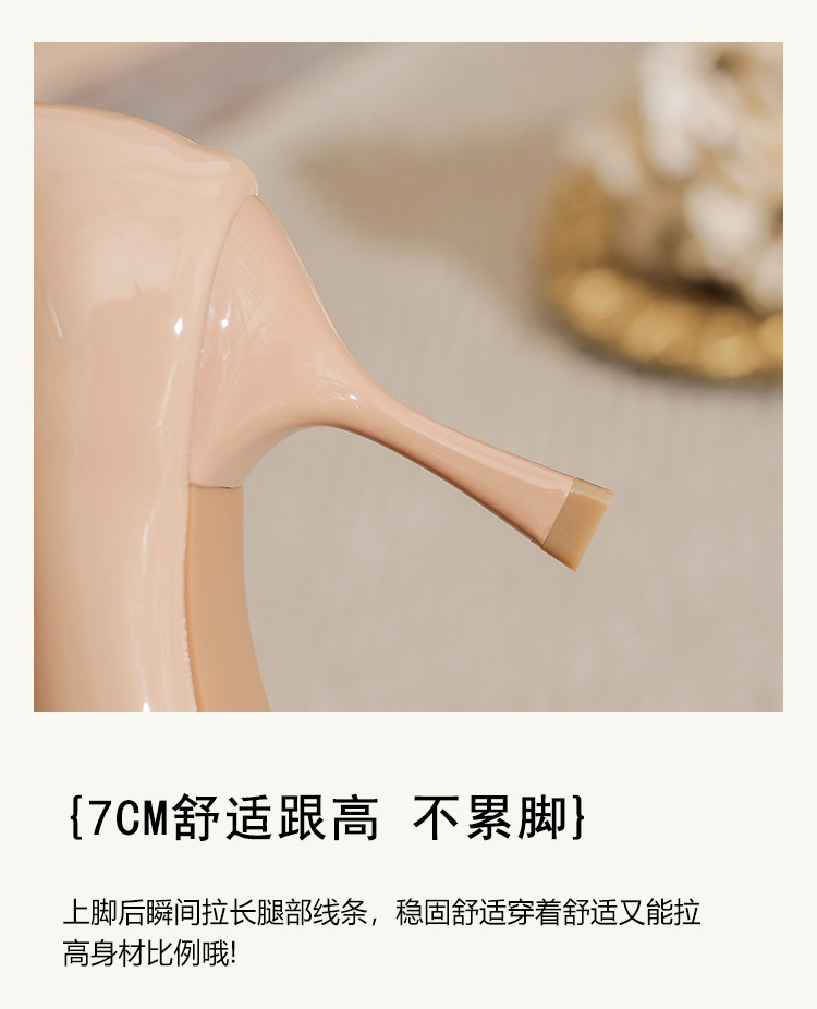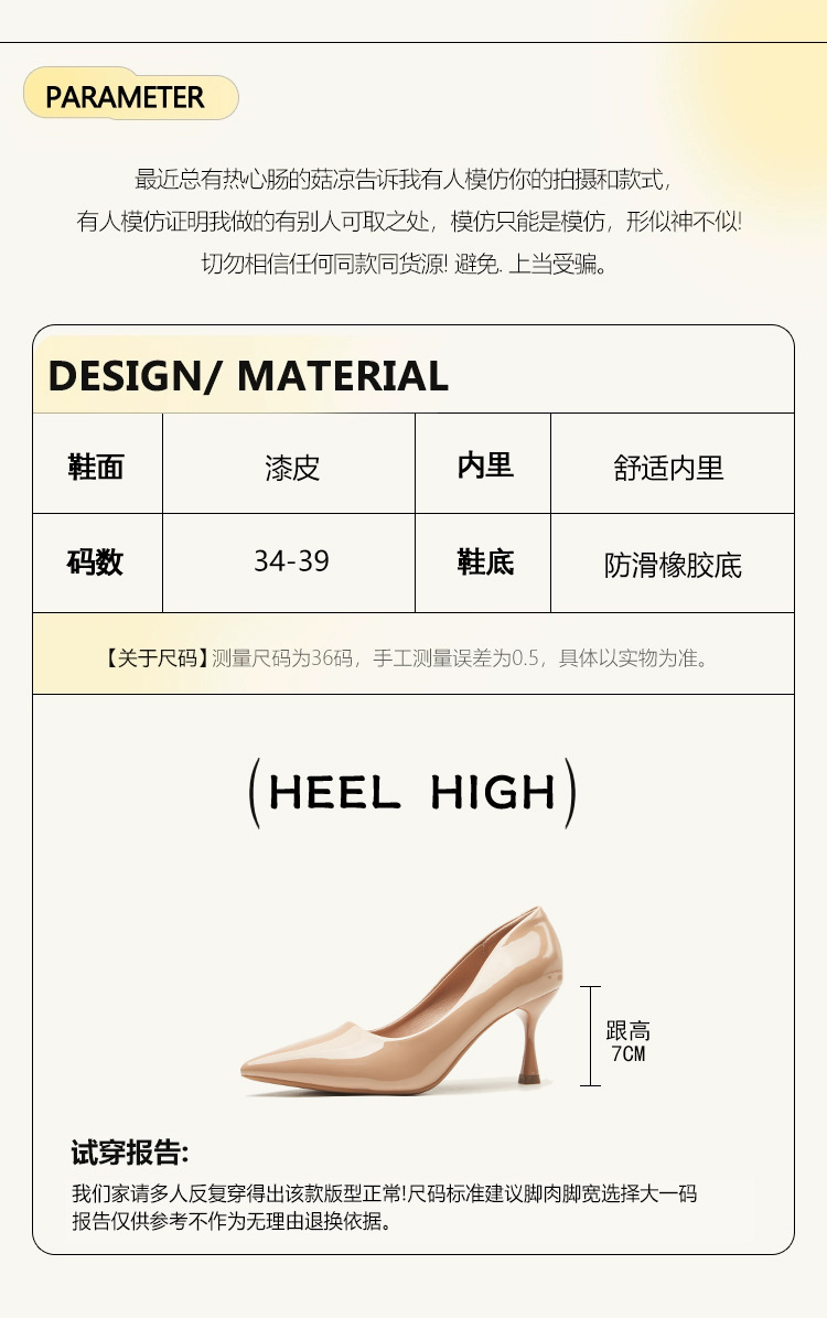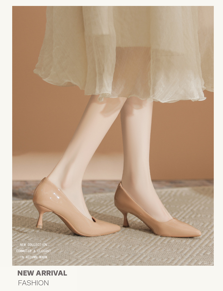 여성용 730-3 순수한 섹시 누드 컬러 하이힐 2025 새로운 스타일 프렌치 스타일 얕은 입 얇은 굽 페이턴트 가죽 뾰족한 발가락 신발스토어 가기
