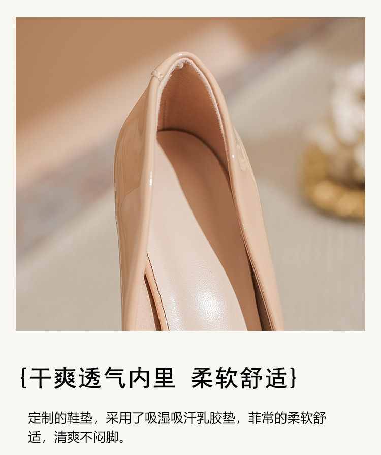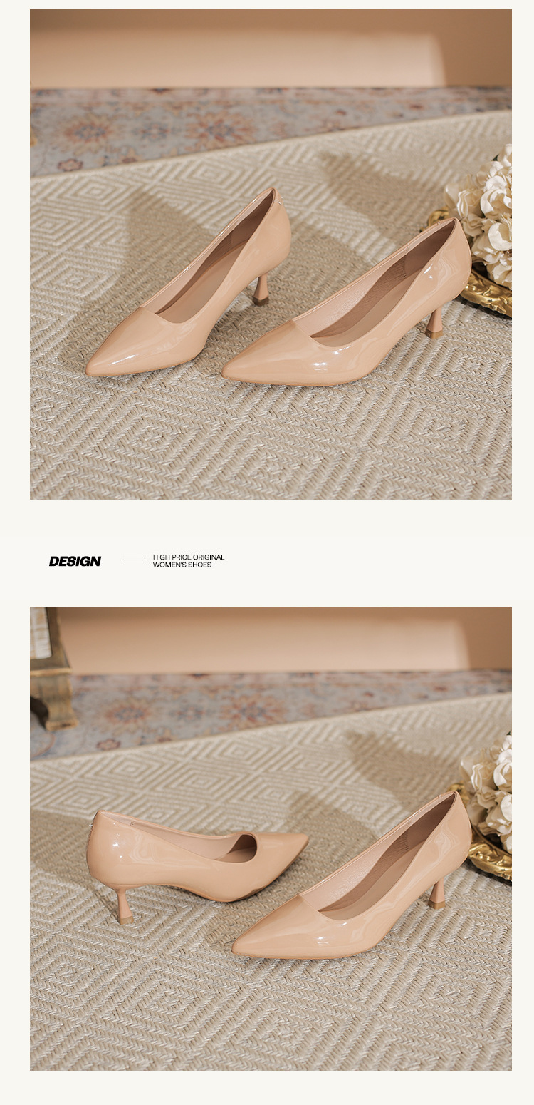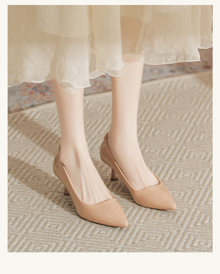 여성용 730-3 순수한 섹시 누드 컬러 하이힐 2025 새로운 스타일 프렌치 스타일 얕은 입 얇은 굽 페이턴트 가죽 뾰족한 발가락 신발