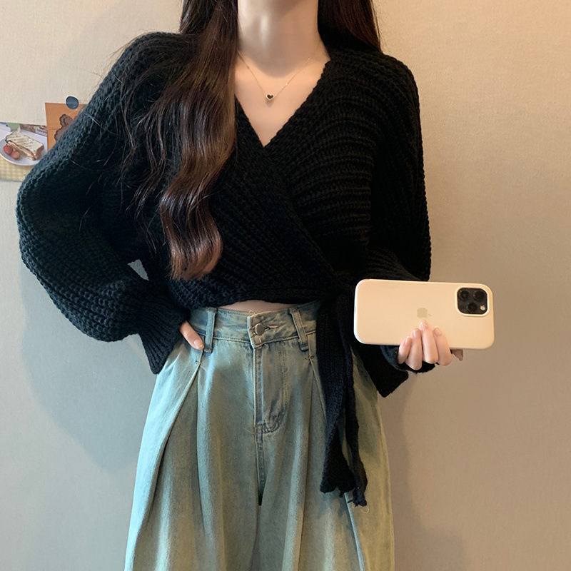 게으른 스타일 V 넥 크로스 오버 스웨터 여성의 가을 새로운 디자인 감각 느슨한 허리 우아한 긴팔 탑스토어 가기
