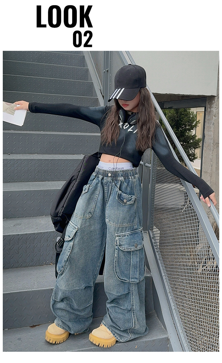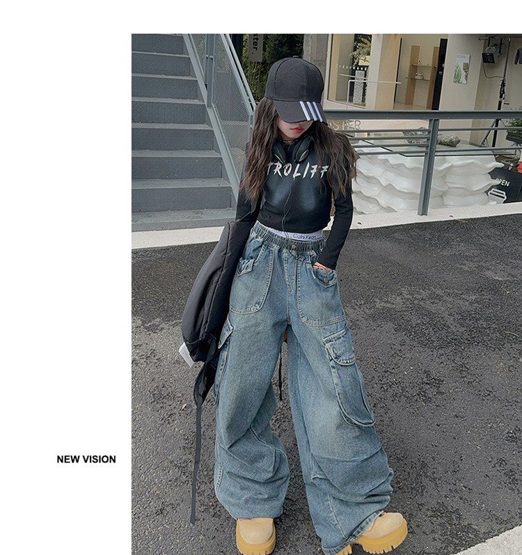 대외 무역 도매 2024 새로운 소녀 큰 포켓 청바지 작업 넓은 다리 바지 큰 어린이 캐주얼 바지