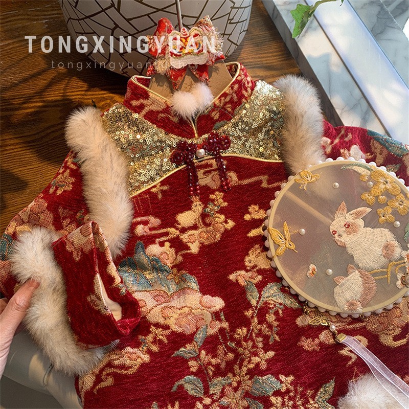 텅싱위안여아 신년 원피스 2025 년 새 겨울 원피스 아기소녀 국가스타일 청삼 한후 공주 원피스
