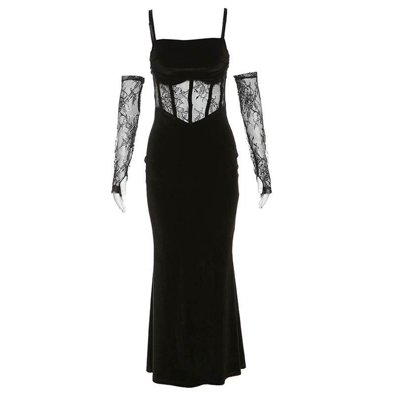 유럽과 미국 스타일 2024 겨울 새로운 여성의 단색 중공 레이스 스트랩 엉덩이 원피스 원피스 소매 세트
