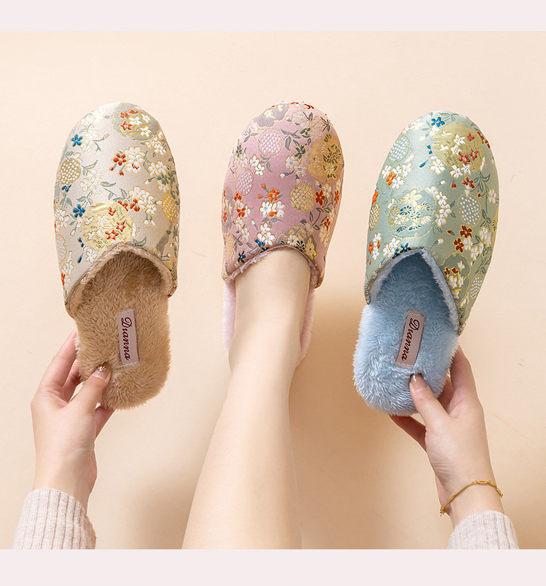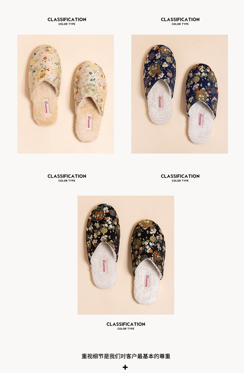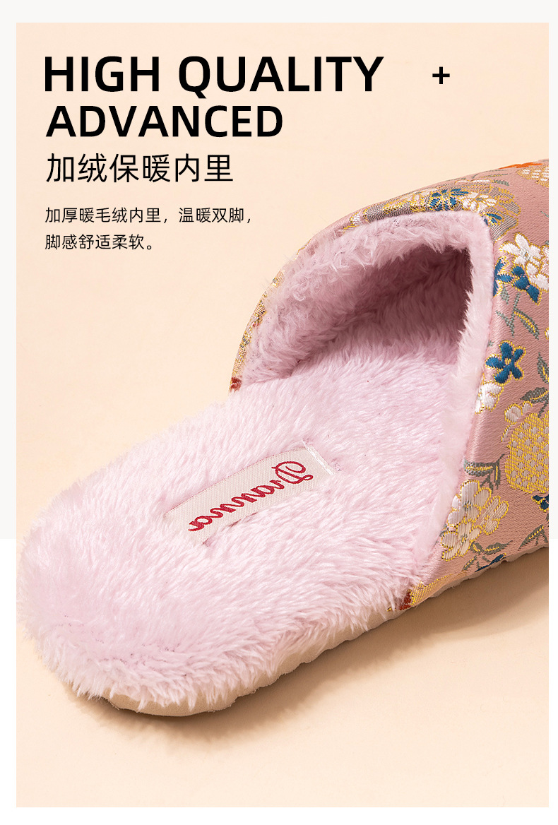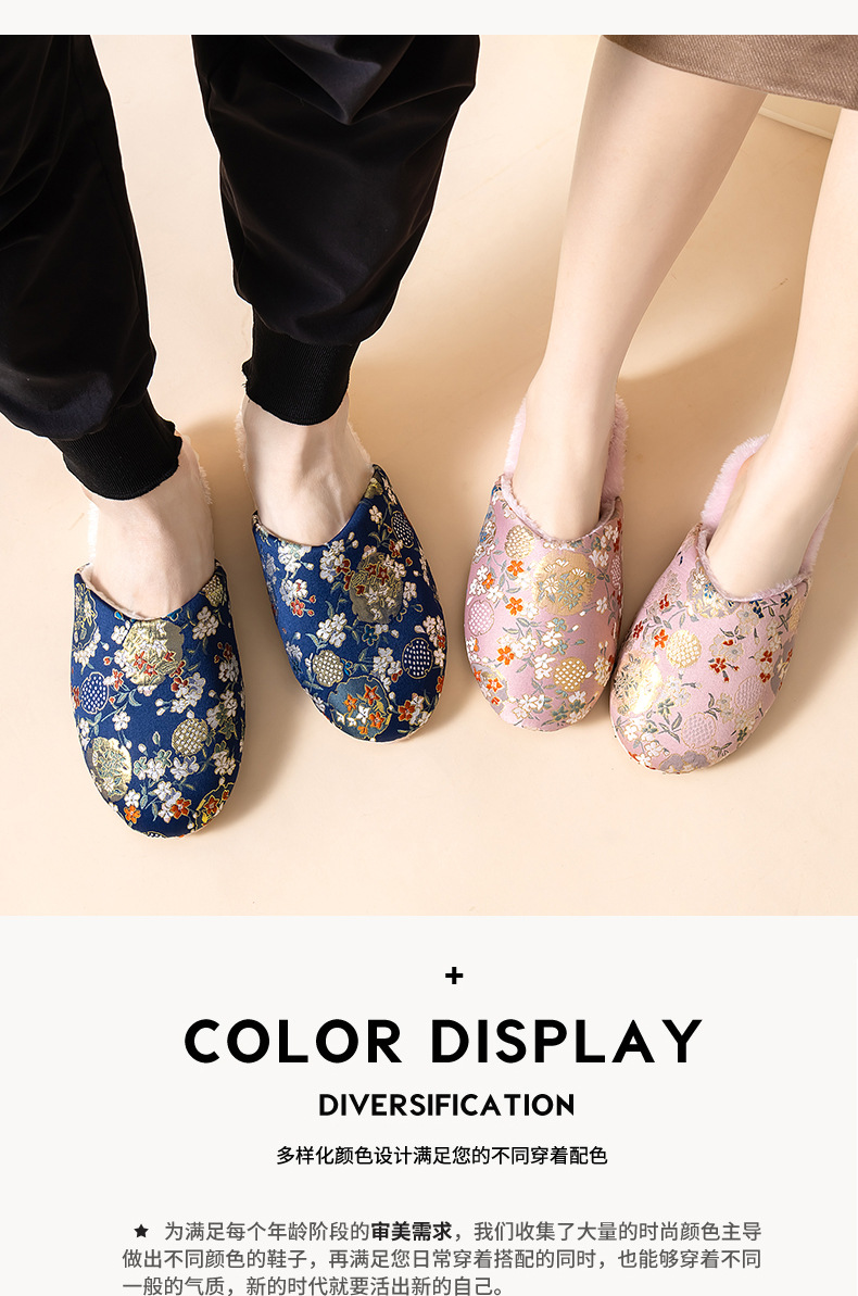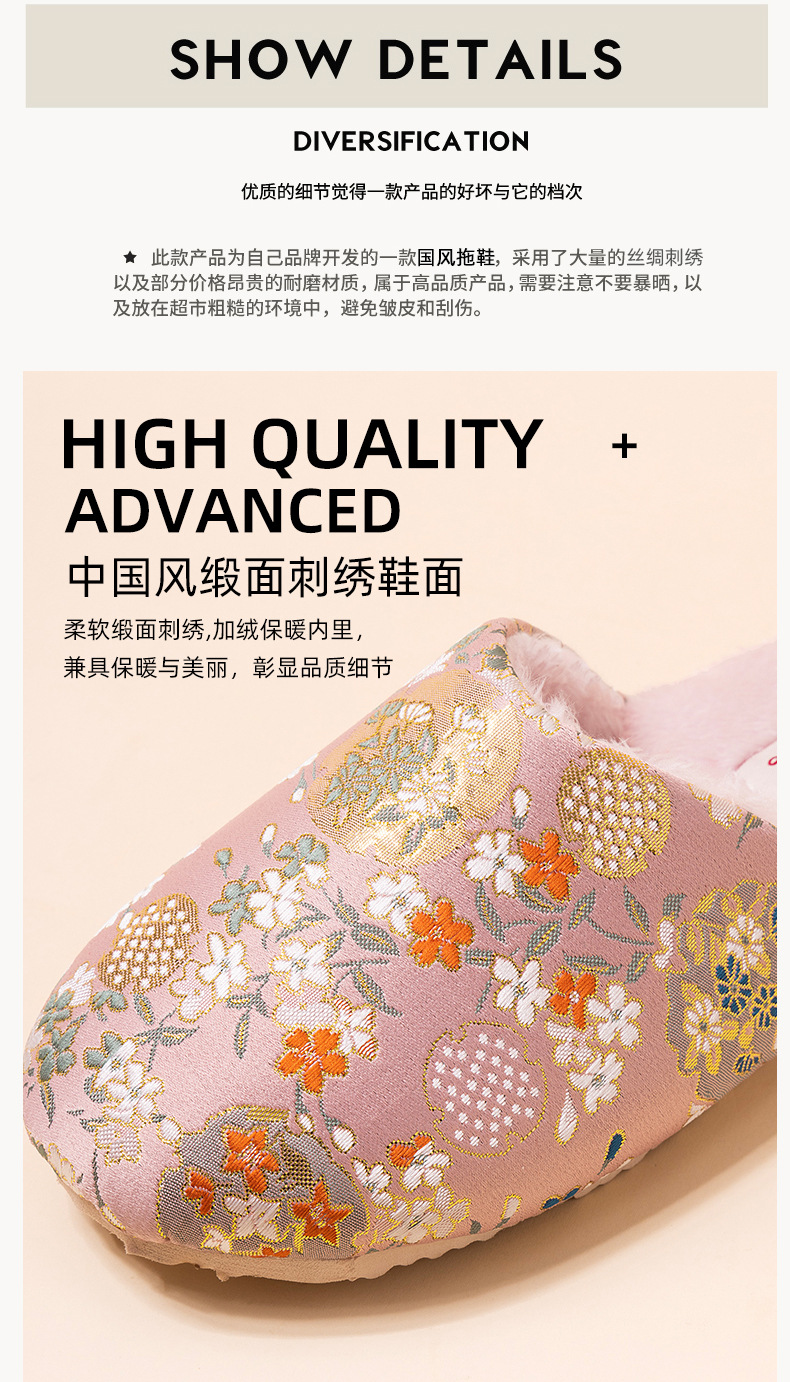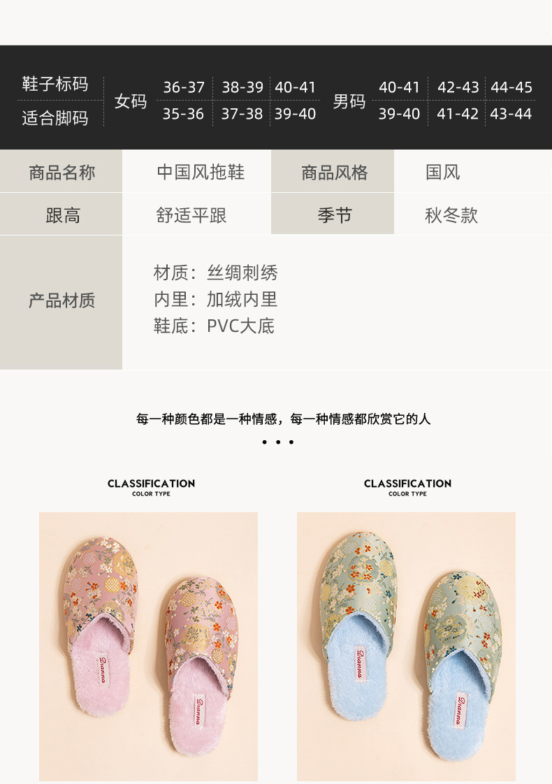 커플 가을과 겨울 새틴 국가 스타일 자수 봉제 슬리퍼 홈 따뜻한 면 슬리퍼 남성과 여성